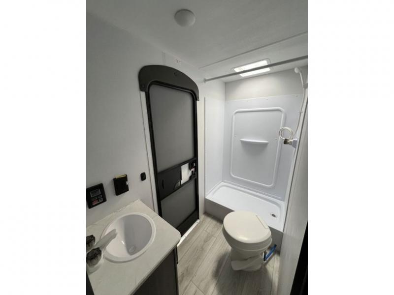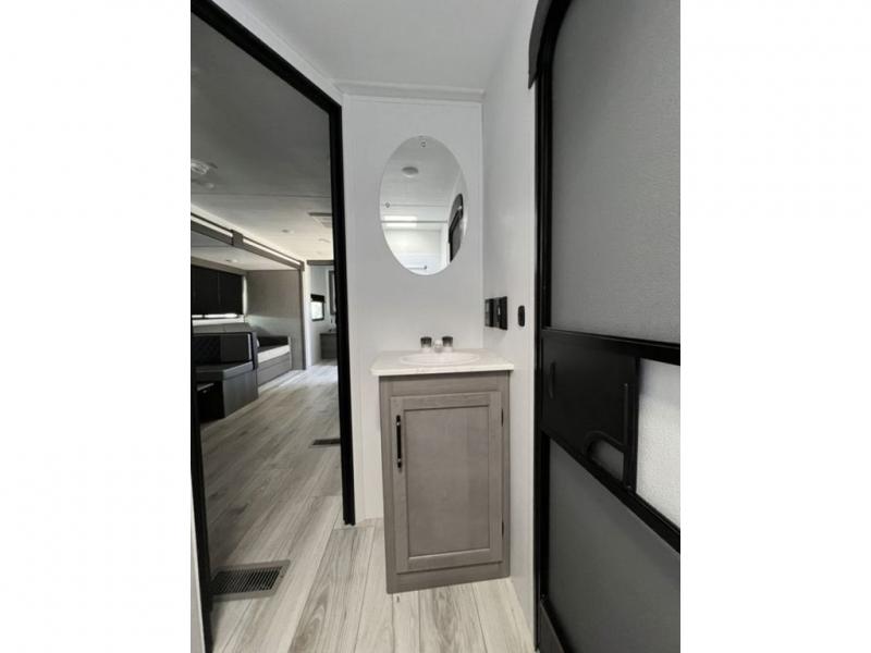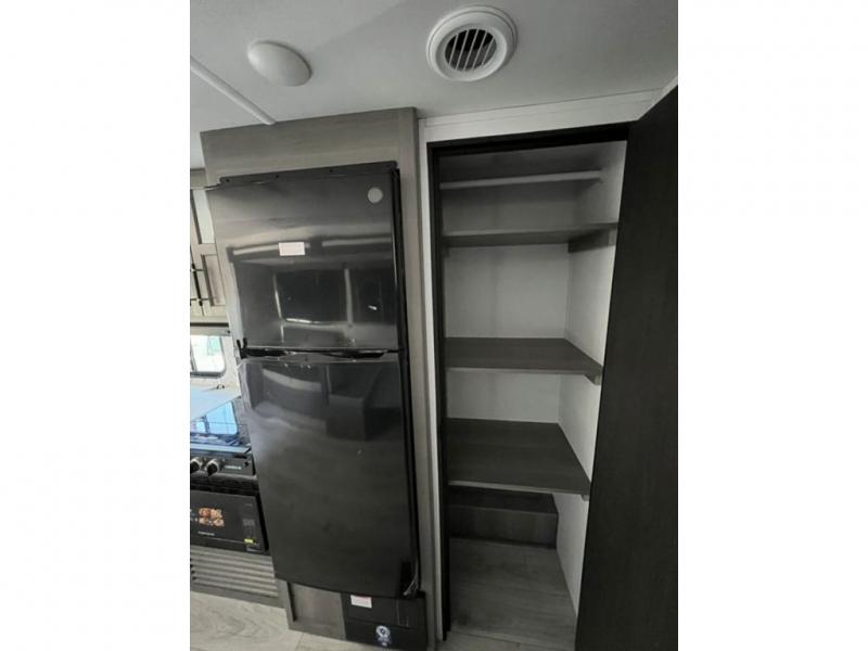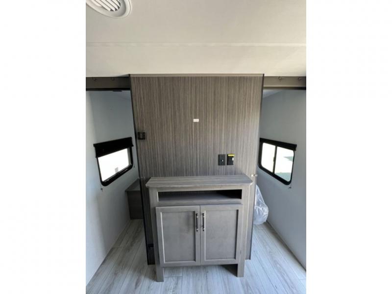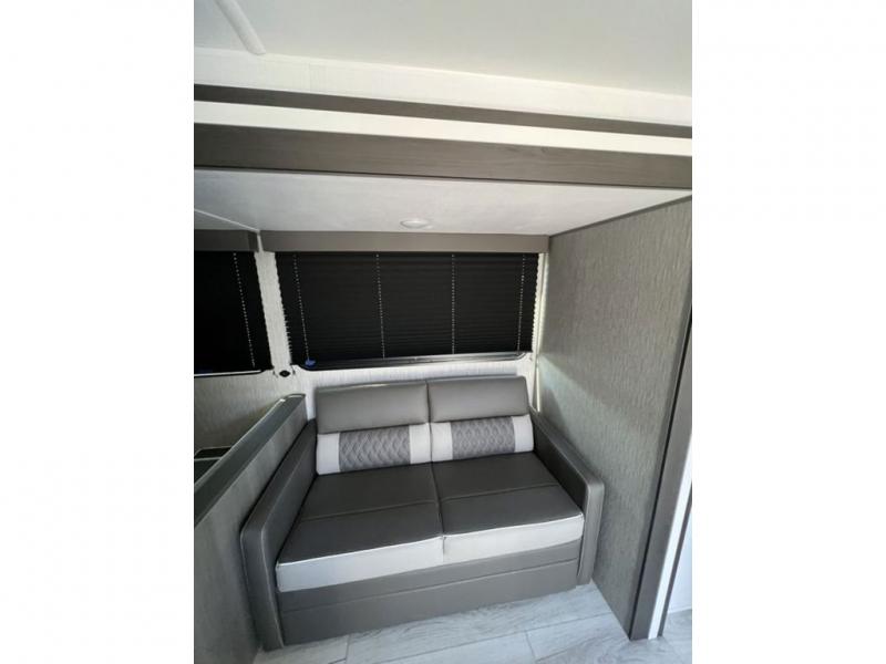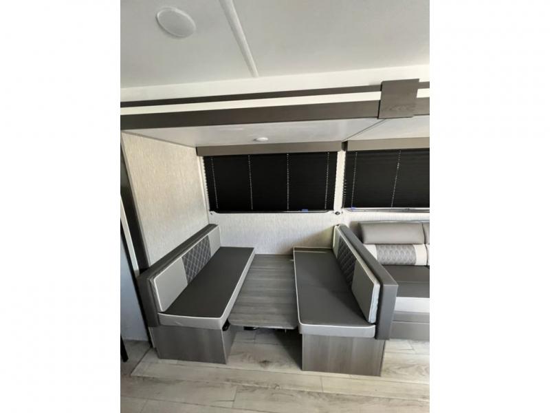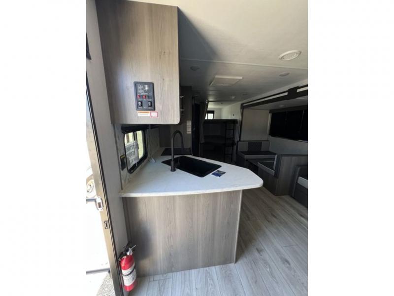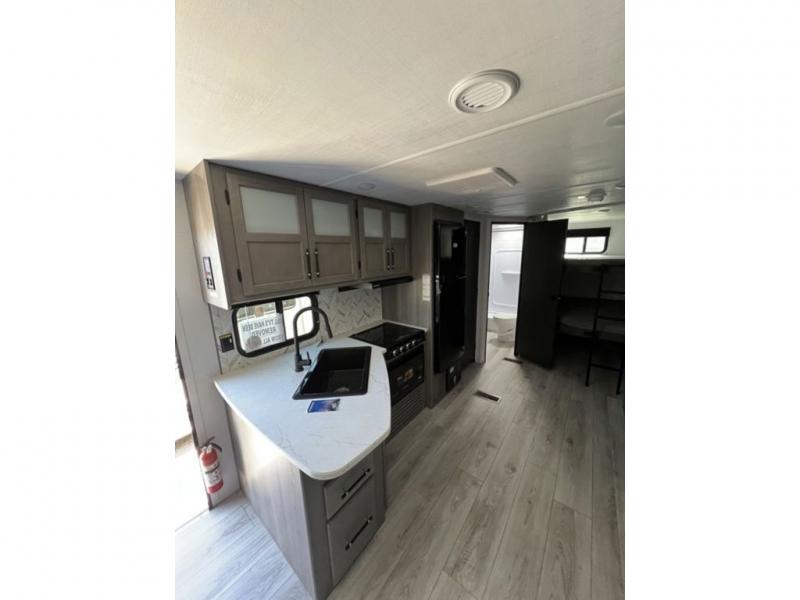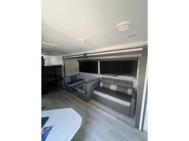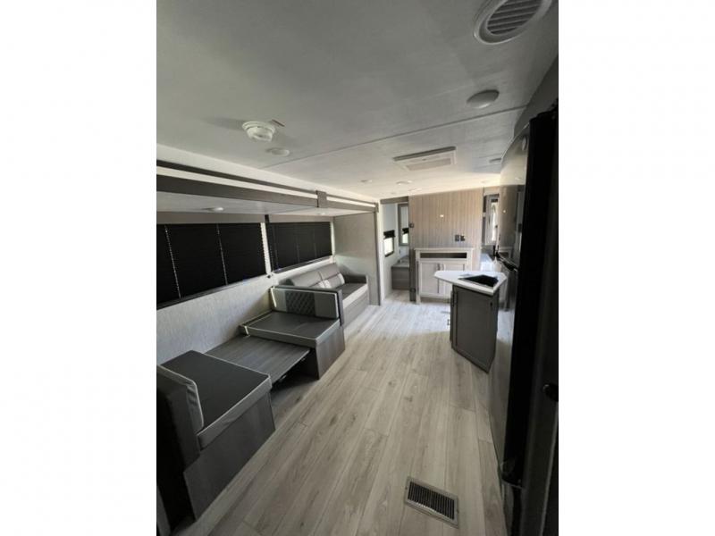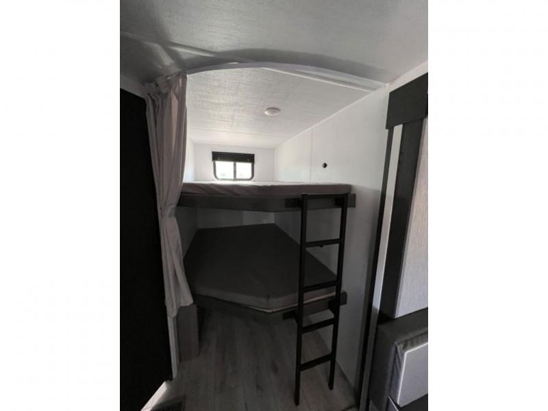 Pack your bags and head for the lake or woods in this spacious trailer! You can comfortably sleep nine to ten with the double-size bunks and the queen bed in the front private bedroom, plus the booth dinette and sofa in the main living area. There is even TV prep here if you want to add a television to the entertainment center for movie nights. The kitchen includes a 10 cu. ft. 12V refrigerator and an extra large pantry for food storage, plus a cooktop to prepare meals each day. The full bath included will let you clean up after a day of exploring outdoors, and you'll find the second entry door here for convenience!
