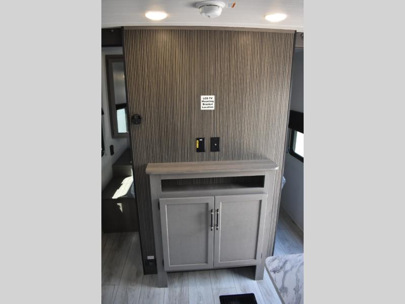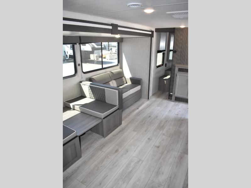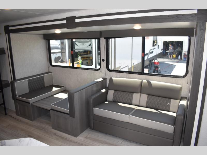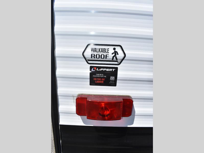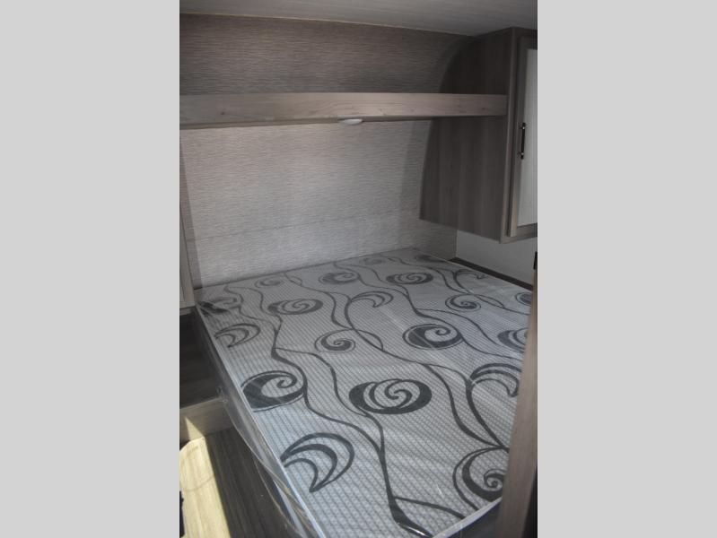 Pack your bags and head for the lake or woods in this spacious trailer! The dual entry doors make it easy to enter or exit this unit. You can comfortably sleep nine to ten with the bunks beds and the queen bed in the front private bedroom, plus the booth dinette and sofa in the main living area. There is even TV prep here if you want to add a television to the entertainment center for movie nights. The kitchen includes a 10 cu. ft. 12V refrigerator and an extra large pantry for food storage, plus a cooktop to prepare meals each day. And the full bath included will let you clean up after a day of exploring outdoors!