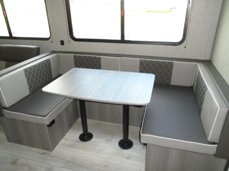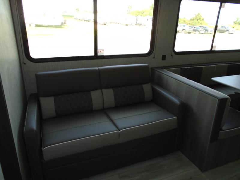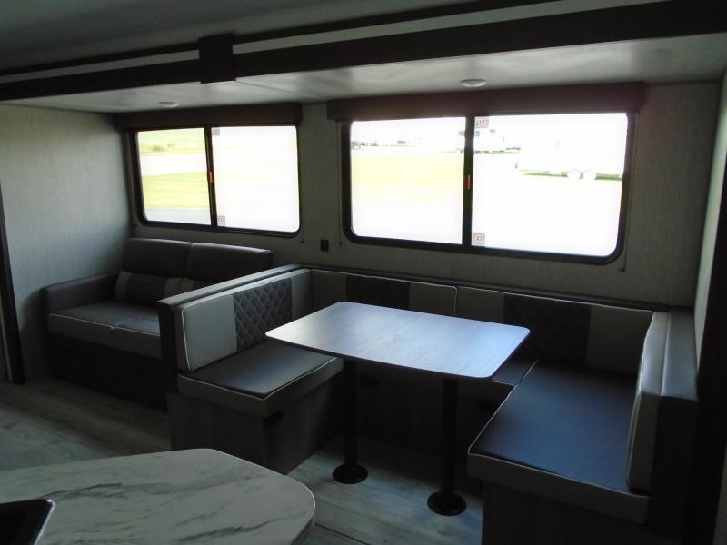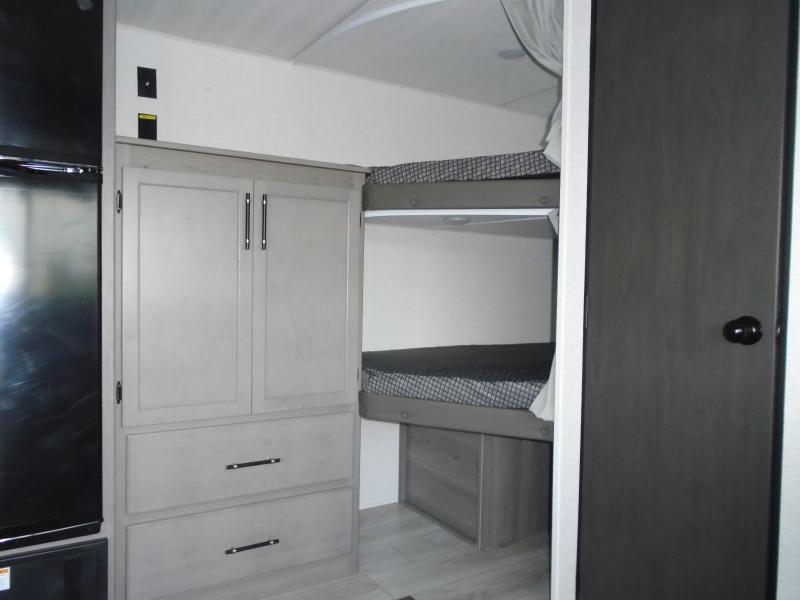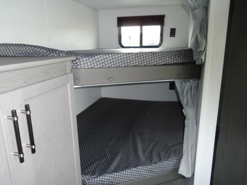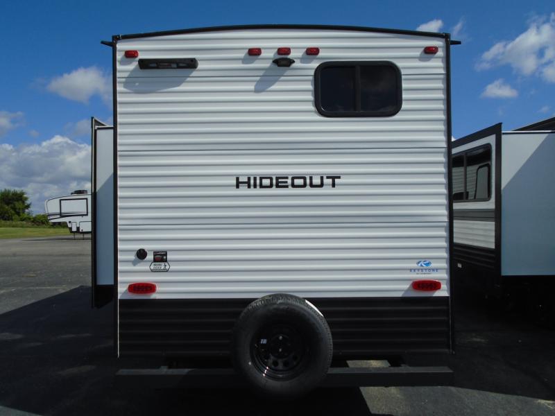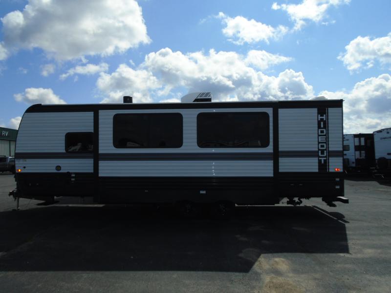 A large slide, front private bedroom, and double-size bunks make this Hideout Sport Double Axle the ultimate travel trailer! You will enjoy a walk-around queen bed in the bedroom plus dual closets and nightstands for your things. The full bath is towards the back and beside the bunks for easy nighttime use, and there is outside storage under the bunks for your gear. Head to the kitchen to prepare lunch on the cooktop, then dine at the U-shaped dinette and sofa within the large slide. If the weather is nice, you might just want to take your plate outdoors to sit under the power awning!