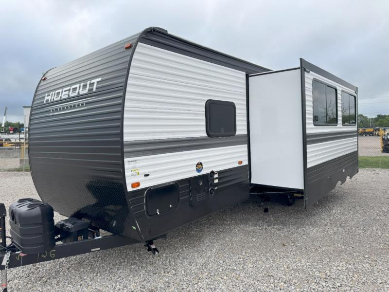 A large slide, front private bedroom, and double-size bunks make this Hideout Sport Double Axle the ultimate travel trailer! You will enjoy a walk-around queen bed in the bedroom plus dual closets and nightstands for your things. The full bath is towards the back and beside the bunks for easy nighttime use, and there is outside storage under the bunks for your gear. Head to the kitchen to prepare lunch on the cooktop, then dine at the U-shaped dinette and sofa within the large slide. If the weather is nice, you might just want to take your plate outdoors to sit under the power awning!