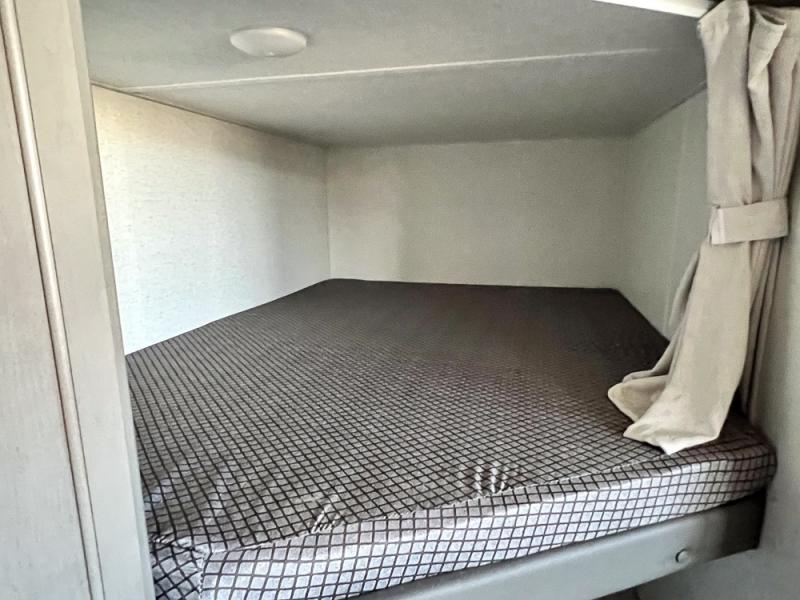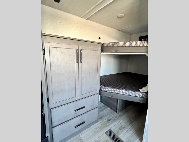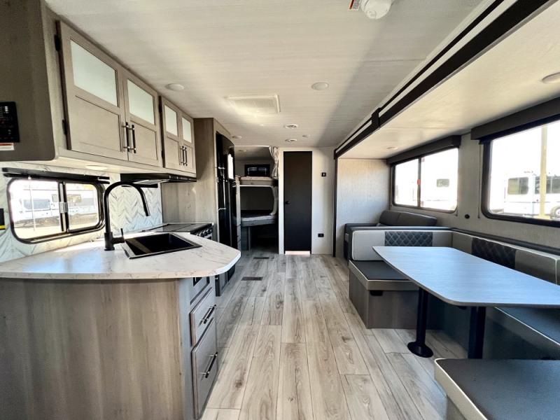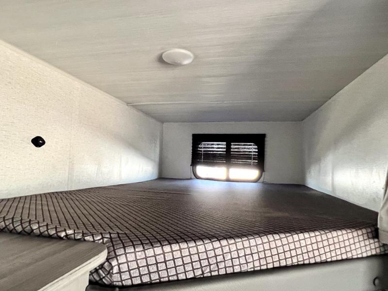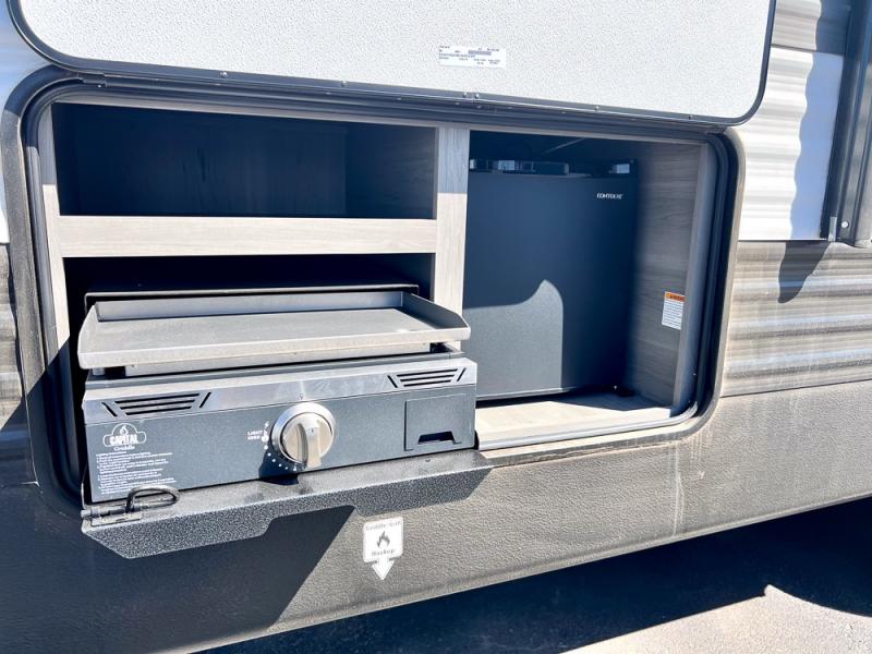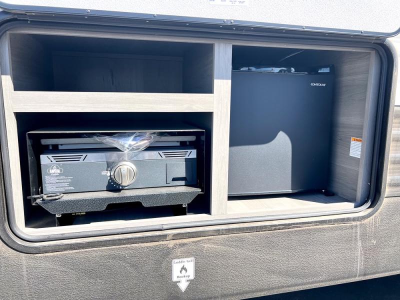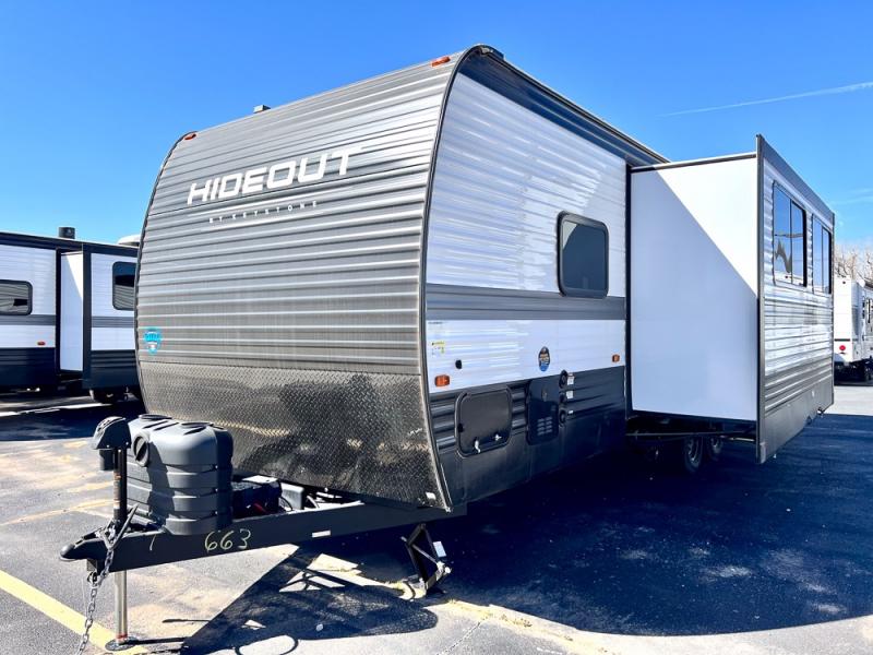 A large slide, front private bedroom, and double-size bunks make this Hideout Sport Double Axle the ultimate travel trailer! You will enjoy a walk-around queen bed in the bedroom plus dual closets and nightstands for your things. The full bath is towards the back and beside the bunks for easy nighttime use, and there is a pass-through storage outside for your gear. Head to the kitchen to prepare lunch on the cooktop, then dine at the U-shaped dinette and sofa within the large slide. If the weather is nice, you might just want to cook outdoors on the outside kitchen under the 18' power awning!