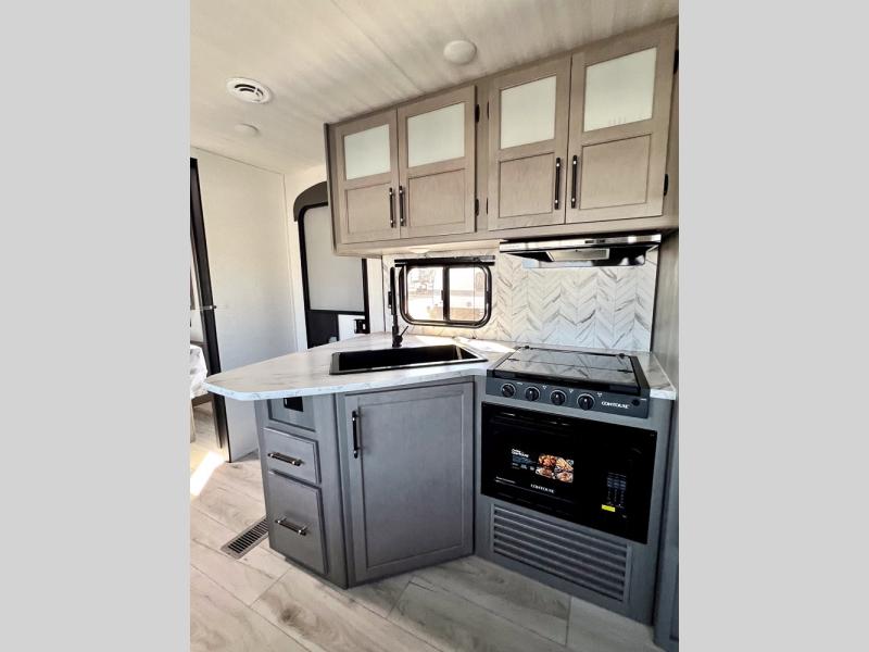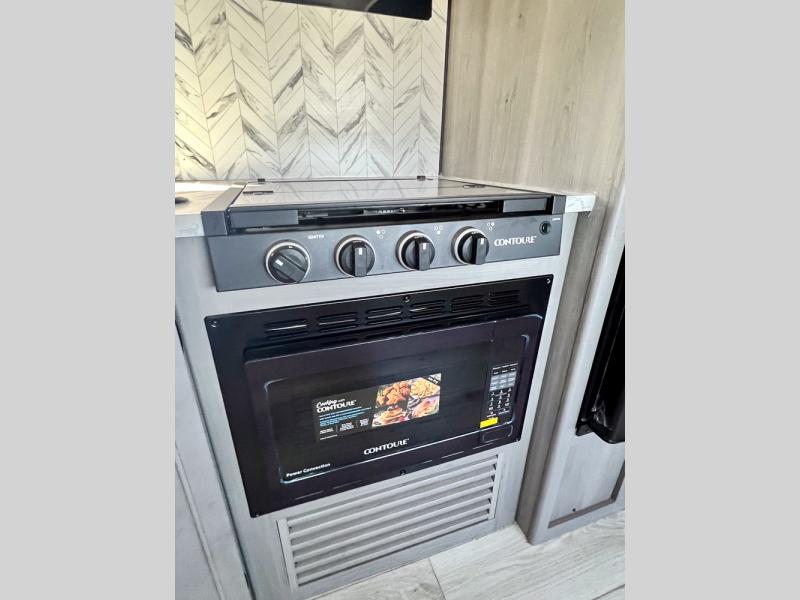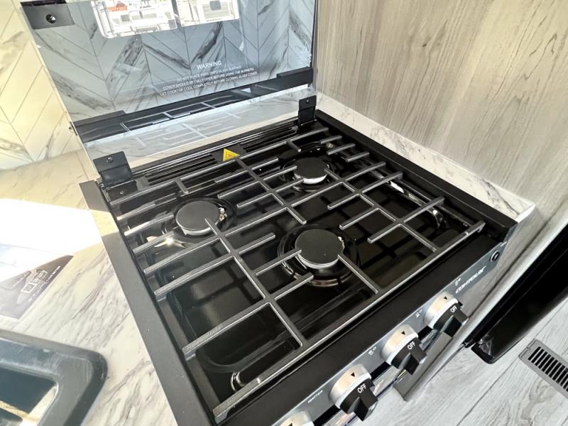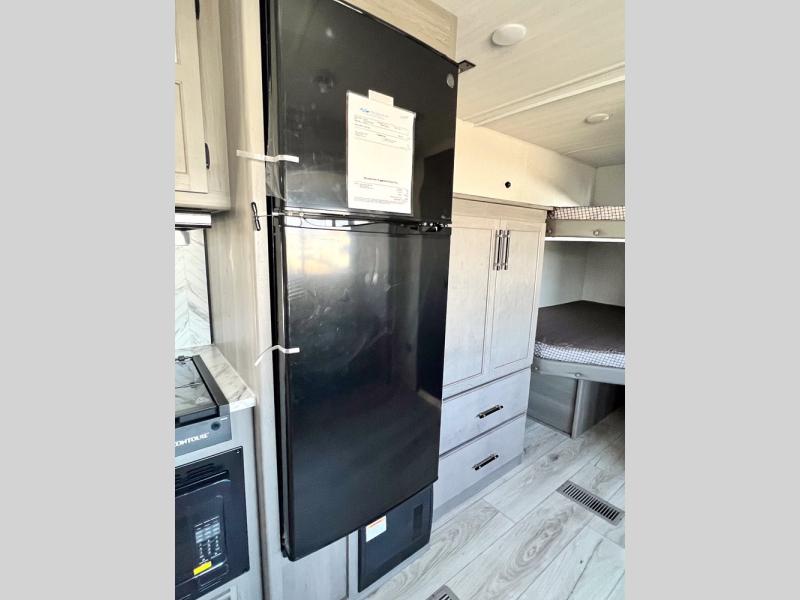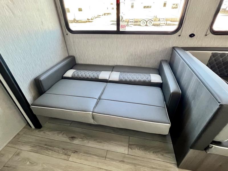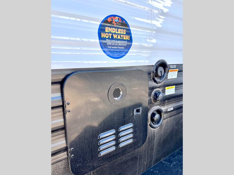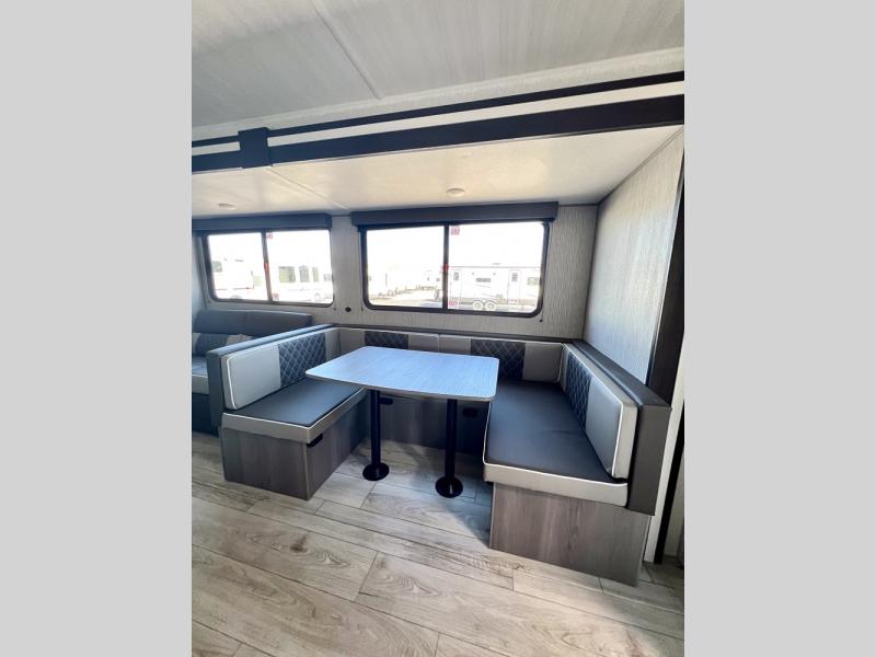 A large slide, front private bedroom, and double-size bunks make this Hideout Sport Double Axle the ultimate travel trailer! You will enjoy a walk-around queen bed in the bedroom plus dual closets and nightstands for your things. The full bath is towards the back and beside the bunks for easy nighttime use, and there is a pass-through storage outside for your gear. Head to the kitchen to prepare lunch on the cooktop, then dine at the U-shaped dinette and sofa within the large slide. If the weather is nice, you might just want to cook outdoors on the outside kitchen under the 18' power awning!