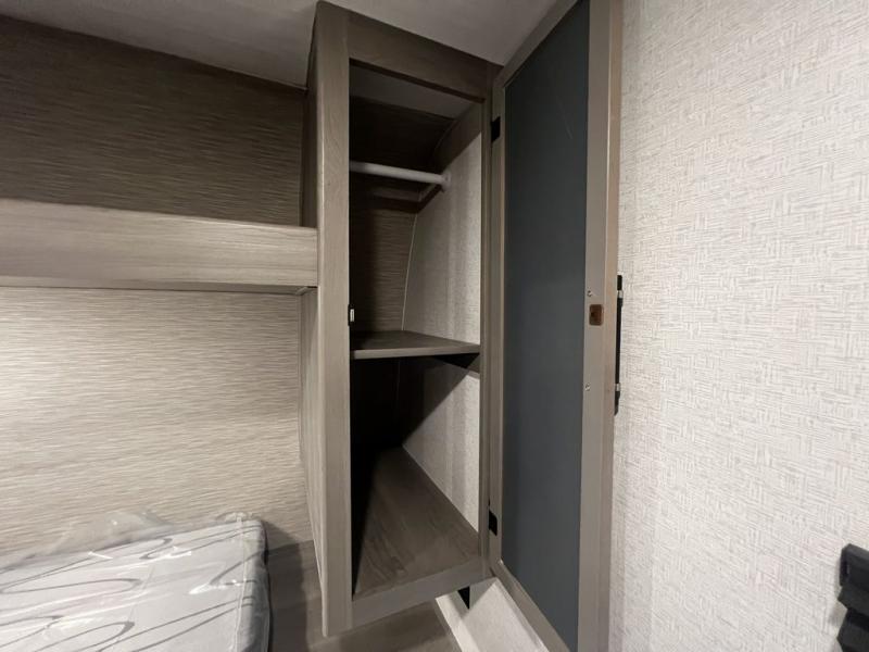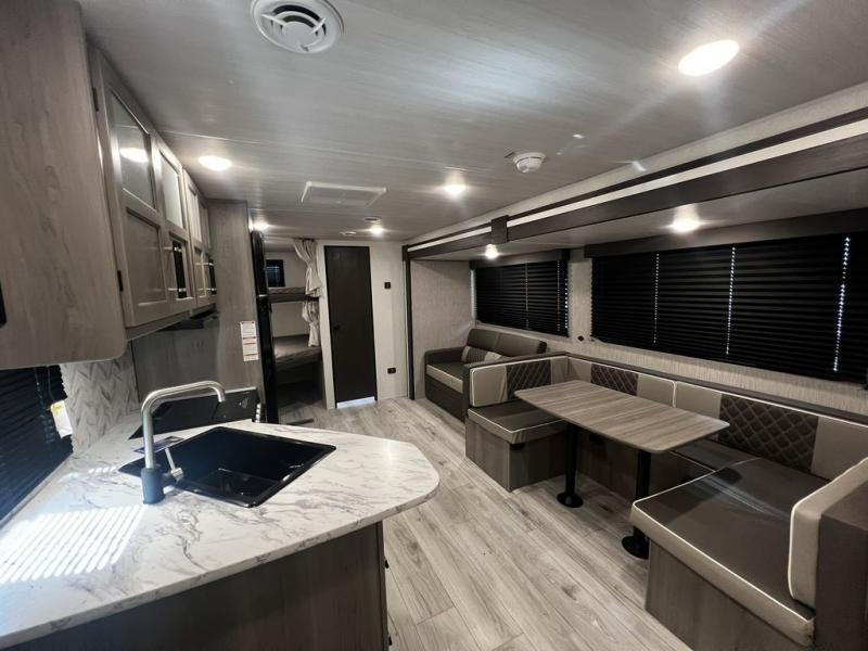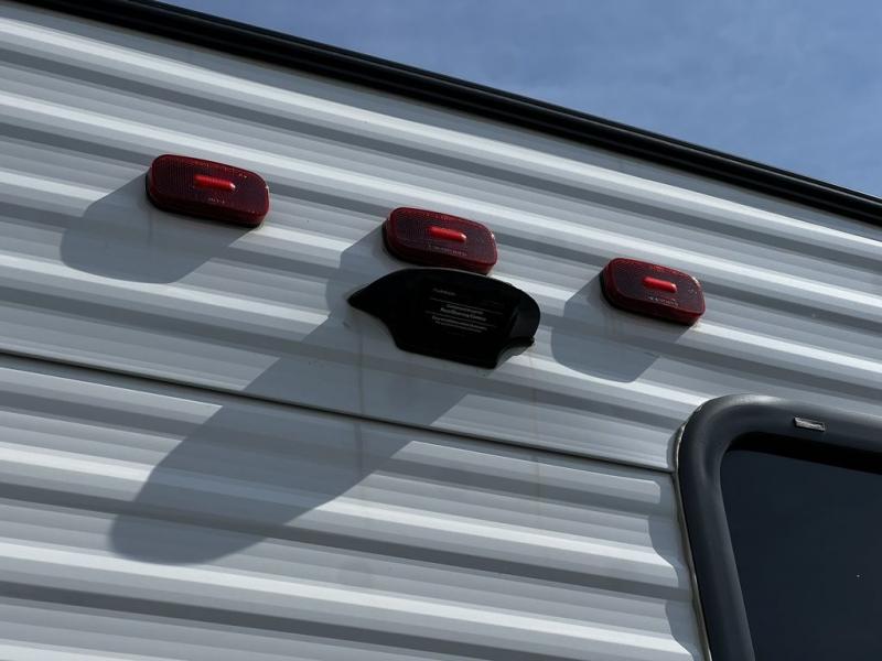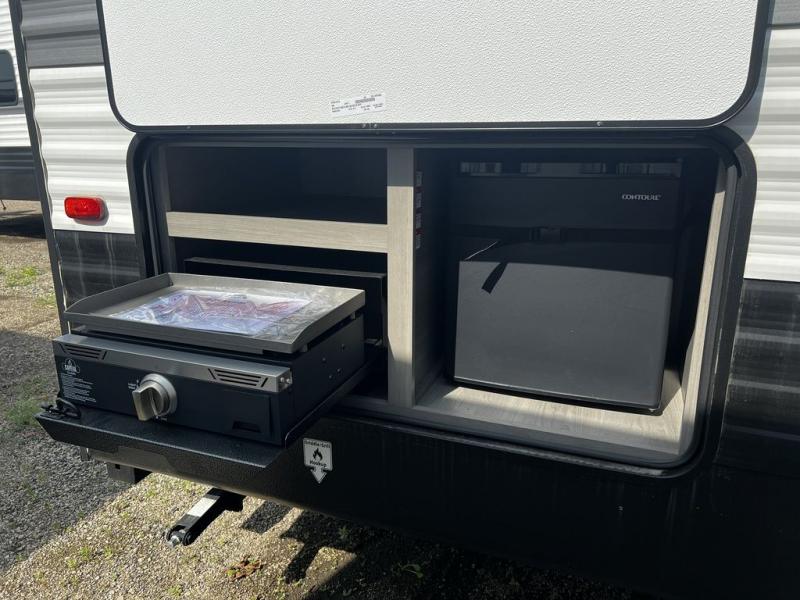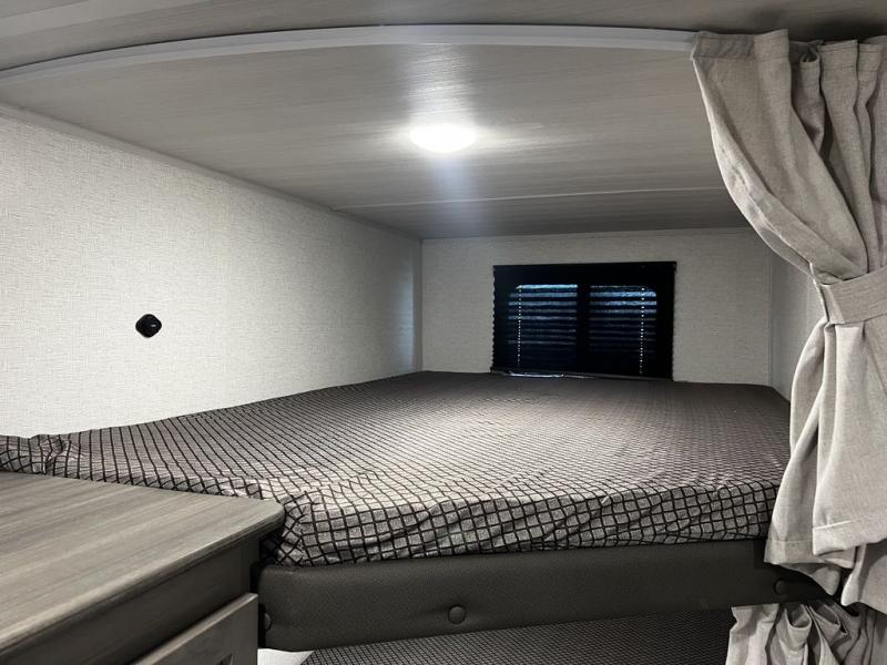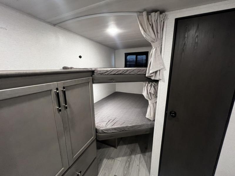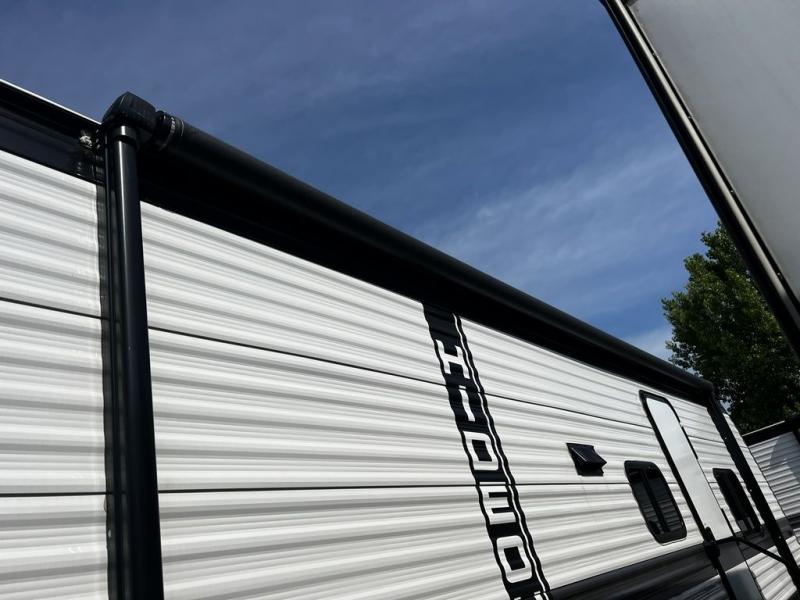A large slide, front private bedroom, and double-size bunks make this Hideout Sport Double Axle the ultimate travel trailer! You will enjoy a walk-around queen bed in the bedroom plus dual closets and nightstands for your things. The full bath is towards the back and beside the bunks for easy nighttime use, and there is a pass-through storage outside for your gear. Head to the kitchen to prepare lunch on the cooktop, then dine at the U-shaped dinette and sofa within the large slide. If the weather is nice, you might just want to cook outdoors on the outside kitchen under the 18' power awning!