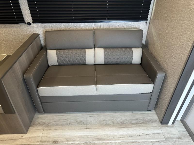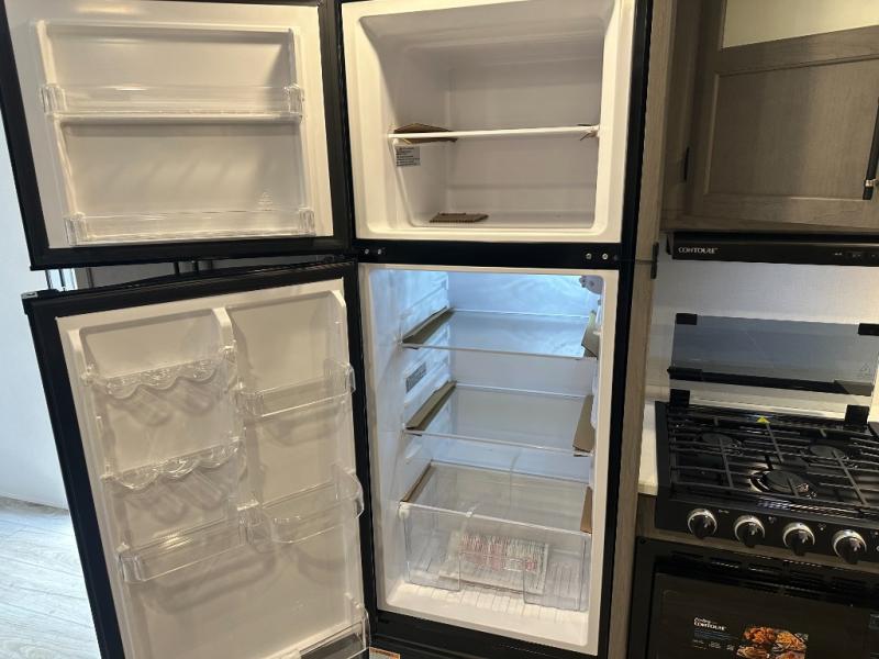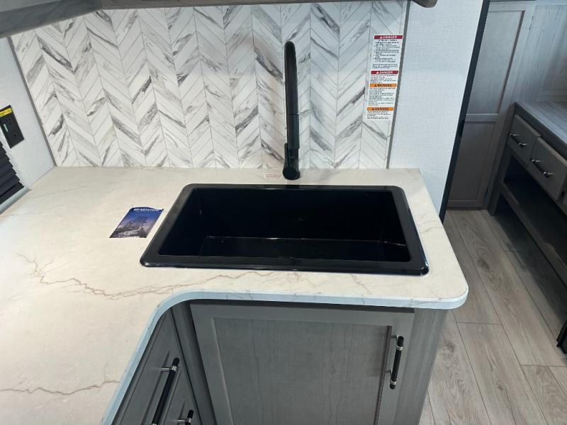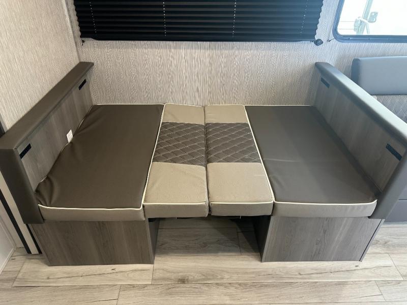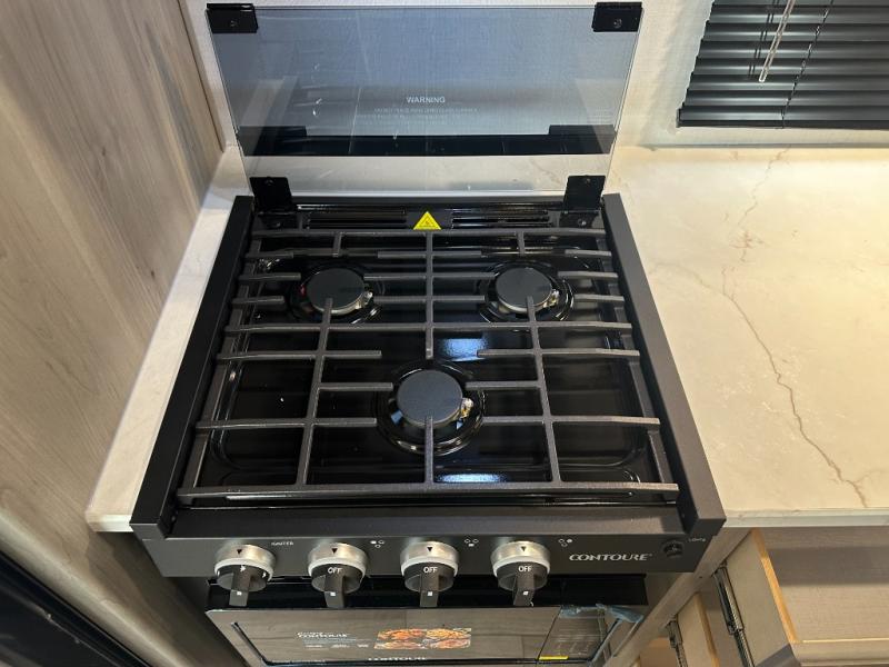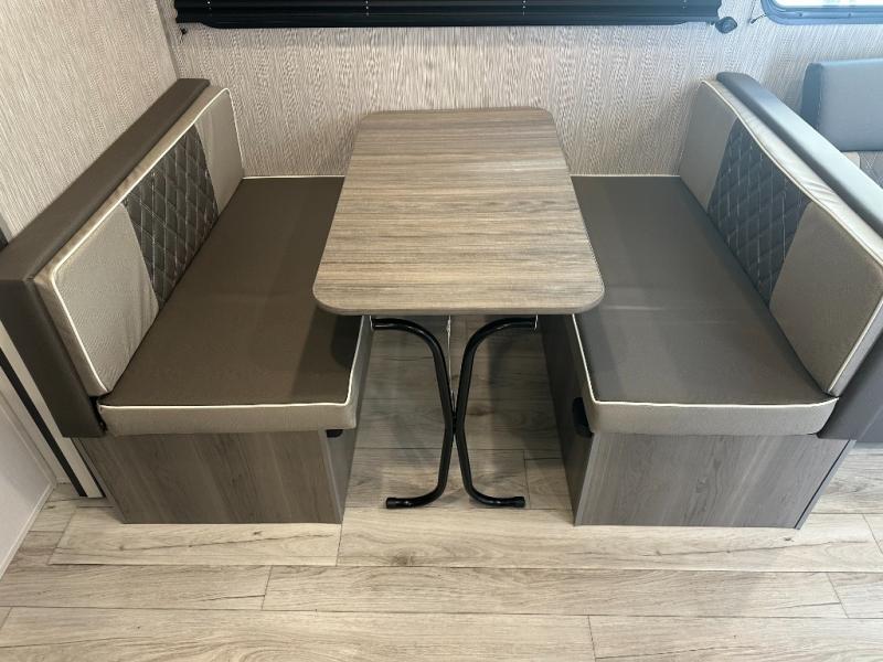 Cooking is a breeze in the centrally located kitchen featuring a two-burner cooktop, ample counter space, and a pantry large enough for all your favorite snacks and meal essentials. While dinner's on the stove, your crew can relax on the sofa or gather at the booth dinette to play a game or plan the next day's adventures. And when the weather's nice? Take the fun outdoors under the 16' power awning for shade, breeze, and fresh air living!
