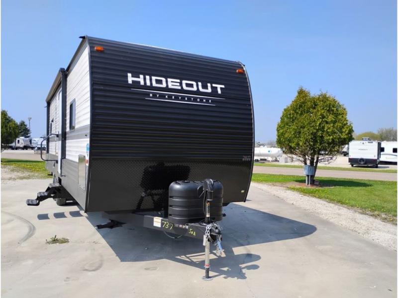 With any Hideout Sport Double Axle travel trailer by Keystone you will enjoy simplified camping solutions that won't break the bank! Each model is constructed with a durable aluminum exterior, tinted safety glass windows, a walkable roof, and an I-beam frame. There are power tongue jacks and heavy duty stabilizer jacks that will make it easier than ever to hitch up and go. An XL entry assist handle will also provide convenience, along with a power awning that will provide much wanted shade during the day. You will feel right at home with stylish decor, blackout night shades, and cozy queen bed with storage underneath!