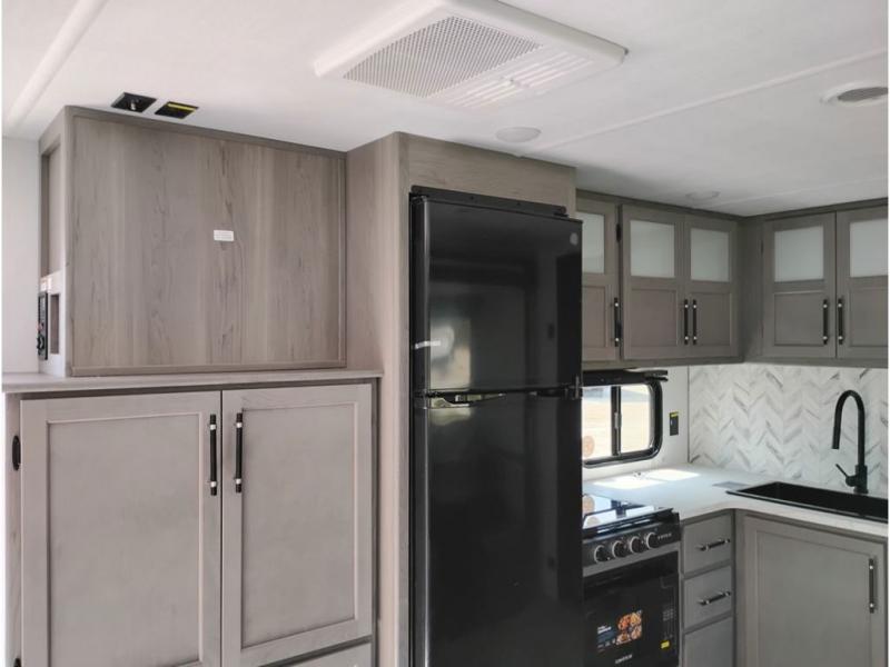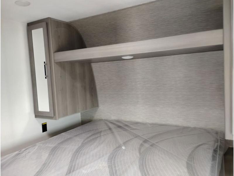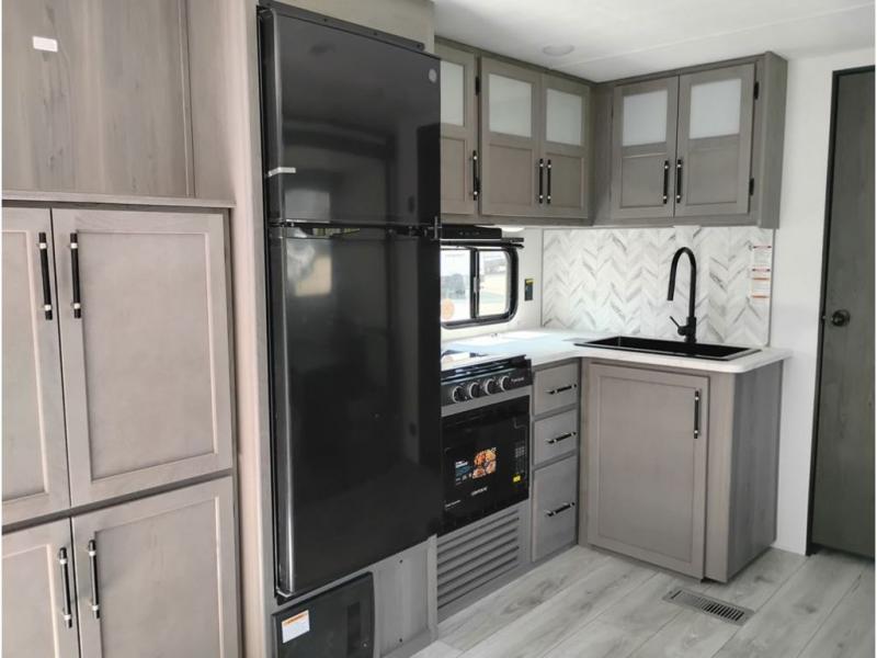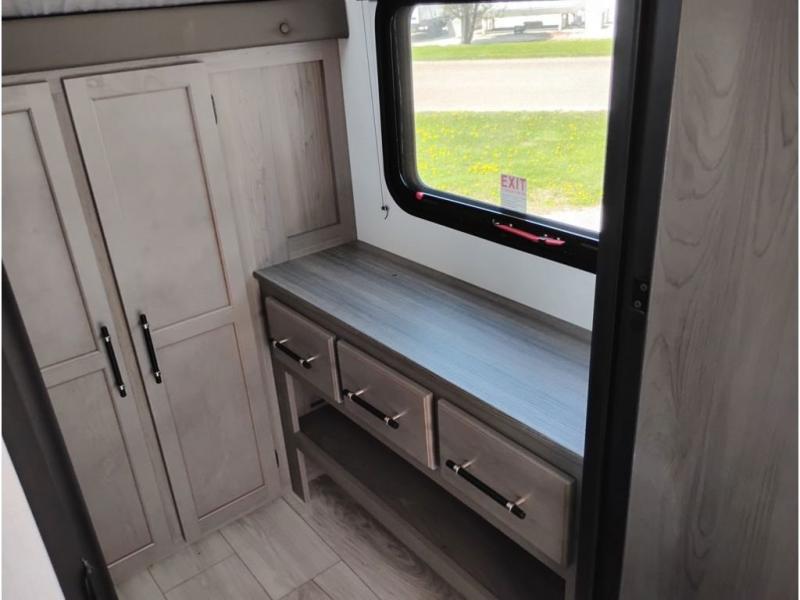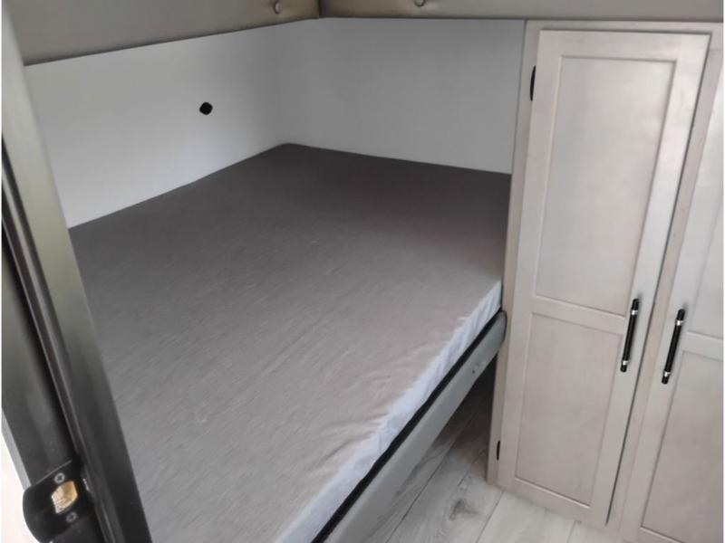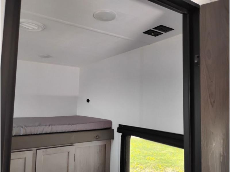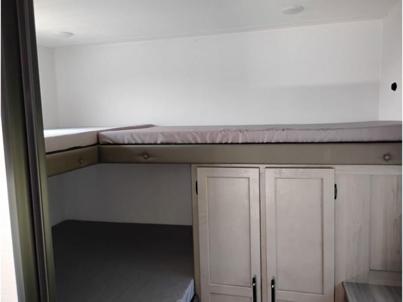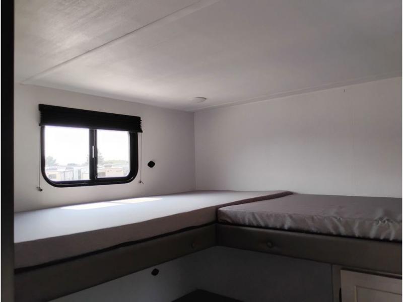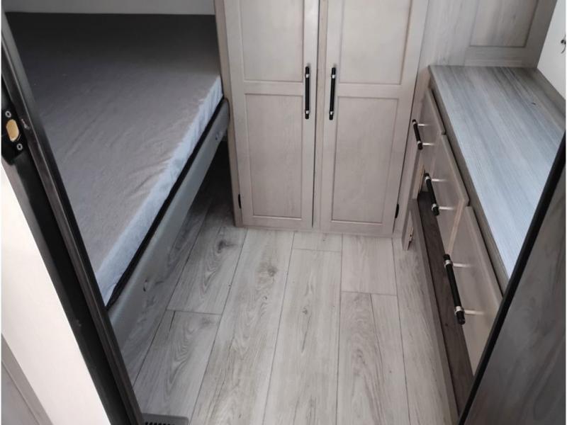 If you enjoy camping with extra friends and family, this travel trailer will be perfect for you! There is a rear bunkhouse with triple bunks, a dresser, plus a closet, making this room perfect for guests. Up front you'll find the private bedroom with a queen bed, dual nightstands and dual closets for your things, and the full bath is close by for convenience. The chef of your group will have a cooktop to prepare meals, ample counter space, plus a pantry for dry goods and snacks. Your crew can play a game at the booth dinette or relax on the sofa while dinner is being made, or they can relax outdoors under the 16' power awning!