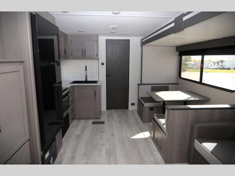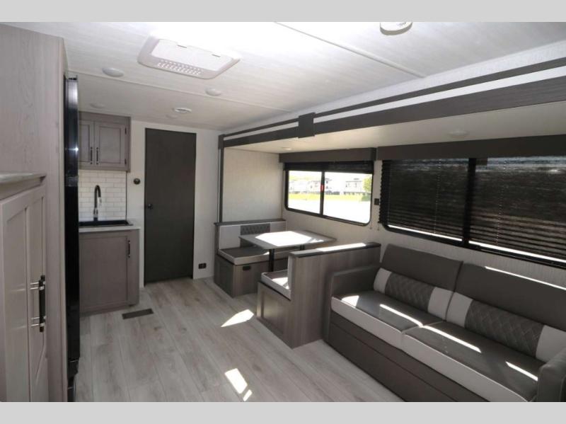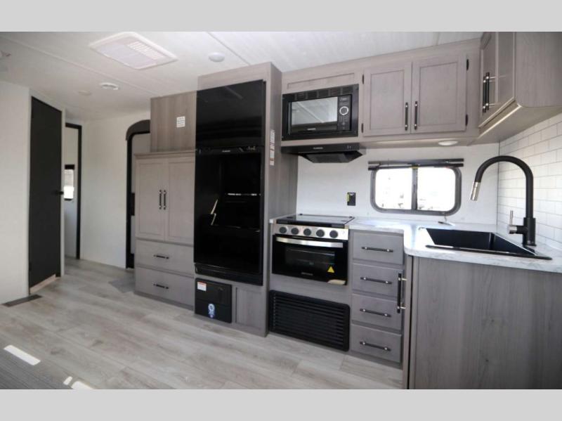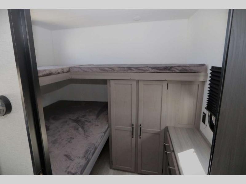 If you enjoy camping with extra friends and family, this travel trailer will be perfect for you! There is a rear bunkhouse with triple bunks, a dresser, plus a closet, making this room perfect for guests. Up front you'll find the private bedroom with a queen bed, dual nightstands and dual closets for your things, and the full bath is close by for convenience. The chef of your group will have a cooktop to prepare meals, ample counter space, plus a pantry for dry goods and snacks. Your crew can play a game at the booth dinette or relax on the sofa while dinner is being made, or they can relax outdoors under the 16' power awning!
