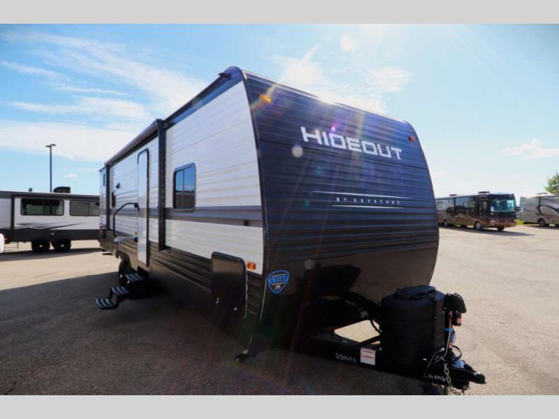 With any Hideout Sport Double Axle travel trailer by Keystone you will enjoy simplified camping solutions that won't break the bank! Each model is constructed with a durable aluminum exterior, tinted safety glass windows, a walkable roof, and an I-beam frame. There are power tongue jacks and heavy duty stabilizer jacks that will make it easier than ever to hitch up and go. An XL entry assist handle will also provide convenience, along with a power awning that will provide much wanted shade during the day. You will feel right at home with stylish decor, blackout night shades, and cozy queen bed with storage underneath!