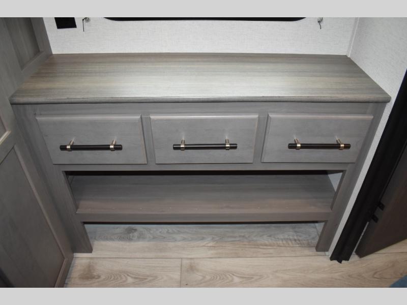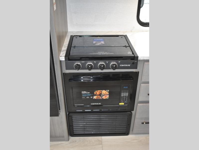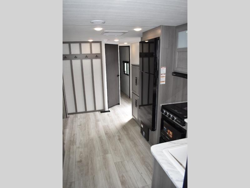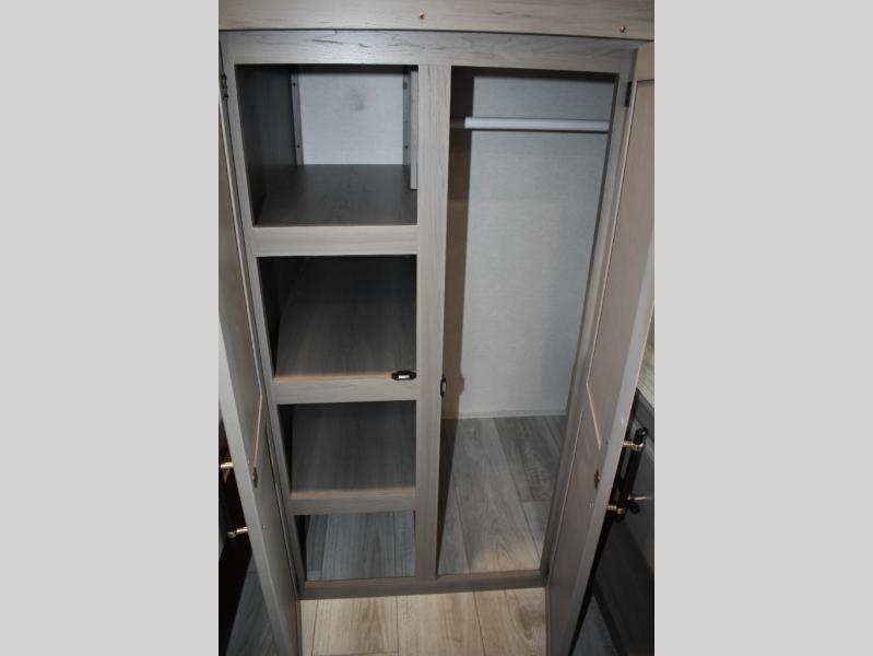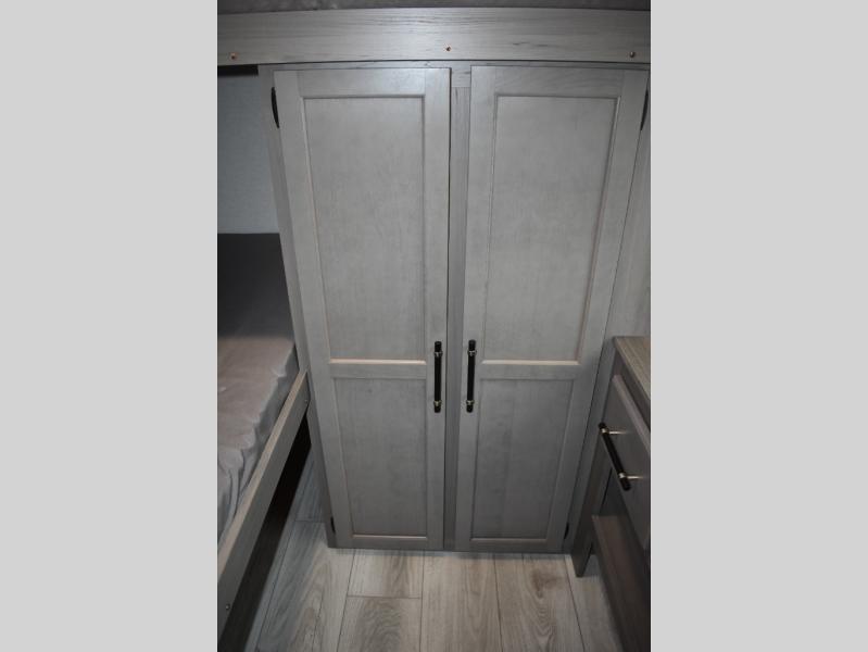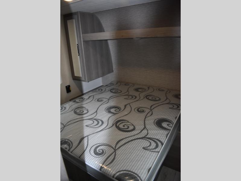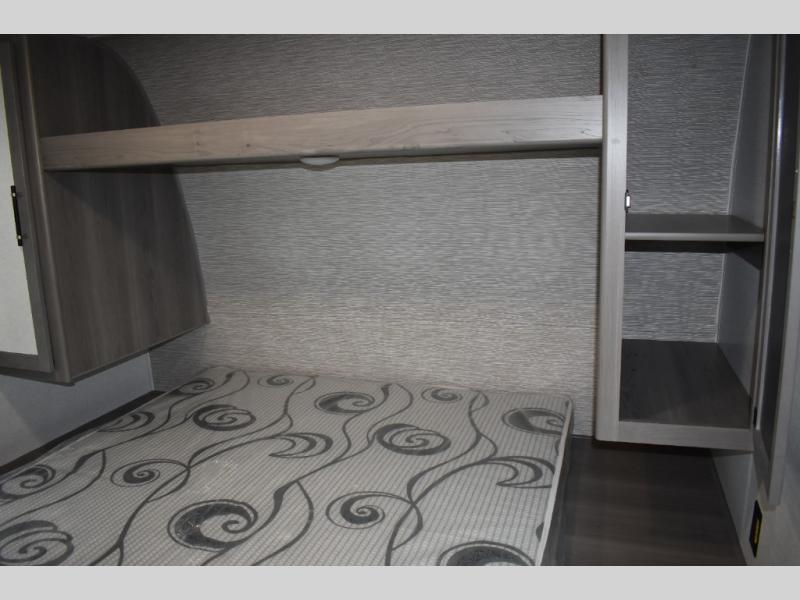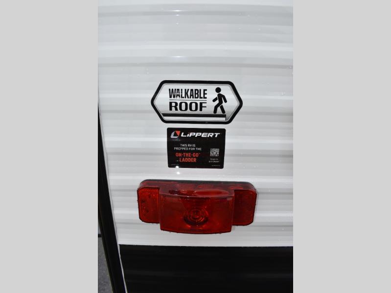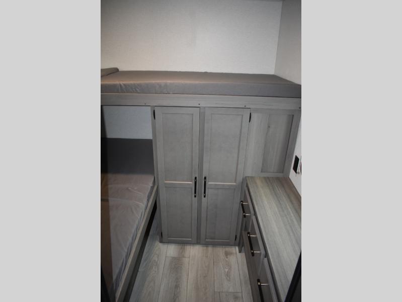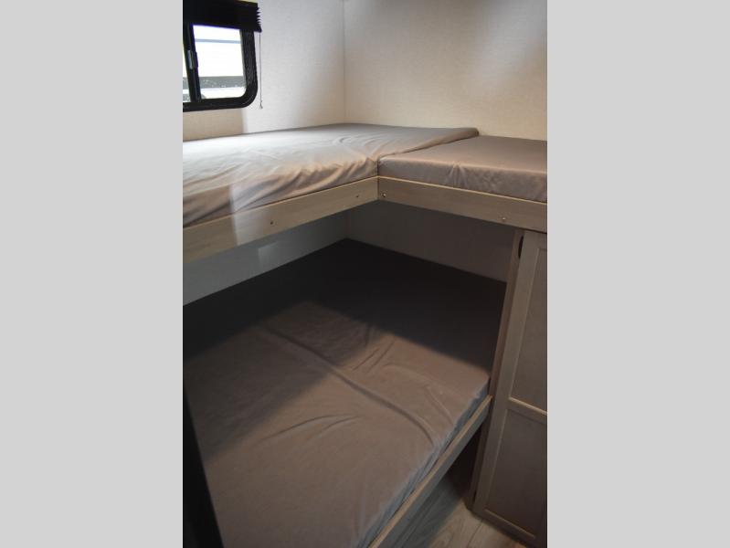 If you enjoy camping with extra friends and family, this travel trailer will be perfect for you! There is a rear bunkhouse with triple bunks, a dresser, plus a closet, making this room perfect for guests. Up front you'll find the private bedroom with a queen bed, dual nightstands and dual closets for your things, and the full bath is close by for convenience. The chef of your group will have a cooktop to prepare meals, ample counter space, plus a pantry for dry goods and snacks. Your crew can play a game at the booth dinette or relax on the sofa while dinner is being made, or they can relax outdoors under the 16' power awning!