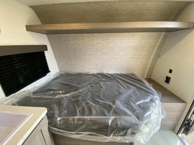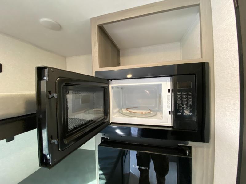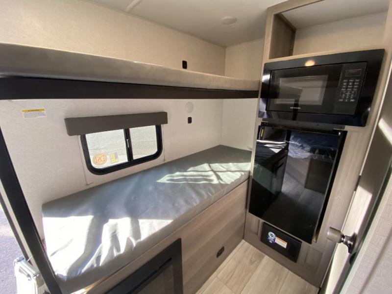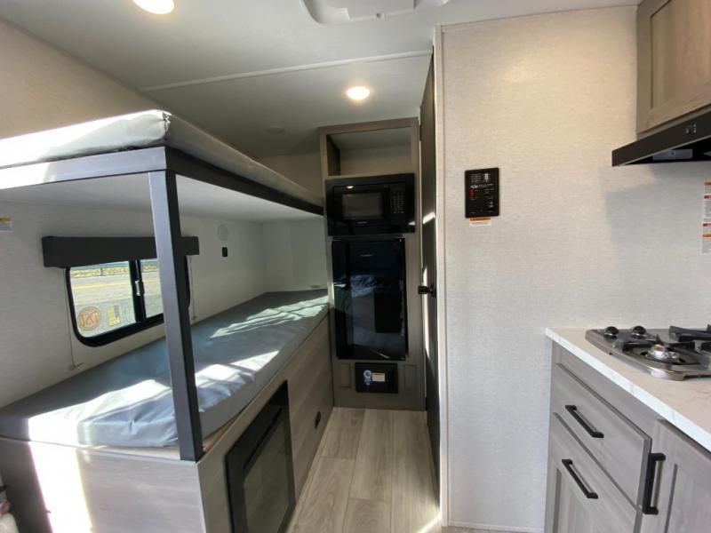 This lightweight travel trailer is perfect for four happy campers. You'll enjoy the front full-size bed, while your guests or little ones take the 28" x 74" bunk beds. There is also a shelf above the bed to keep your things organized. A private bath includes a shower with a toilet so you can freshen up each day without having to leave your camper. You can make your meals on the two burner gas cooktop or in the microwave oven, then take your plate outdoors to eat under the 8' power awning!