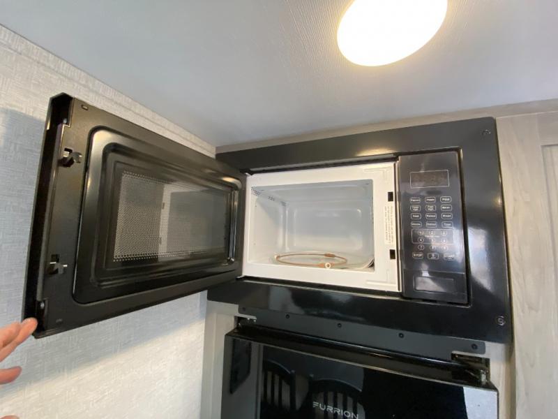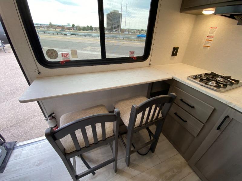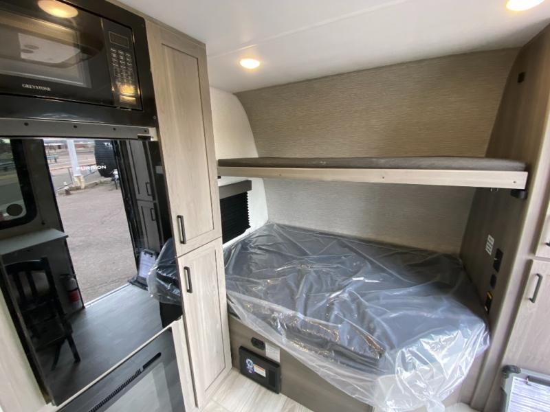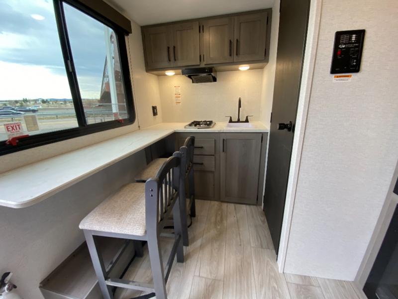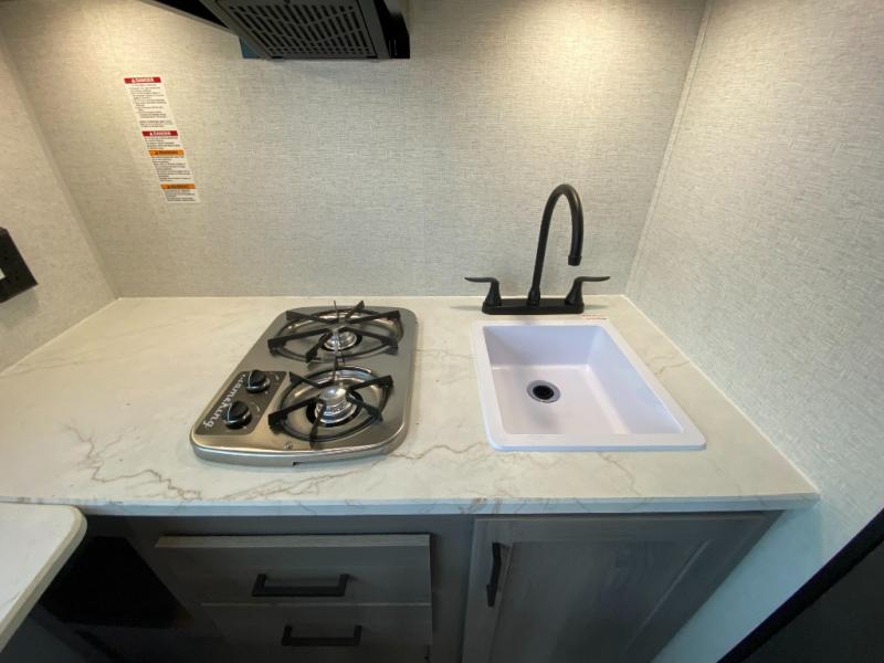 Your small crew will love camping in this lightweight travel trailer. There is a full-size bed up front with a folding bunk above plus a closet at the foot of the bed to keep your things out of the way. The two burner gas cooktop and microwave oven will let you make breakfast in the morning, and the folding table with two chairs provides a place to dine together. And a private bath with a shower and toilet lets you easily clean up after a day outdoors!