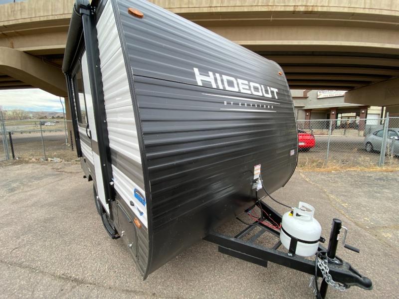 Open your horizons with the Hideout Sport Single Axle travel trailers by Keystone. They are compact, convenient, and lightweight; everything you're looking for in an RV! Each model features an aluminum exterior, tinted safety glass windows, and a Super Flex TPO roof membrane for added durability. The interior includes blackout night shades for added privacy and solid wood doors and drawers that will give a more at-home touch. The Girard tankless water heater is a feature you won't want to camp without, and the LED lighting will keep your space bright and open!