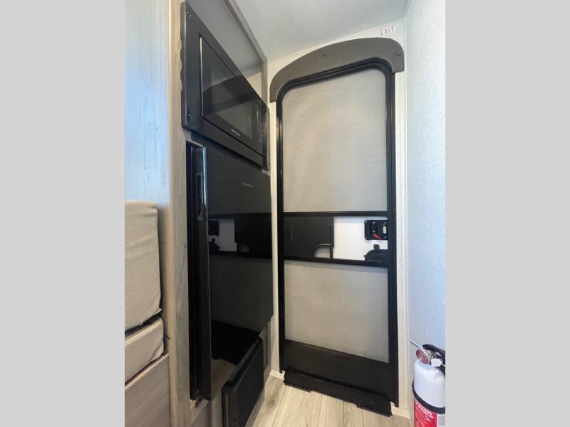 This lightweight travel trailer will be easy to tow and even easier to love! There is a unique rear entry door, a front queen bed, plus a full bath onboard so you don't have to use the camp's facilities. The two burner cooktop and 12V refrigerator will let you cook and store food, and the booth dinette provides dining and sleeping space for a guest. If the weather is nice, you may just want to head outdoors to sit under the 10' power awning!