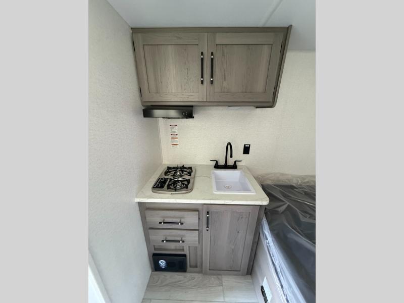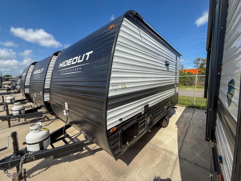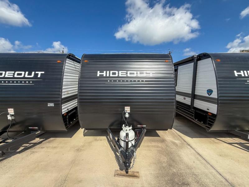 Open your horizons with the Hideout Sport Single Axle travel trailers by Keystone. They are compact, convenient, and lightweight; everything you're looking for in an RV! Each model features an aluminum exterior, tinted safety glass windows, and a Super Flex TPO roof membrane for added durability. The interior includes blackout night shades for added privacy and solid wood doors and drawers that will give a more at-home touch. The Girard tankless water heater is a feature you won't want to camp without, and the LED lighting will keep your space bright and open!