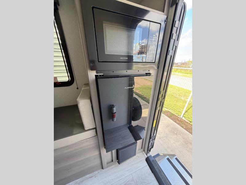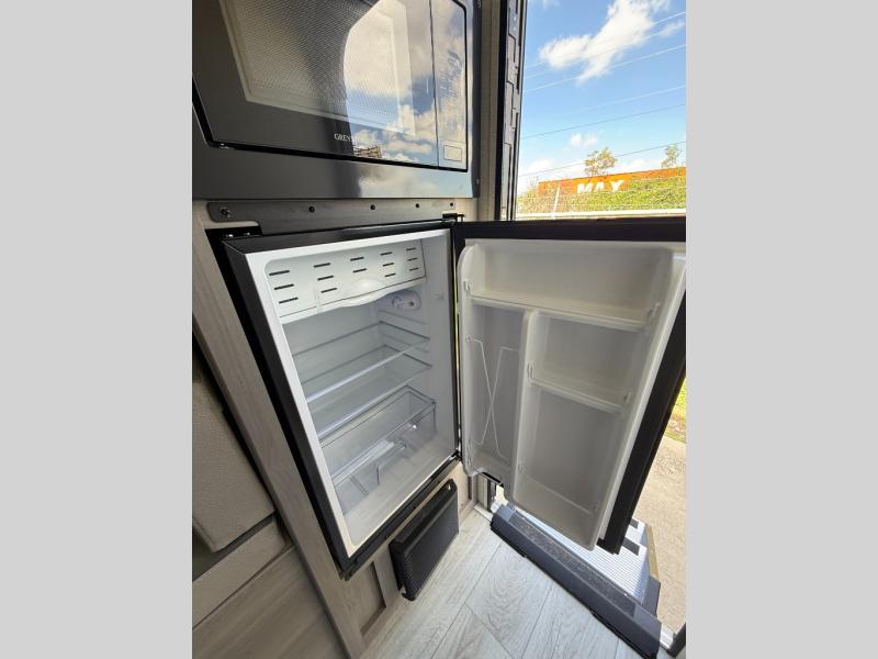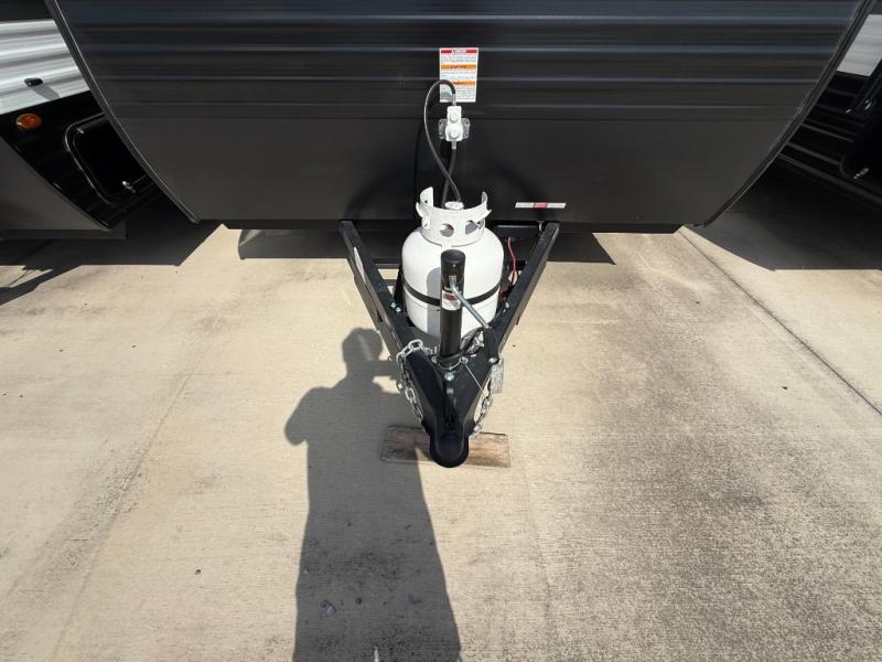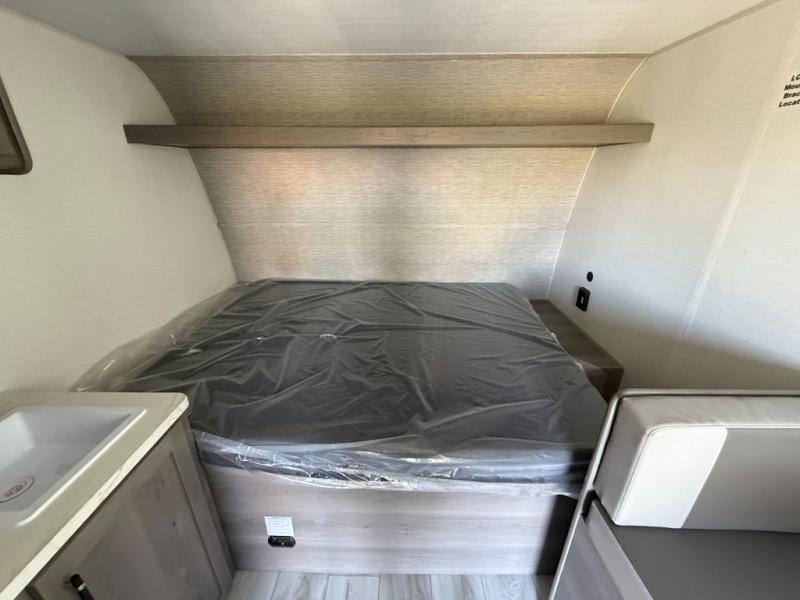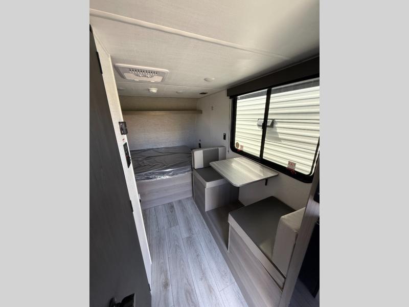 This lightweight travel trailer will be easy to tow and even easier to love! There is a unique rear entry door, a front queen bed, plus a full bath onboard so you don't have to use the camp's facilities. The two burner cooktop and 12V refrigerator will let you cook and store food, and the booth dinette provides dining and sleeping space for a guest. If the weather is nice, you may just want to head outdoors to sit under the 10' power awning!
