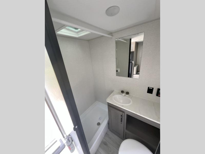 This lightweight travel trailer will be easy to tow and even easier to love! There is a unique rear entry door, a front queen bed, plus a full bath onboard so you don't have to use the camp's facilities. The two burner cooktop and 12V refrigerator will let you cook and store food, and the booth dinette provides dining and sleeping space for a guest. If the weather is nice, you may just want to head outdoors to sit under the 10' power awning!