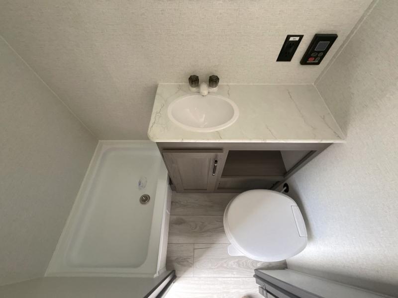 This lightweight travel trailer will be easy to tow and even easier to love! There is a unique rear entry door, a front queen bed, plus a full bath onboard so you don't have to use the camp's facilities. The two burner cooktop and 12V refrigerator will let you cook and store food, and the booth dinette provides dining and sleeping space for a guest. If the weather is nice, you may just want to head outdoors to sit under the 10' power awning!