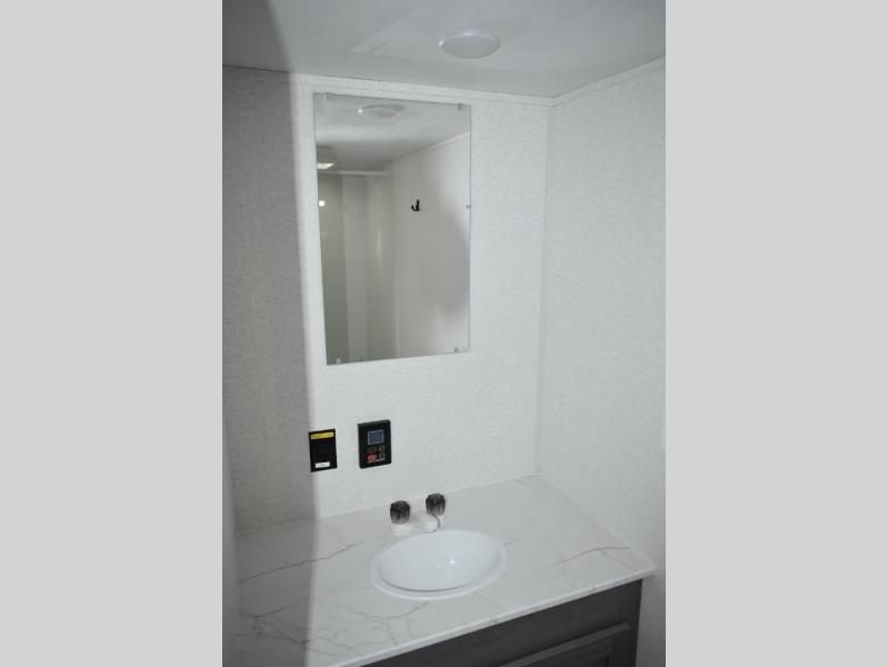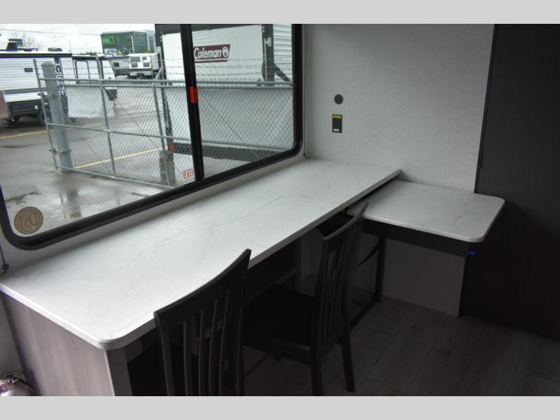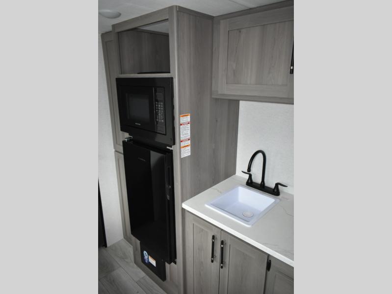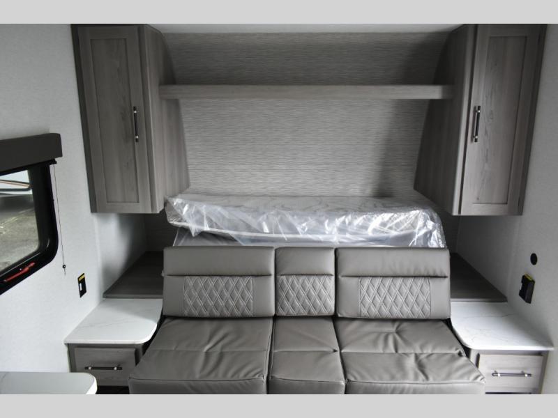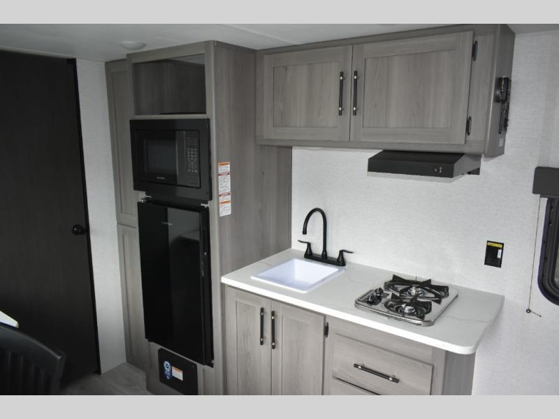 You'll love how versatile this travel trailer is since you can sleep on the Murphy bed at night and enjoy the fold-down sofa during the day! There are dual wardrobes and nightstands on either side of the bed for your things, and larger camp gear can go outside in the pass-thru storage. A full kitchen with a two burner cooktop and 3.3 cu. ft. 12V refrigerator will let the chef whip up their best meals, and the desk area with two chairs provides a place to dine and work. And don't overlook the spacious full rear bath!