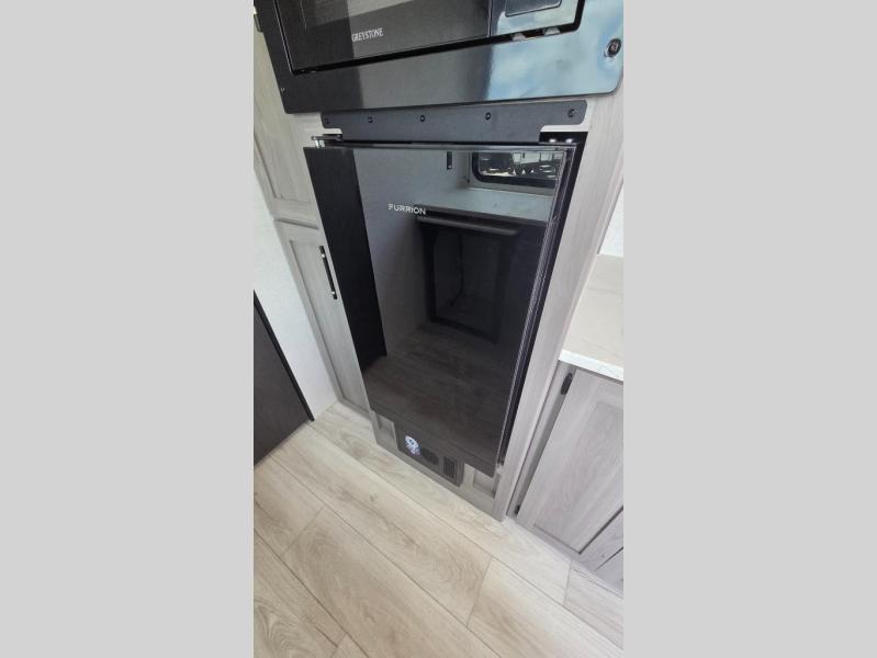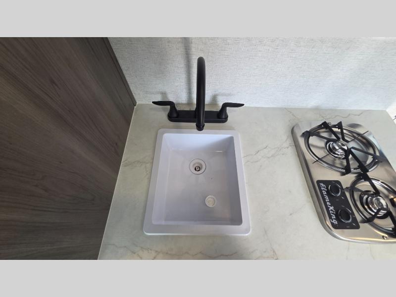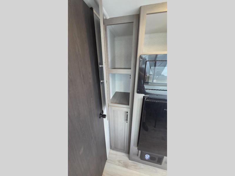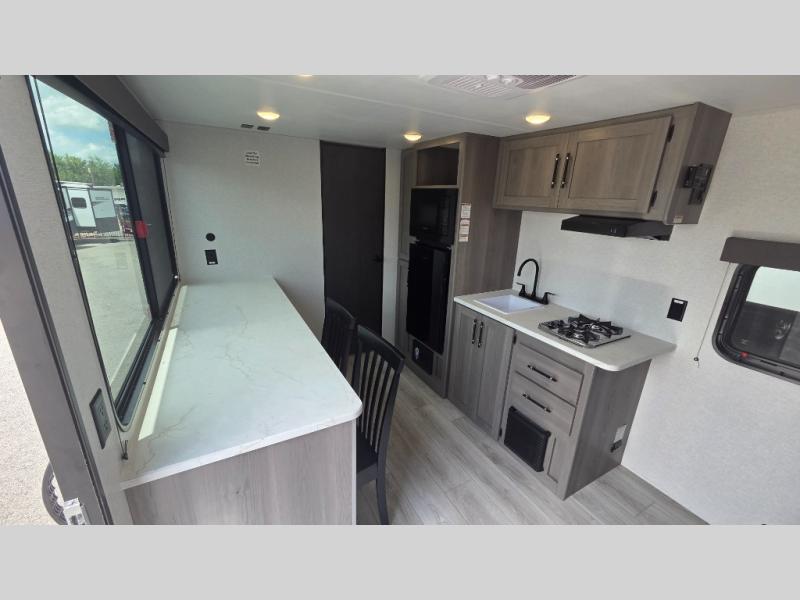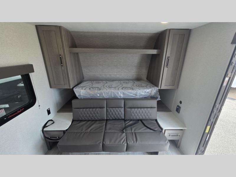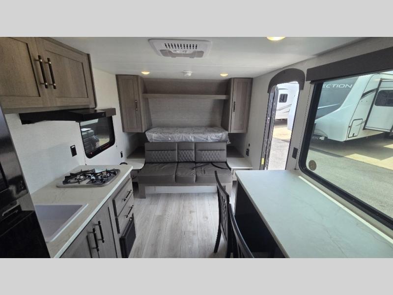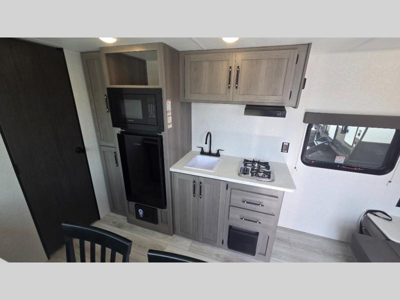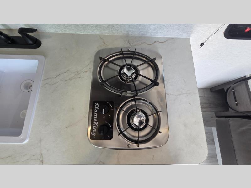 You'll love how versatile this travel trailer is since you can sleep on the Murphy bed at night and enjoy the fold-down sofa during the day! There are dual wardrobes and nightstands on either side of the bed for your things, and larger camp gear can go outside in the pass-thru storage. A full kitchen with a two burner cooktop and 3.3 cu. ft. 12V refrigerator will let the chef whip up their best meals, and the desk area with two chairs provides a place to dine and work. And don't overlook the spacious full rear bath!