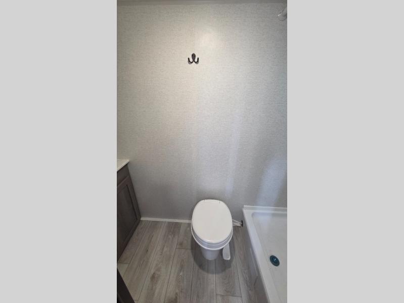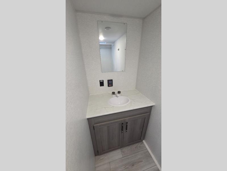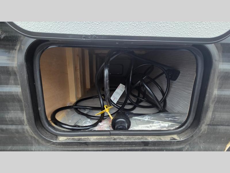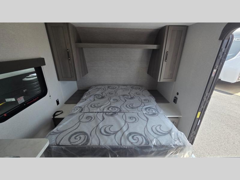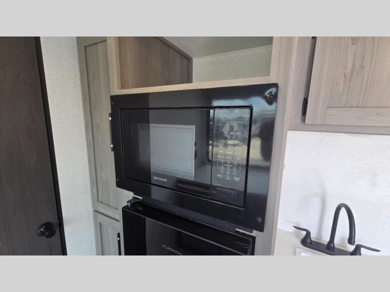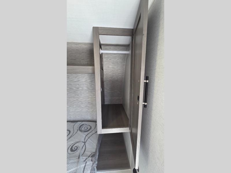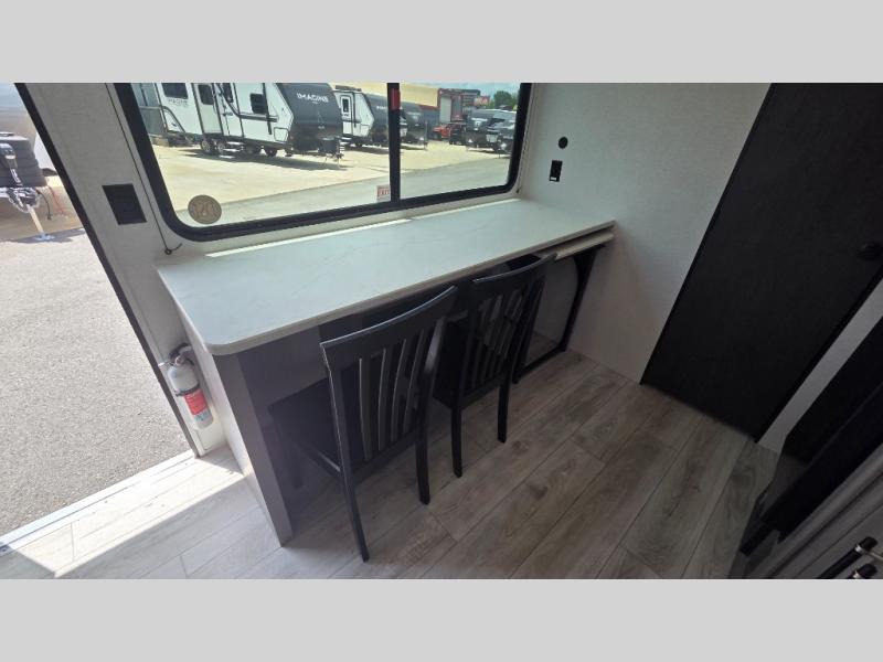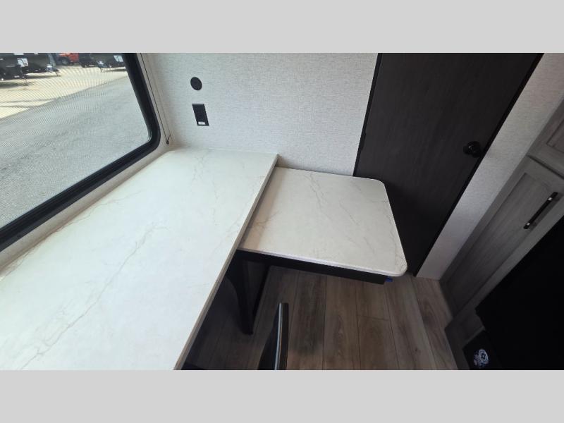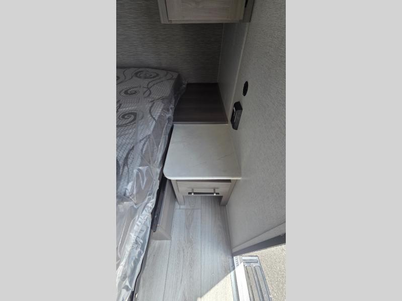 You'll love how versatile this travel trailer is since you can sleep on the Murphy bed at night and enjoy the fold-down sofa during the day! There are dual wardrobes and nightstands on either side of the bed for your things, and larger camp gear can go outside in the pass-thru storage. A full kitchen with a two burner cooktop and 3.3 cu. ft. 12V refrigerator will let the chef whip up their best meals, and the desk area with two chairs provides a place to dine and work. And don't overlook the spacious full rear bath!