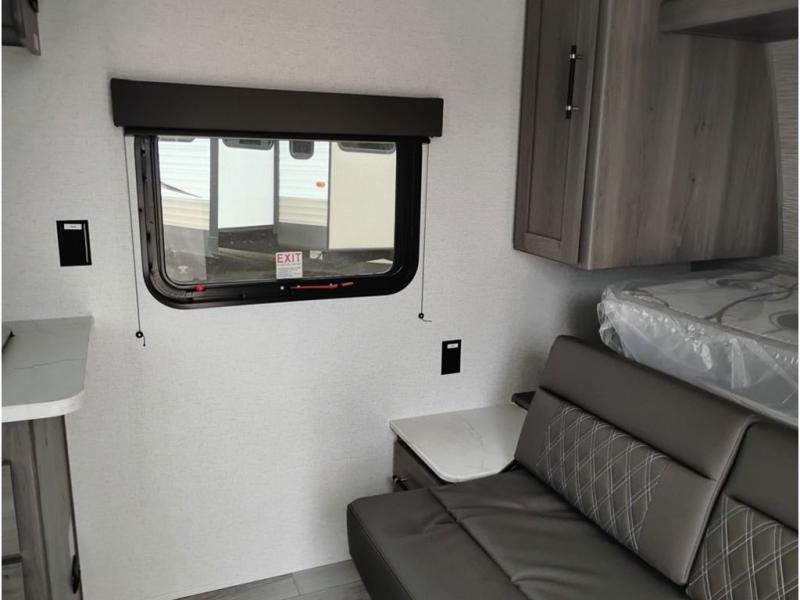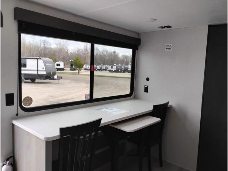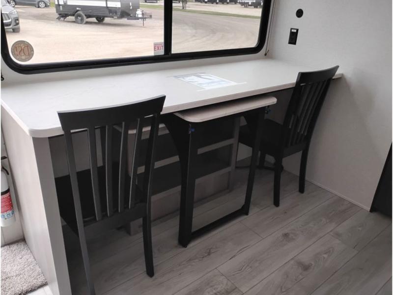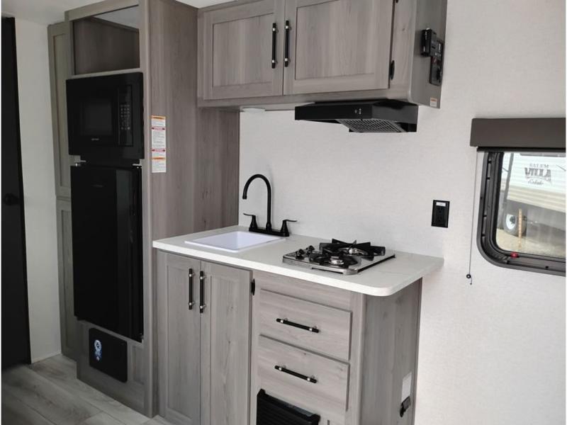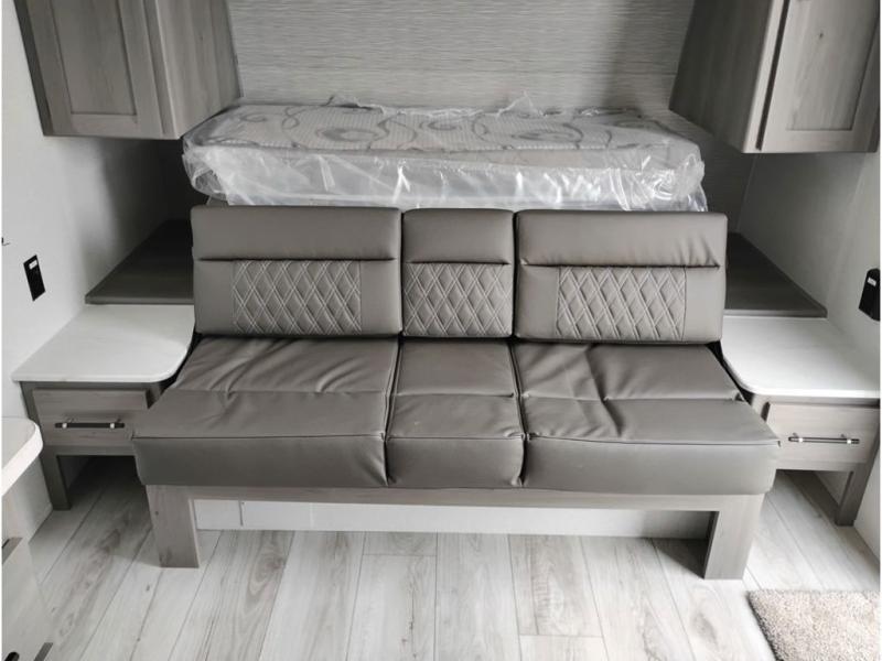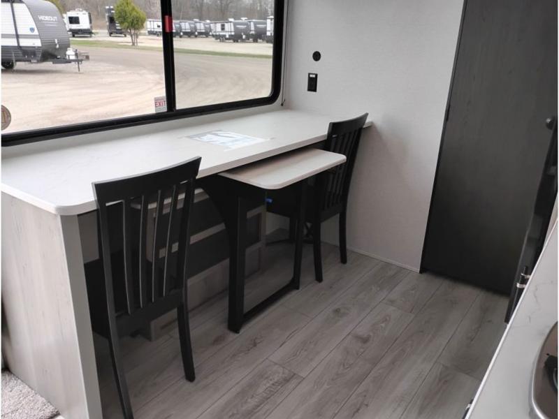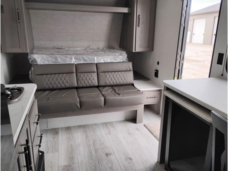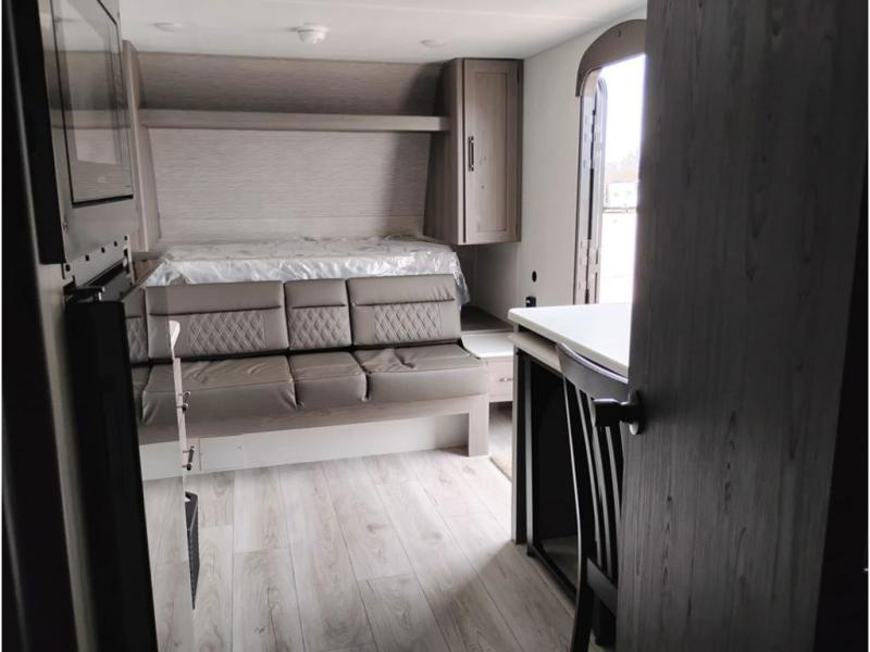 You'll love how versatile this travel trailer is since you can sleep on the Murphy bed at night and enjoy the fold-down sofa during the day! There are dual wardrobes and nightstands on either side of the bed for your things, and larger camp gear can go outside in the pass-thru storage. A full kitchen with a two burner cooktop and 3.3 cu. ft. 12V refrigerator will let the chef whip up their best meals, and the desk area with two chairs provides a place to dine and work. And don't overlook the spacious full rear bath!