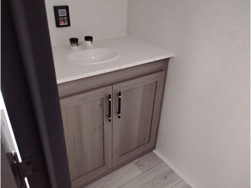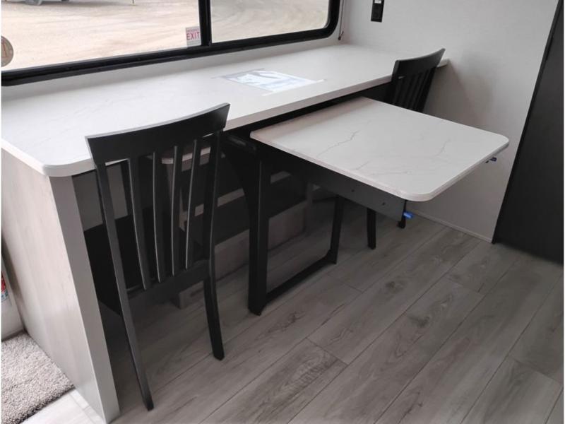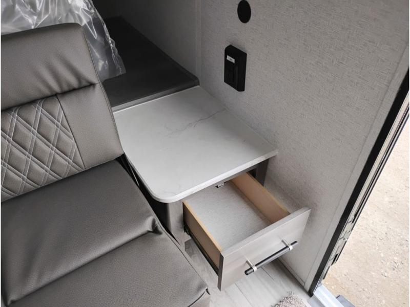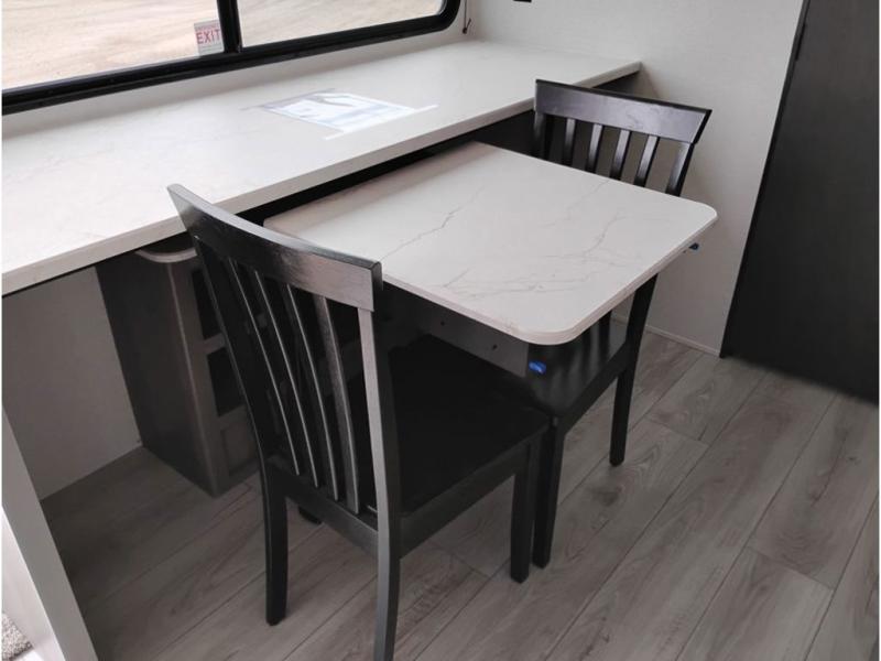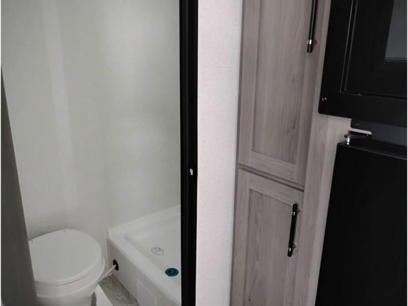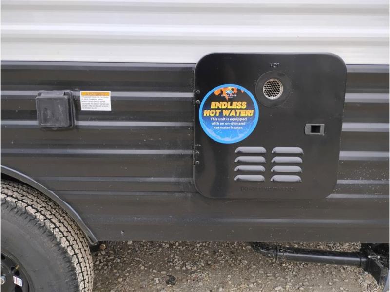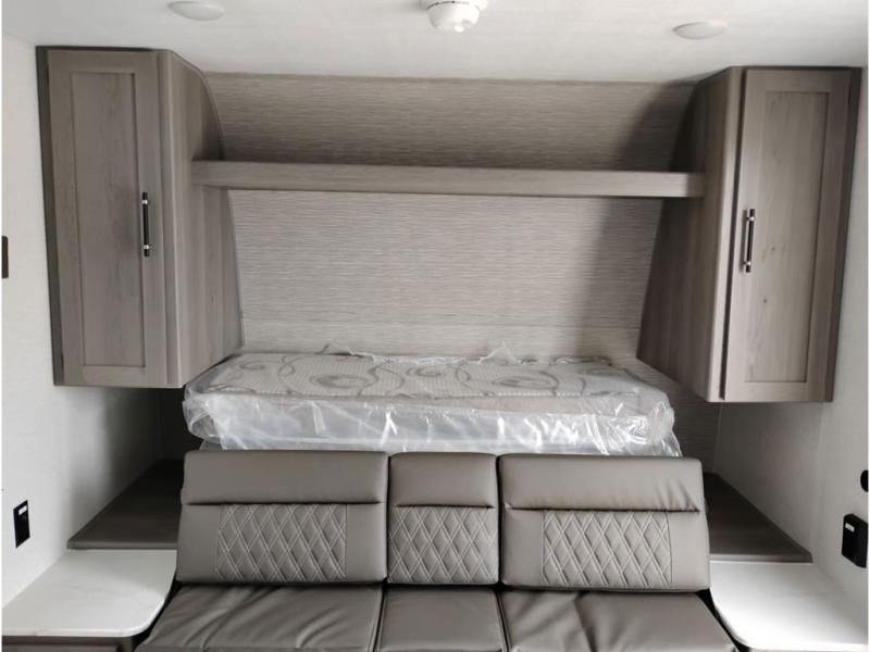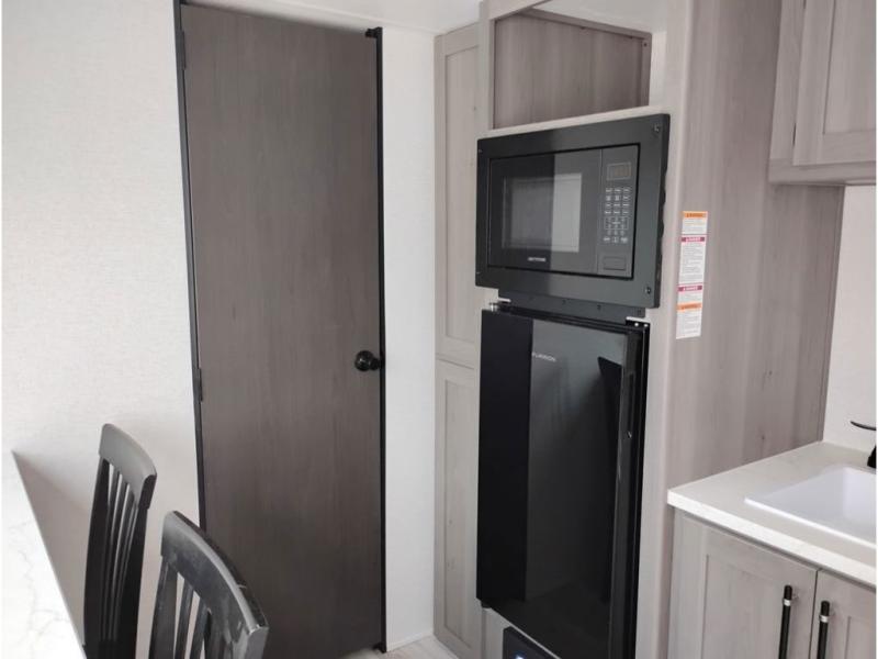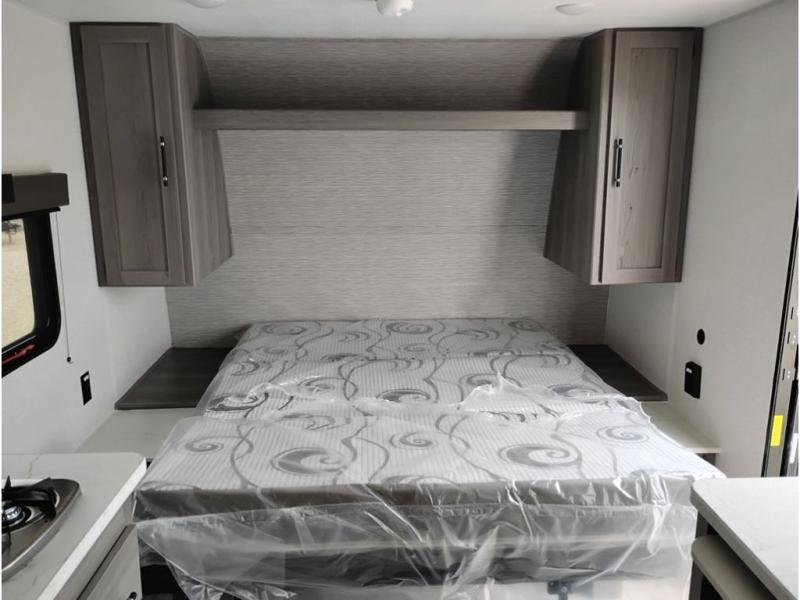 You'll love how versatile this travel trailer is since you can sleep on the Murphy bed at night and enjoy the fold-down sofa during the day! There are dual wardrobes and nightstands on either side of the bed for your things, and larger camp gear can go outside in the pass-thru storage. A full kitchen with a two burner cooktop and 3.3 cu. ft. 12V refrigerator will let the chef whip up their best meals, and the desk area with two chairs provides a place to dine and work. And don't overlook the spacious full rear bath!