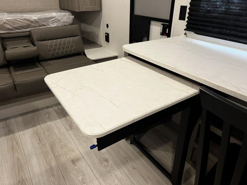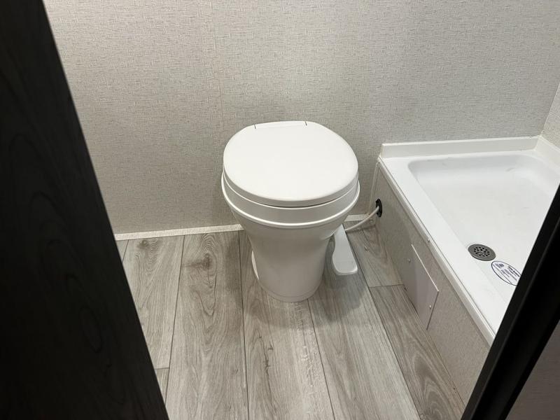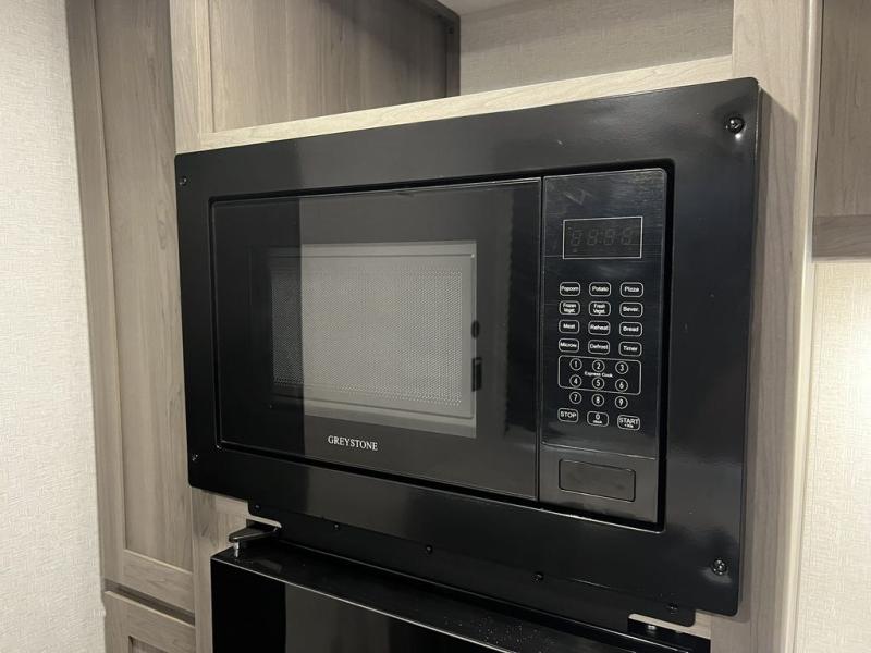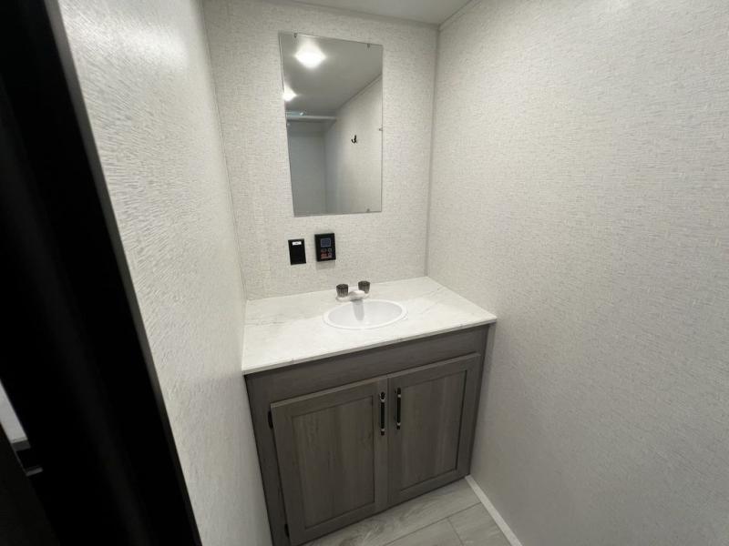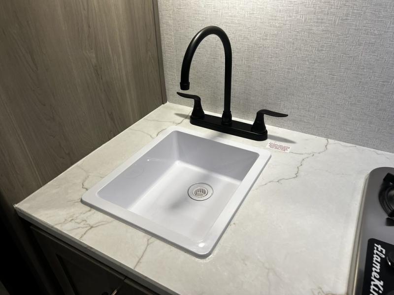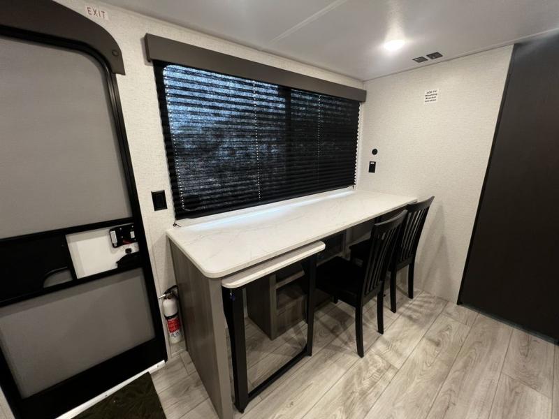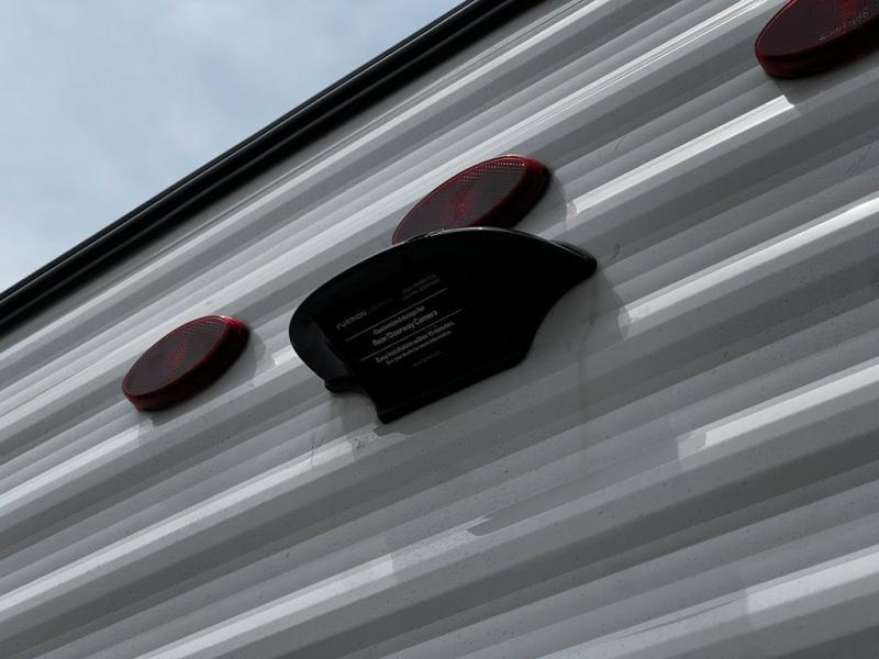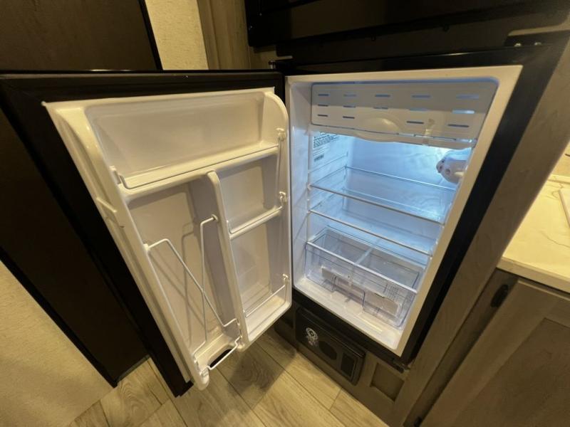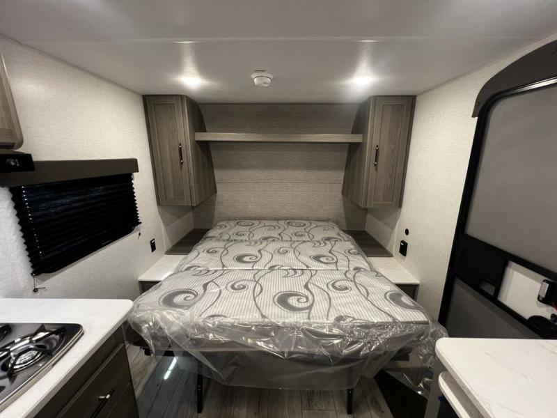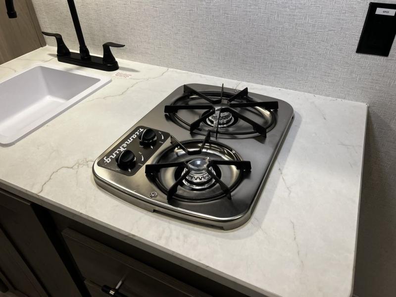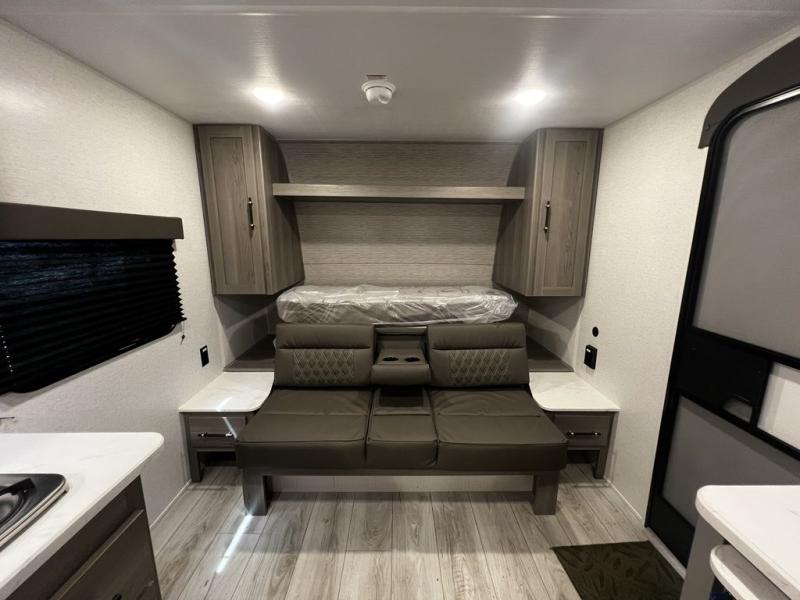 You'll love how versatile this travel trailer is since you can sleep on the Murphy bed at night and enjoy the fold-down sofa during the day! There are dual wardrobes and nightstands on either side of the bed for your things, and larger camp gear can go outside in the pass-thru storage. A full kitchen with a two burner cooktop and 3.3 cu. ft. 12V refrigerator will let the chef whip up their best meals, and the desk area with two chairs provides a place to dine and work. And don't overlook the spacious full rear bath!