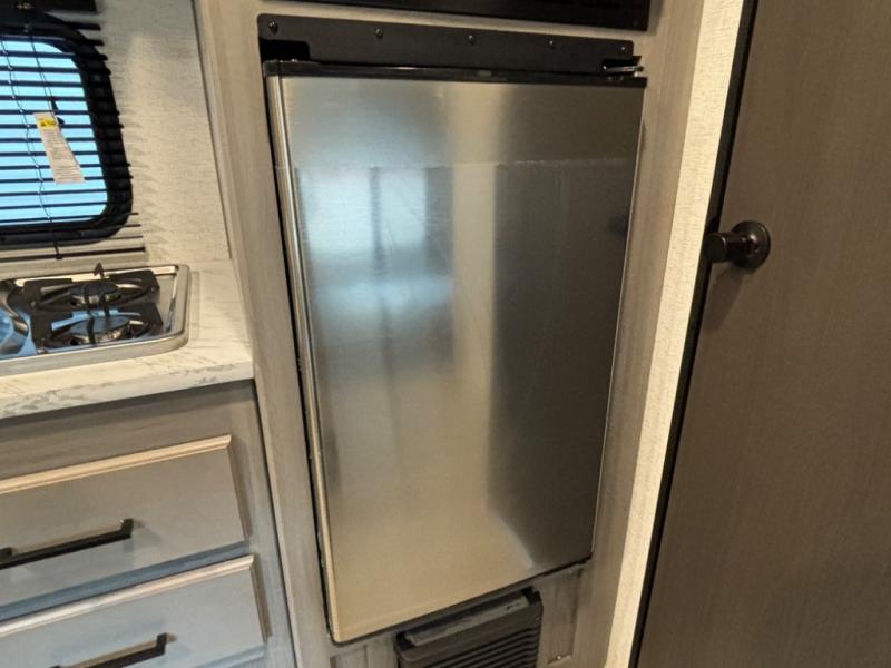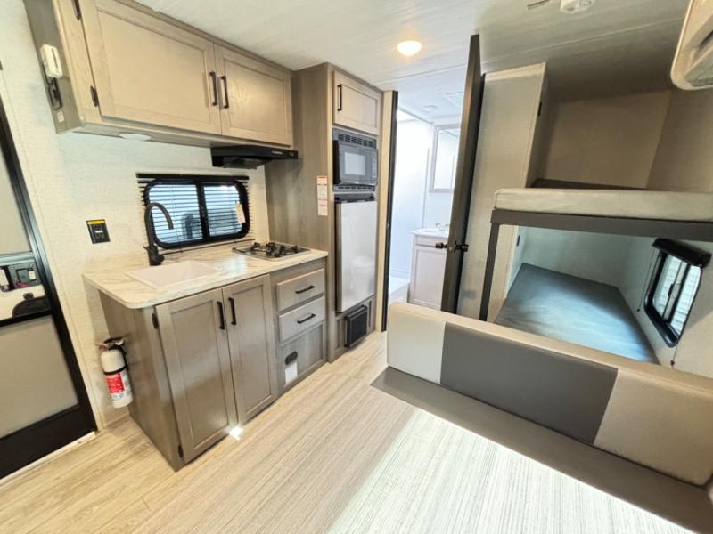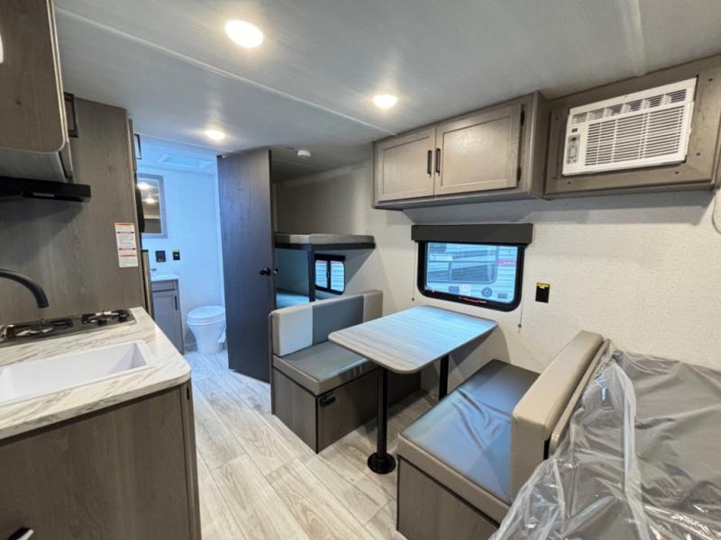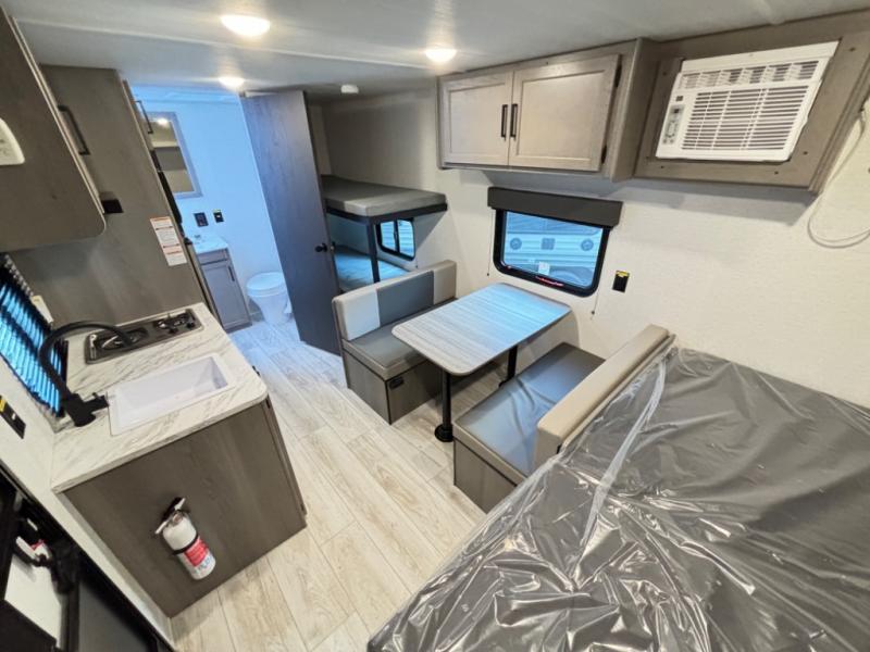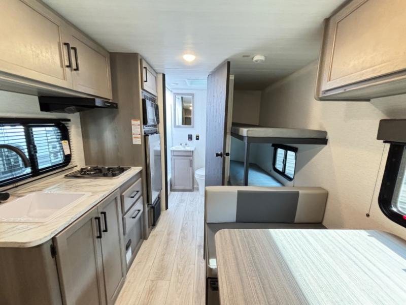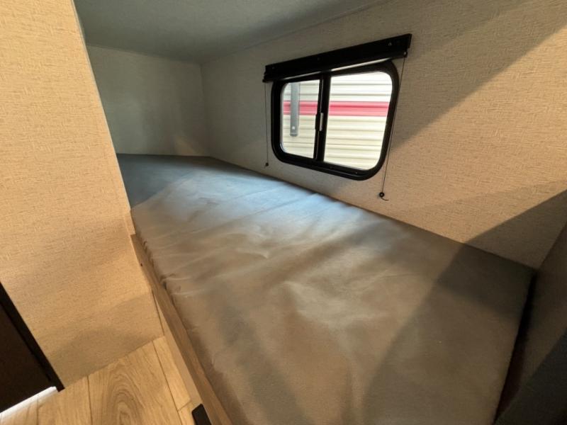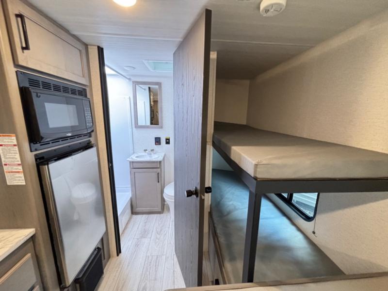 This compact travel trailer offers a smart layout designed for families or small groups seeking functionality and comfort on the road. With a private queen bed and rear corner bunk beds, everyone enjoys their own space. Ideal for travelers who want a lightweight, easy-to-tow RV that delivers practical features and memorable camping experiences.