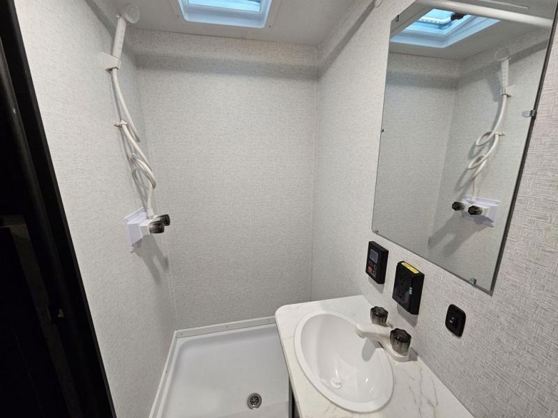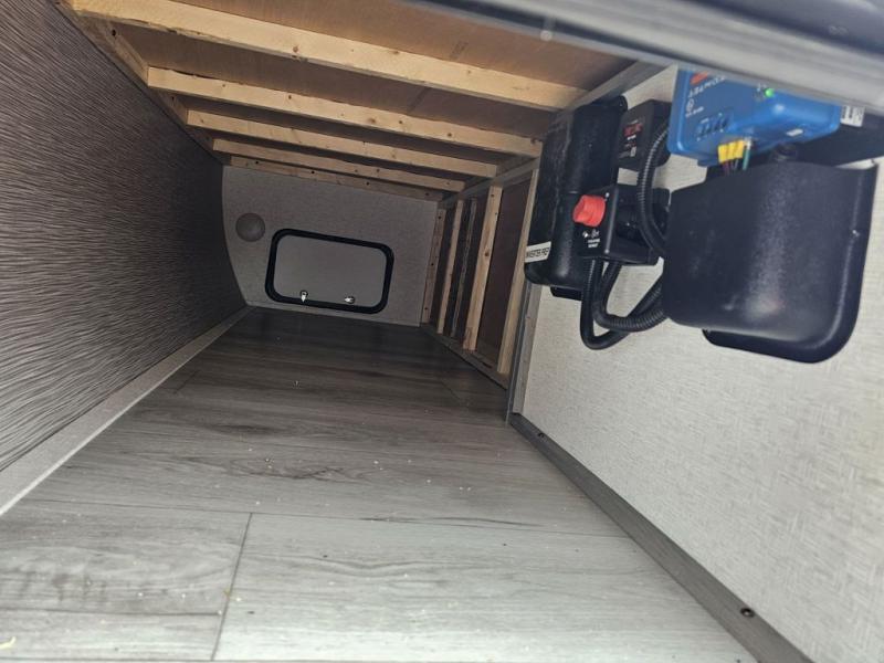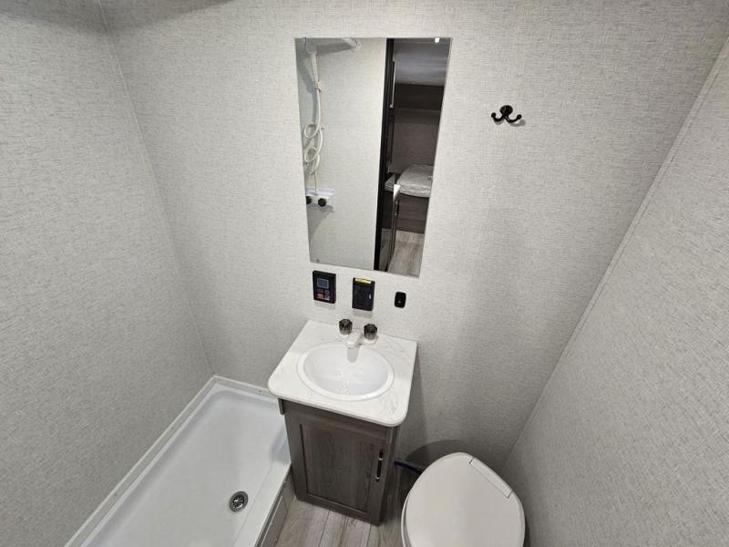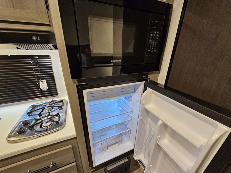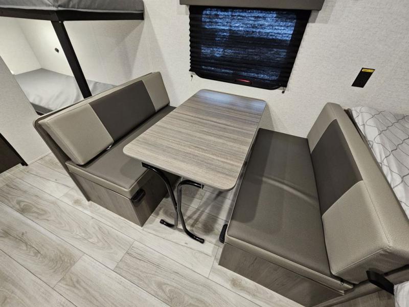 This trailer will fit perfectly for a group of five or less thanks to all the sleeping space! The owners will have a queen-size bed, and others can choose between the rear corner bunk beds or the booth dinette once set up for bedtime. There is a full bathroom for convenience when changing and getting cleaned up, a galley kitchen with a two burner cooktop plus a 3.3 cu. ft. refrigerator for the cold items. And you can stow your larger camping items in the exterior pass-through compartment.