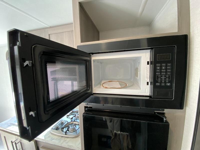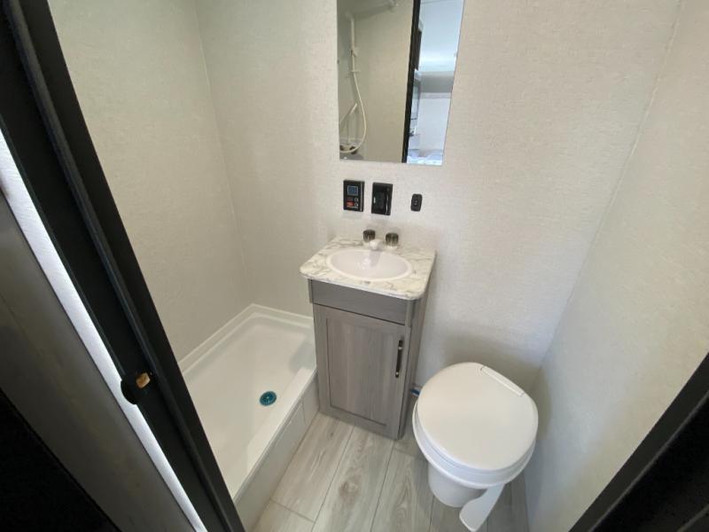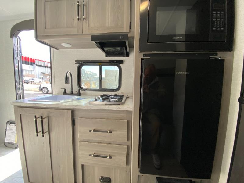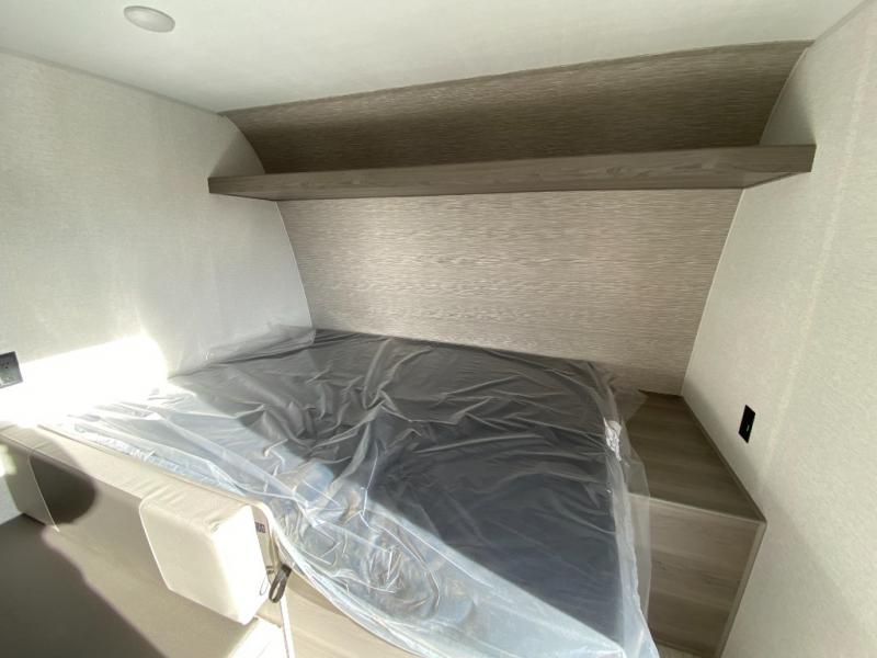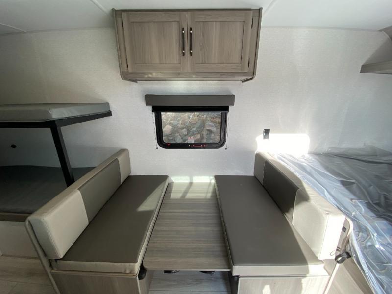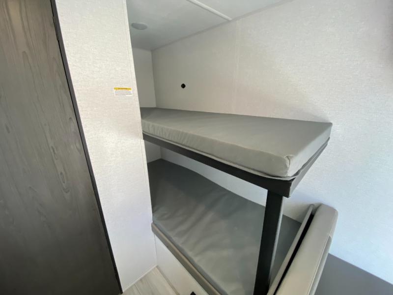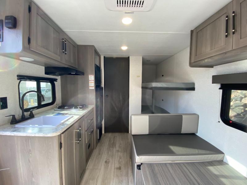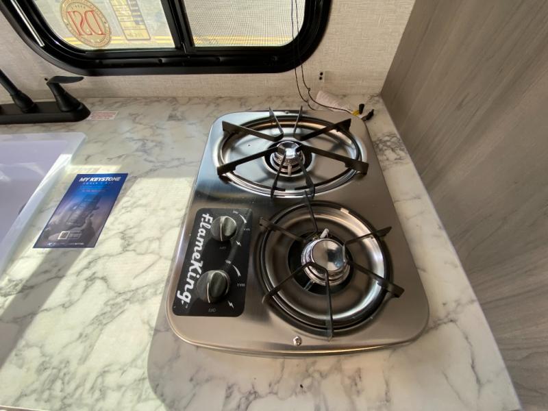 This trailer will fit perfectly for a group of five or less thanks to all the sleeping space! The owners will have a queen-size bed, and others can choose between the rear corner bunk beds or the booth dinette once set up for bedtime. There is a full bathroom for convenience when changing and getting cleaned up, a galley kitchen with a two burner cooktop plus a 3.3 cu. ft. refrigerator for the cold items. And you can stow your larger camping items in the exterior pass-through compartment.
