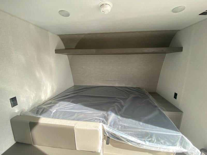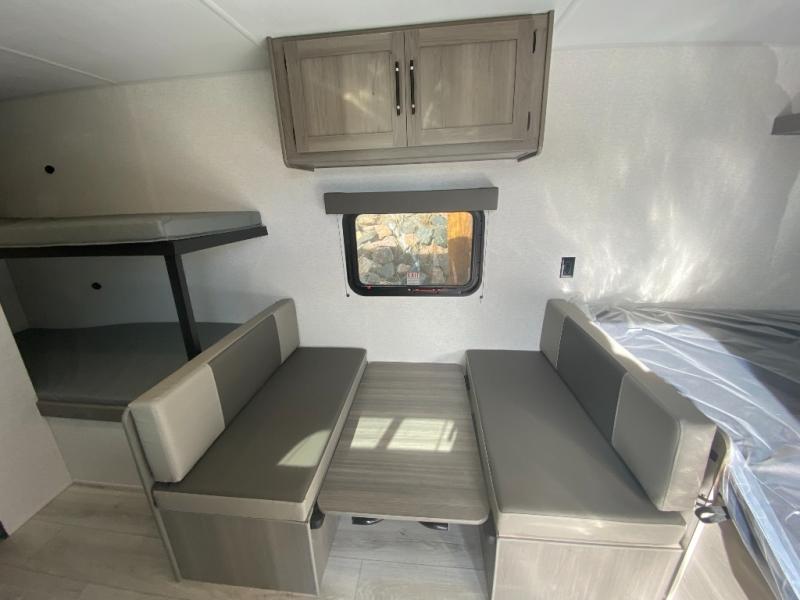 This trailer will fit perfectly for a group of five or less thanks to all the sleeping space! The owners will have a queen-size bed, and others can choose between the rear corner bunk beds or the booth dinette once set up for bedtime. There is a full bathroom for convenience when changing and getting cleaned up, a galley kitchen with a two burner cooktop plus a 3.3 cu. ft. refrigerator for the cold items. And you can stow your larger camping items in the exterior pass-through compartment.