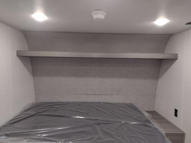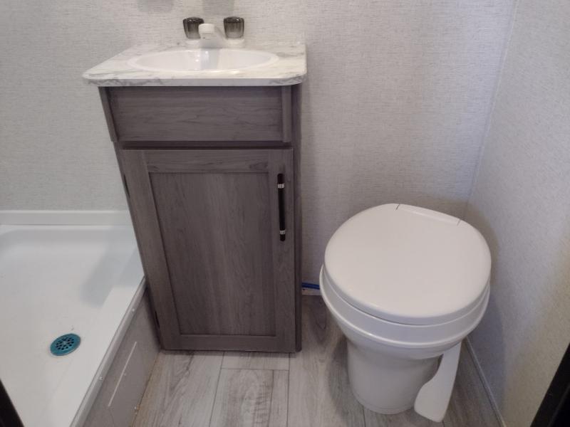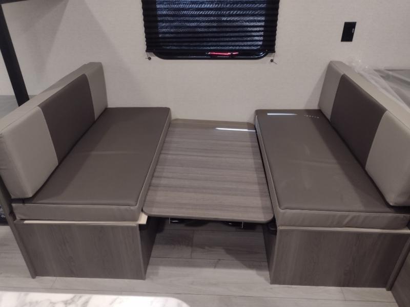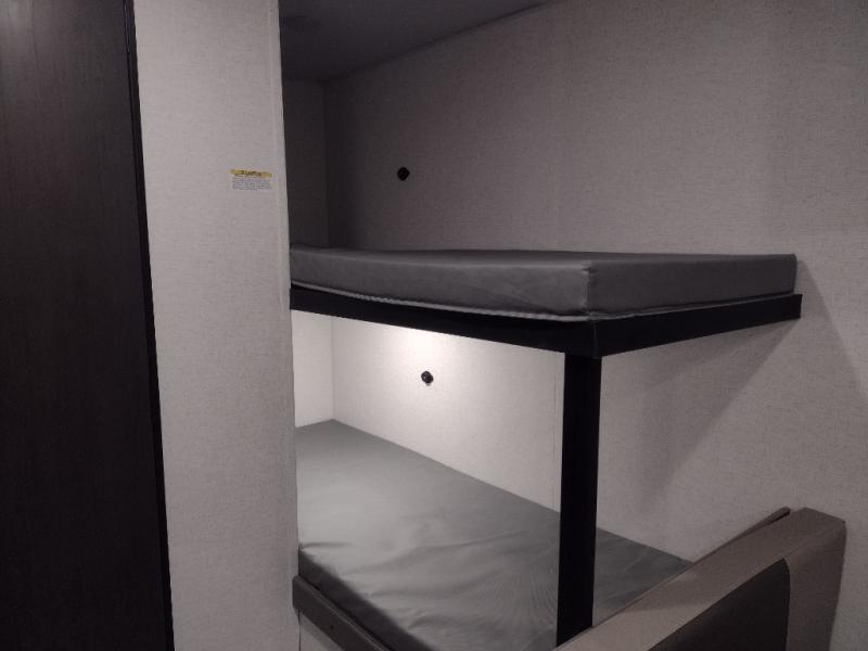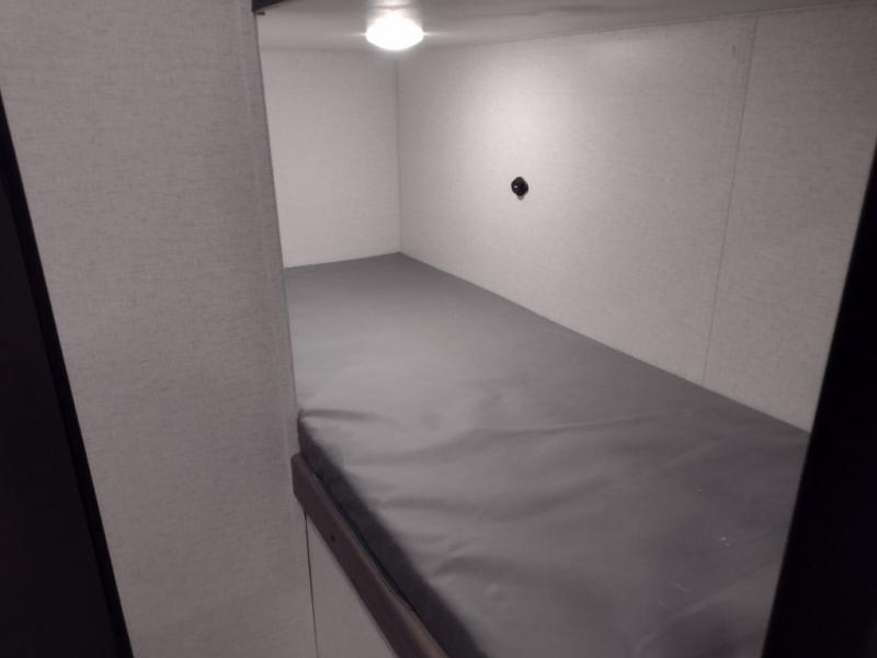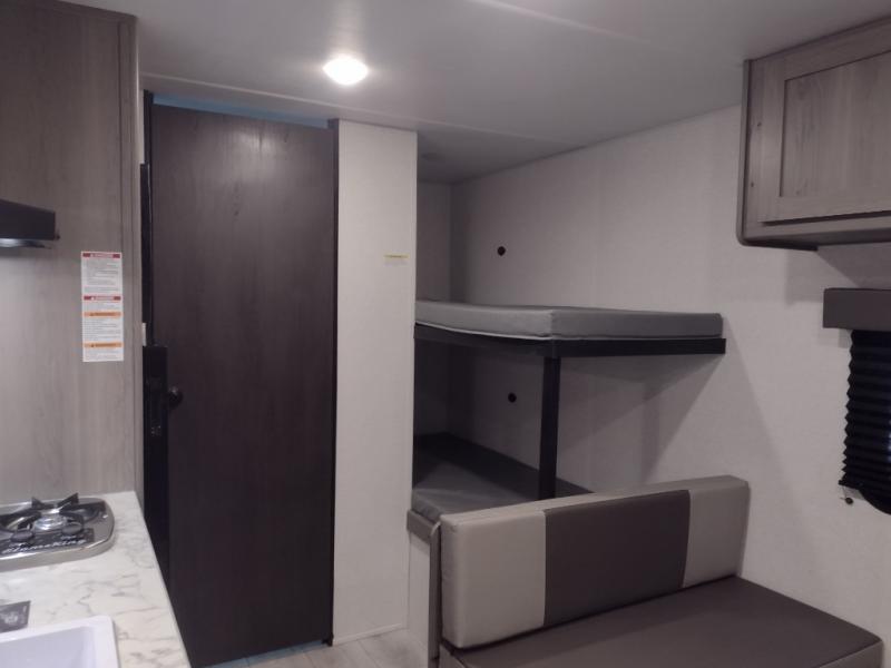 This trailer will fit perfectly for a group of five or less thanks to all the sleeping space! The owners will have a queen-size bed, and others can choose between the rear corner bunk beds or the booth dinette once set up for bedtime. There is a full bathroom for convenience when changing and getting cleaned up, a galley kitchen with a two burner cooktop plus a 3.3 cu. ft. refrigerator for the cold items. And you can stow your larger camping items in the exterior pass-through compartment.