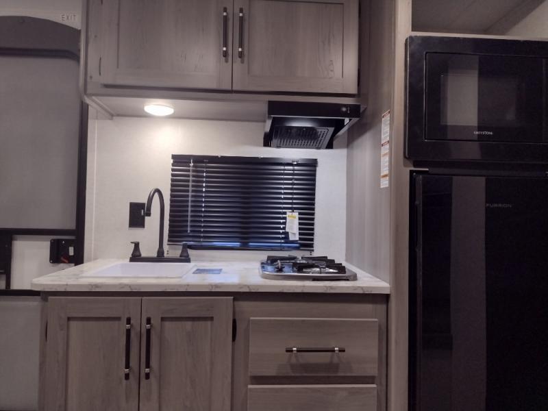 Open your horizons with the Hideout Sport Single Axle travel trailers by Keystone. They are compact, convenient, and lightweight; everything you're looking for in an RV! Each model features an aluminum exterior, tinted safety glass windows, and a Super Flex TPO roof membrane for added durability. The interior includes blackout night shades for added privacy and real wood doors and drawers that will give a more at-home touch. The Girard tankless water heater is a feature you won't want to camp without, and the LED lighting will keep your space bright and open!