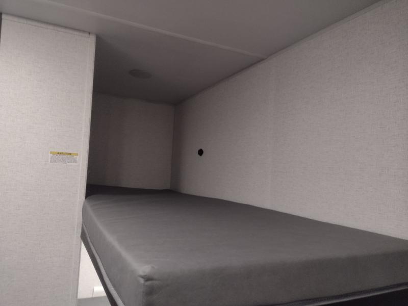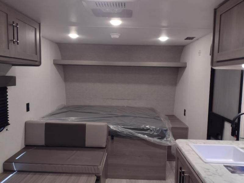 This trailer will fit perfectly for a group of five or less thanks to all the sleeping space! The owners will have a queen-size bed, and others can choose between the rear corner bunk beds or the booth dinette once set up for bedtime. There is a full bathroom for convenience when changing and getting cleaned up, a galley kitchen with a two burner cooktop plus a 3.3 cu. ft. refrigerator for the cold items. And you can stow your larger camping items in the exterior pass-through compartment.
