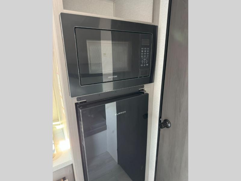 This trailer will fit perfectly for a group of five or less thanks to all the sleeping space! The owners will have a queen-size bed, and others can choose between the rear corner bunk beds or the booth dinette once set up for bedtime. There is a full bathroom for convenience when changing and getting cleaned up, a galley kitchen with a two burner cooktop plus a 3.3 cu. ft. refrigerator for the cold items. And you can stow your larger camping items in the exterior pass-through compartment.