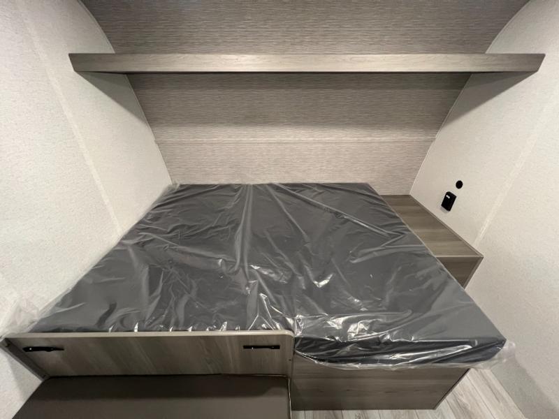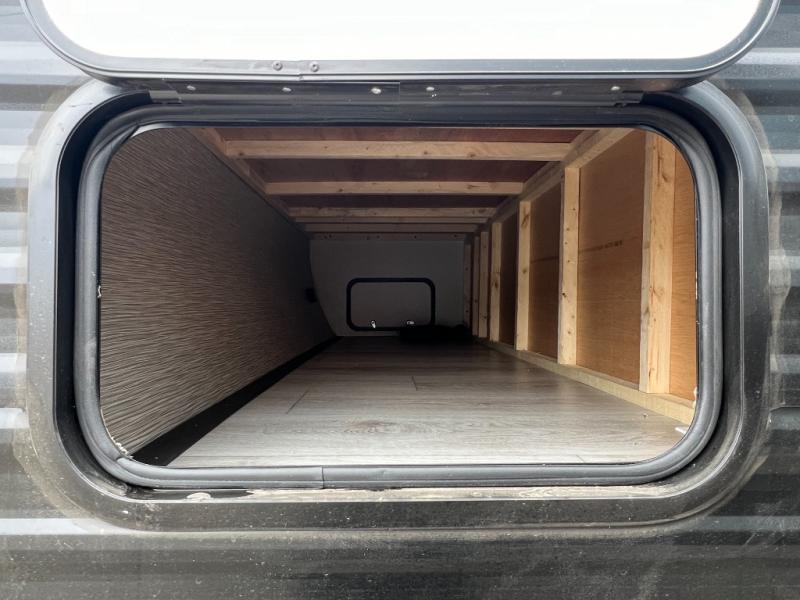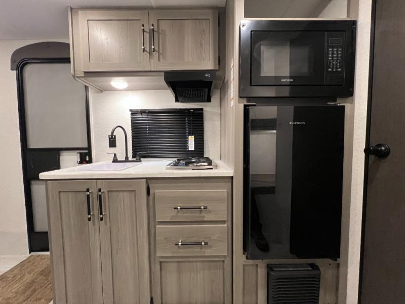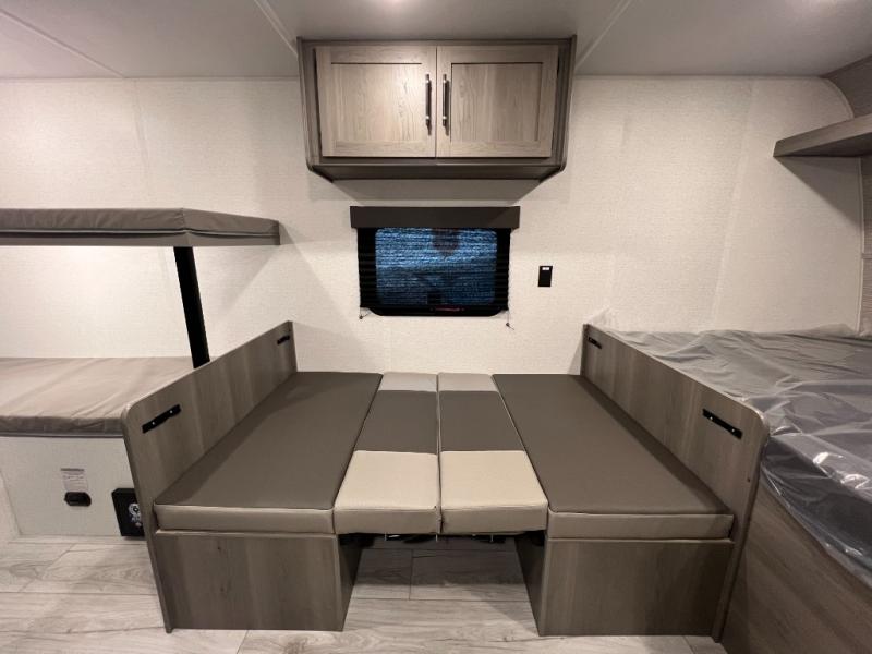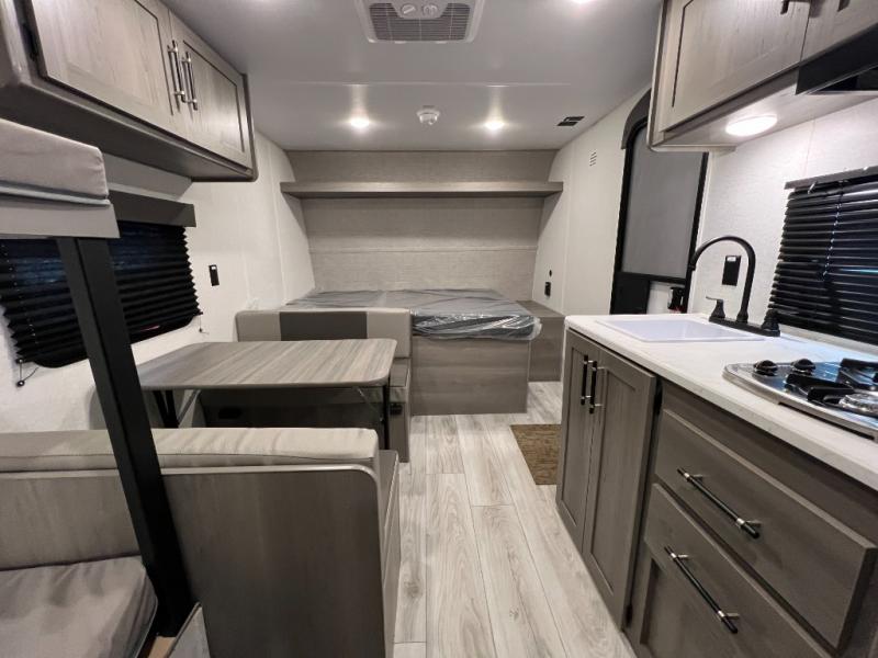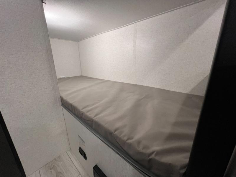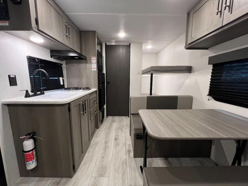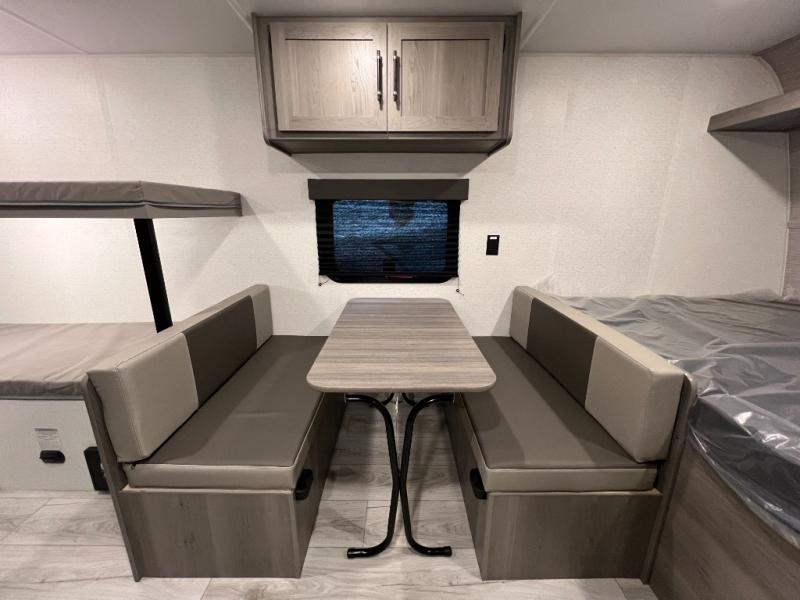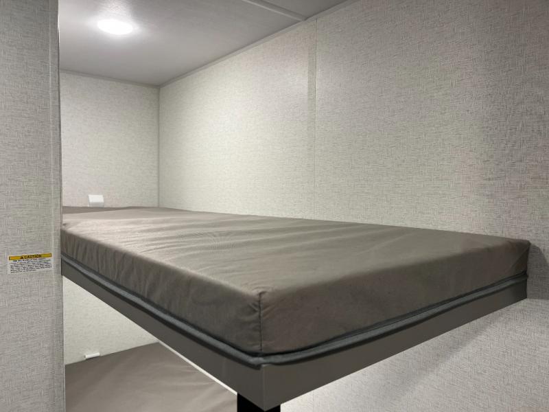 This trailer will fit perfectly for a group of five or less thanks to all the sleeping space! The owners will have a queen-size bed, and others can choose between the rear corner bunk beds or the booth dinette once set up for bedtime. There is a full bathroom for convenience when changing and getting cleaned up, a galley kitchen with a two burner cooktop plus a 3.3 cu. ft. refrigerator for the cold items. And you can stow your larger camping items in the exterior pass-through compartment.