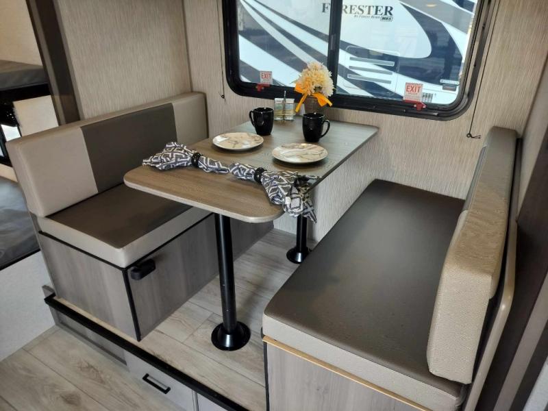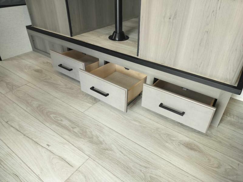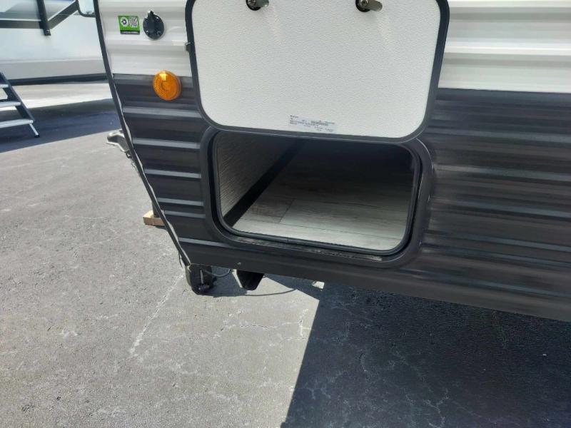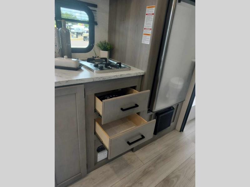 Step Inside this trailer where you can dine and relax on the slide out booth dinette which offers storage drawers below for your things. Everyone can take turns getting cleaned up in the full bathroom before falling asleep on the bunks, the queen-size bed or the booth dinette. The chef of your group will have a two burner cooktop to prepare meals and a 7.7 cu. ft. refrigerator for food storage. And the 10' power awning offers an outdoor living area protected from the elements once you add your camping chairs taken from the pass-through compartment.