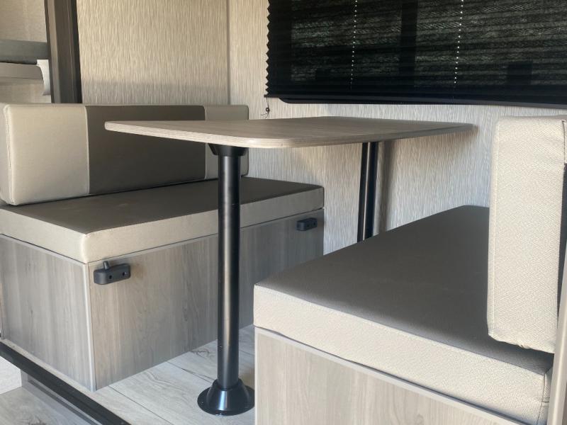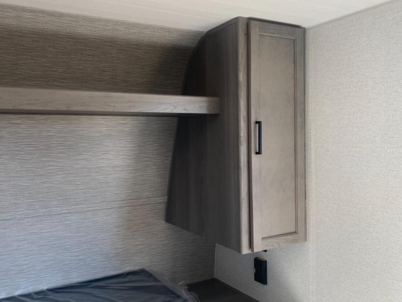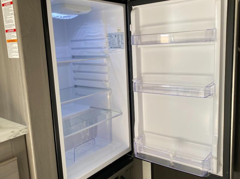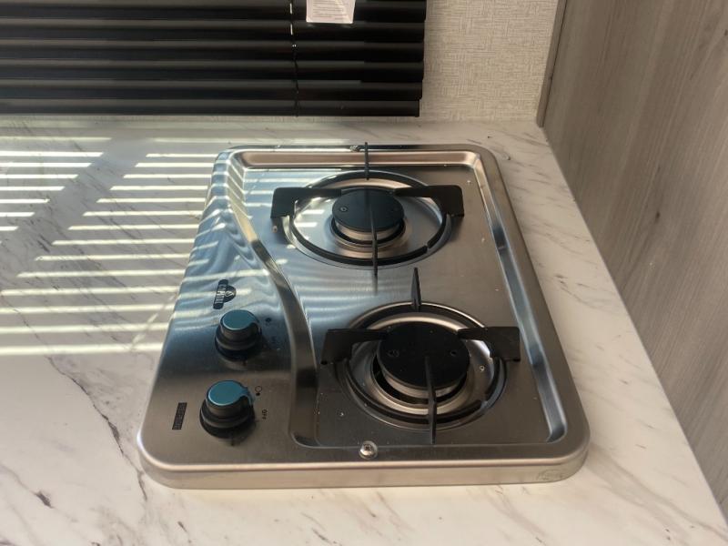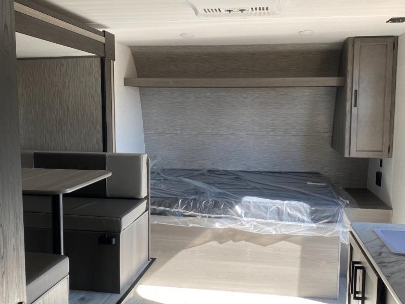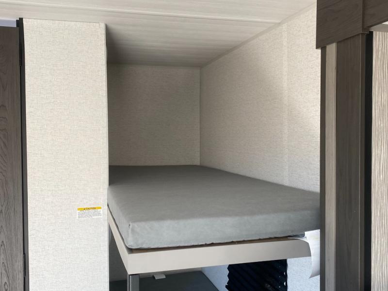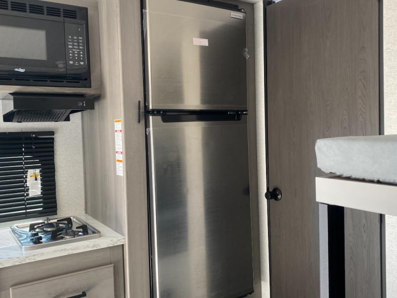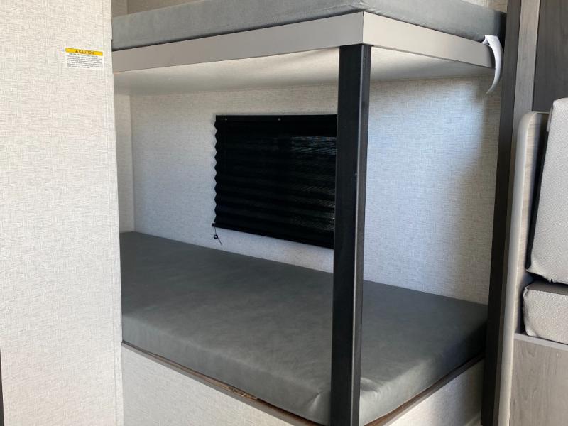 Step Inside this trailer where you can dine and relax on the slide out booth dinette which offers storage drawers below for your things. Everyone can take turns getting cleaned up in the full bathroom before falling asleep on the bunks, the queen-size bed or the booth dinette. The chef of your group will have a two burner cooktop to prepare meals and a 7.7 cu. ft. refrigerator for food storage. And the 10' power awning offers an outdoor living area protected from the elements once you add your camping chairs taken from the pass-through compartment.
