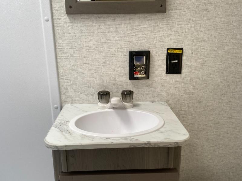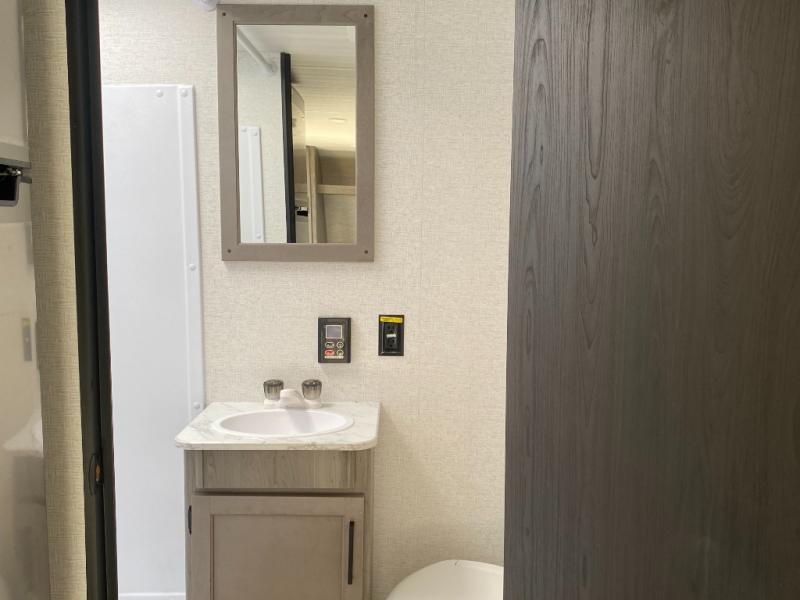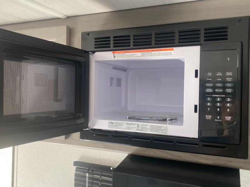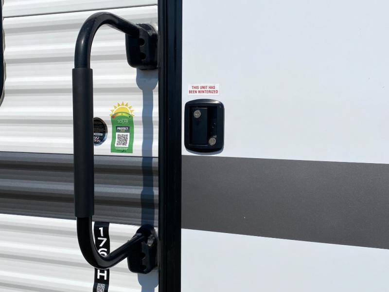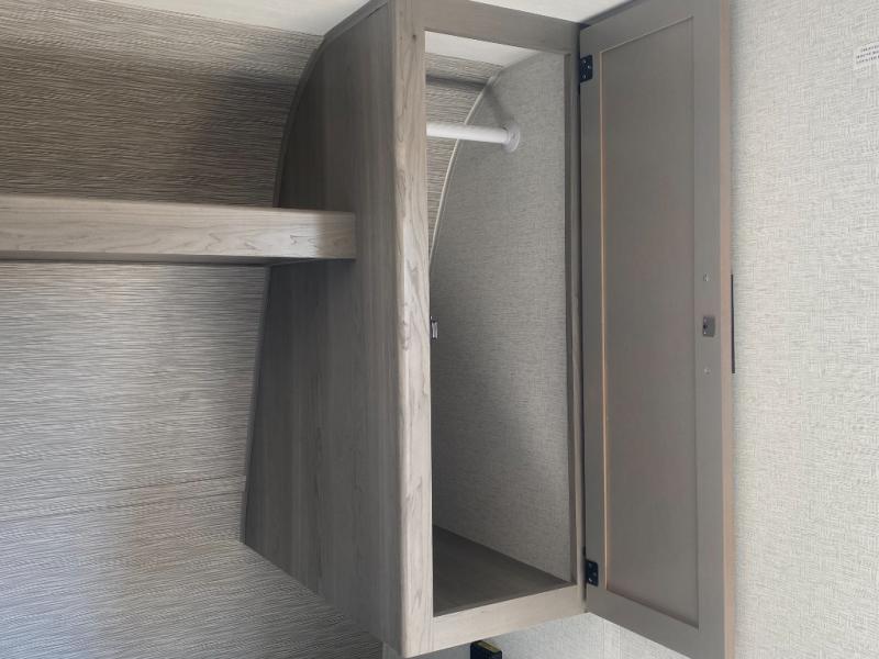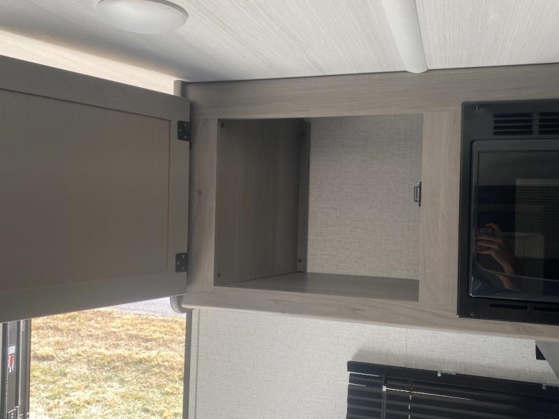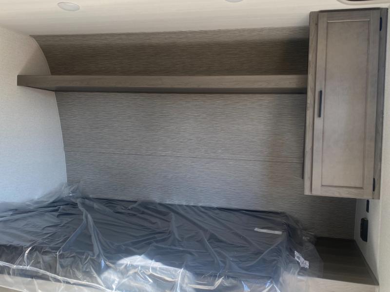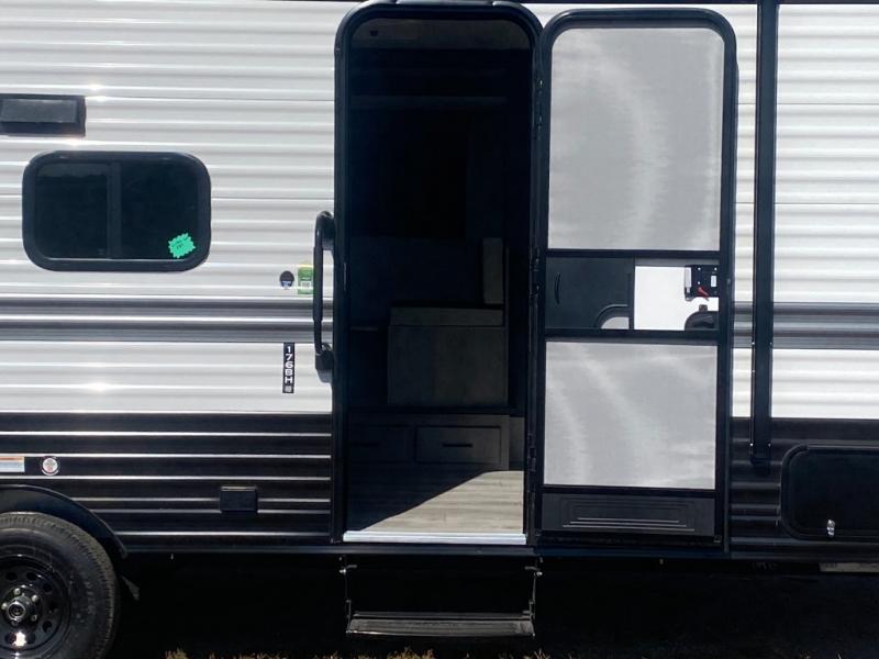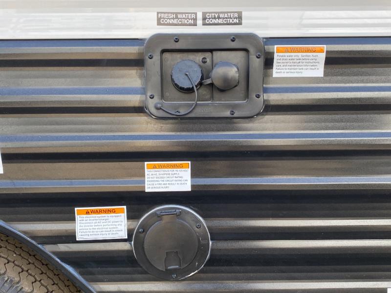 Step Inside this trailer where you can dine and relax on the slide out booth dinette which offers storage drawers below for your things. Everyone can take turns getting cleaned up in the full bathroom before falling asleep on the bunks, the queen-size bed or the booth dinette. The chef of your group will have a two burner cooktop to prepare meals and a 7.7 cu. ft. refrigerator for food storage. And the 10' power awning offers an outdoor living area protected from the elements once you add your camping chairs taken from the pass-through compartment.