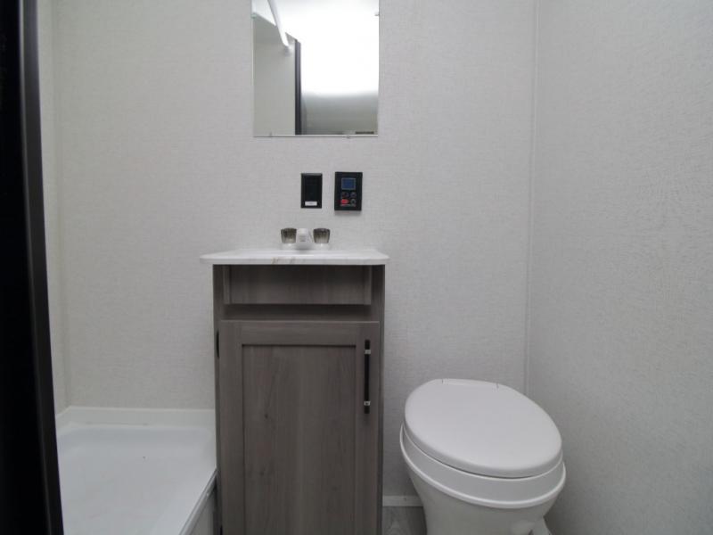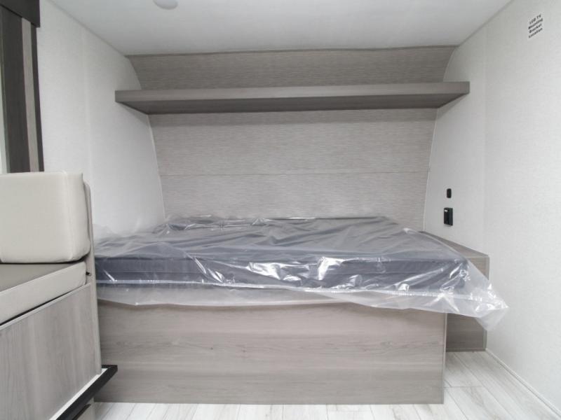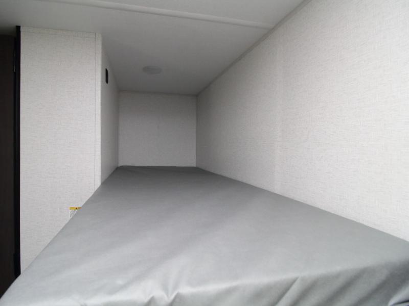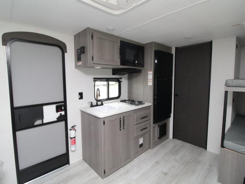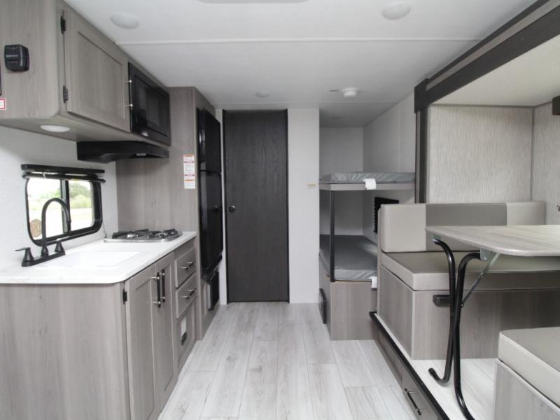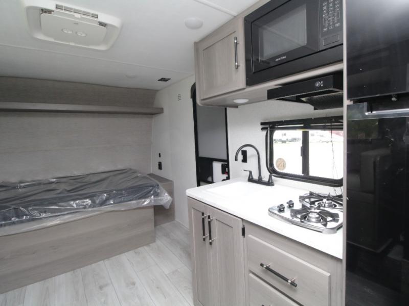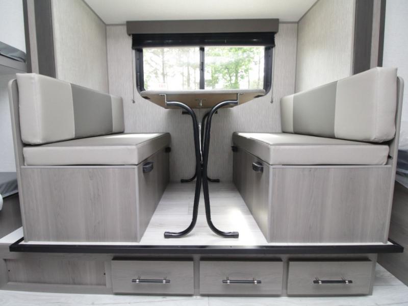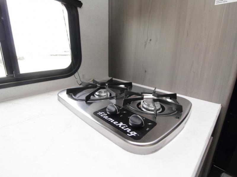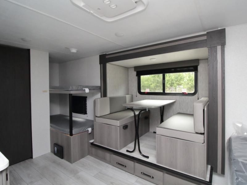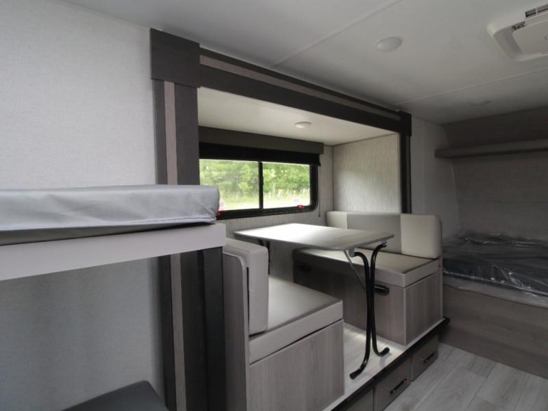 The slide-out booth dinette provides a roomy spot for meals, games, or relaxing—and includes built-in storage drawers to keep your essentials organized. After a day of exploring, the full bathroom offers a private space to freshen up, while the chef-friendly kitchen features a two-burner cooktop and a 7.7 cu. ft. refrigerator to store everything you need.