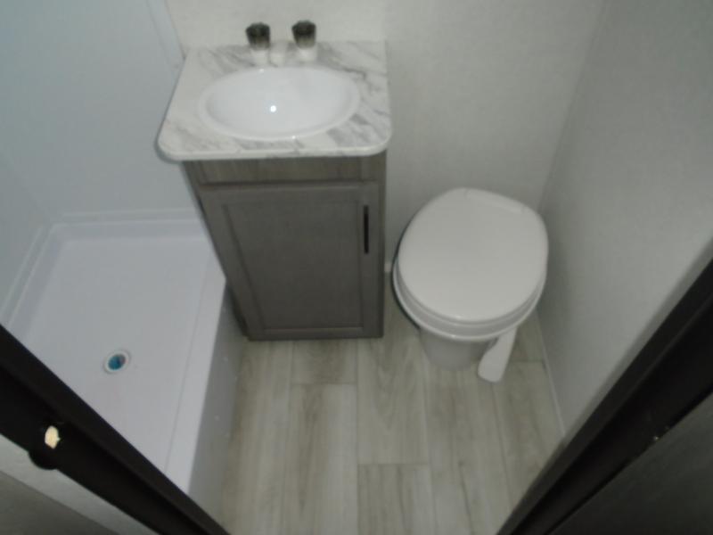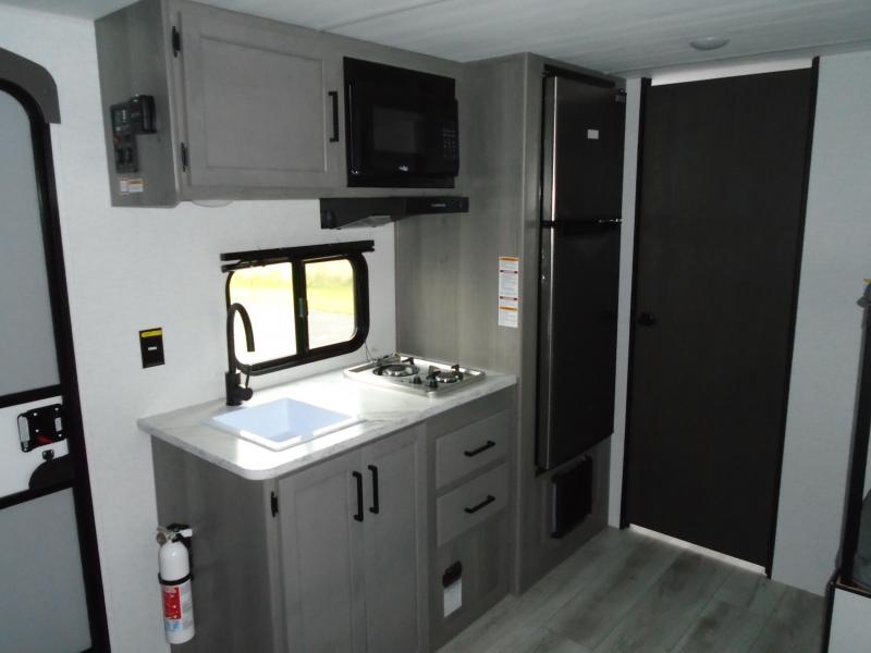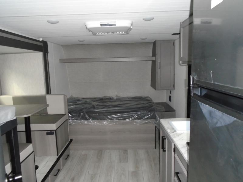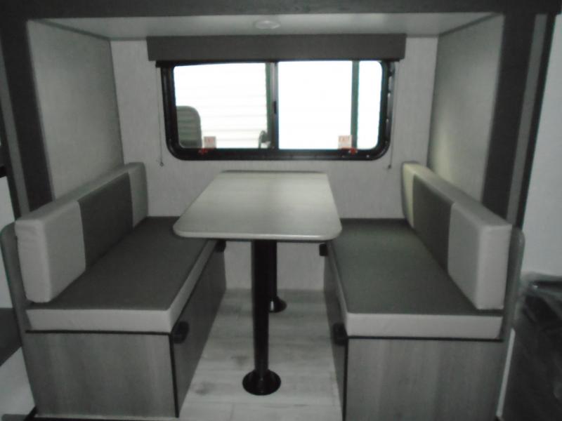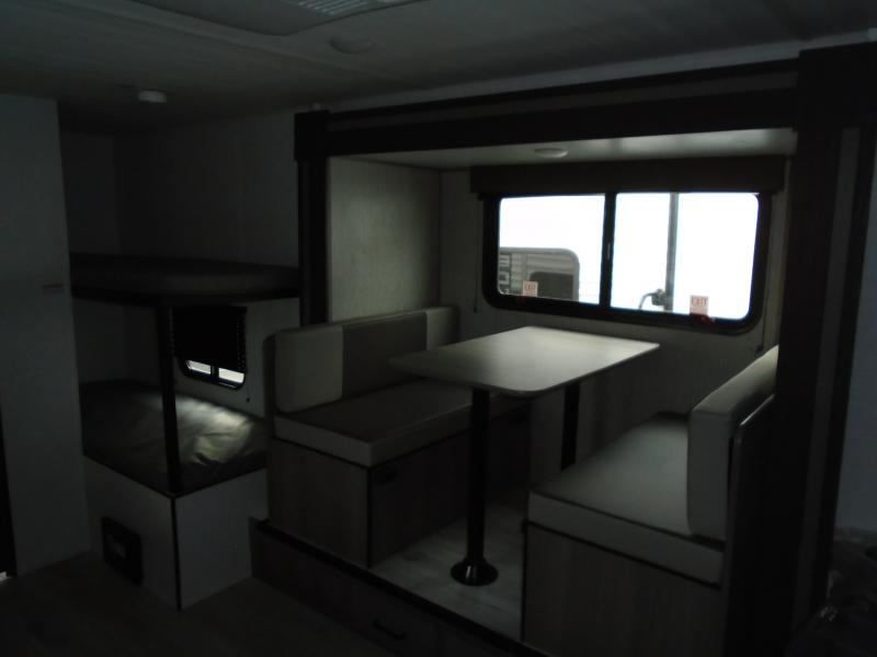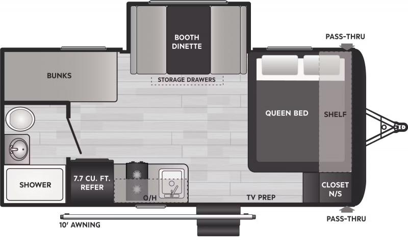 Step Inside this trailer where you can dine and relax on the slide out booth dinette which offers storage drawers below for your things. Everyone can take turns getting cleaned up in the full bathroom before falling asleep on the bunks, the queen-size bed or the booth dinette. The chef of your group will have a two burner cooktop to prepare meals and a 7.7 cu. ft. refrigerator for food storage. And the 10' power awning offers an outdoor living area protected from the elements once you add your camping chairs taken from the pass-through compartment.