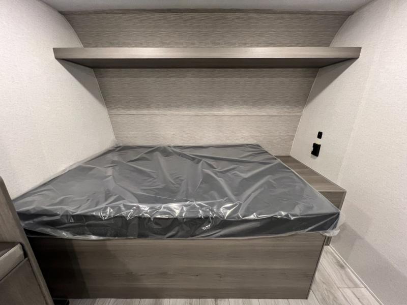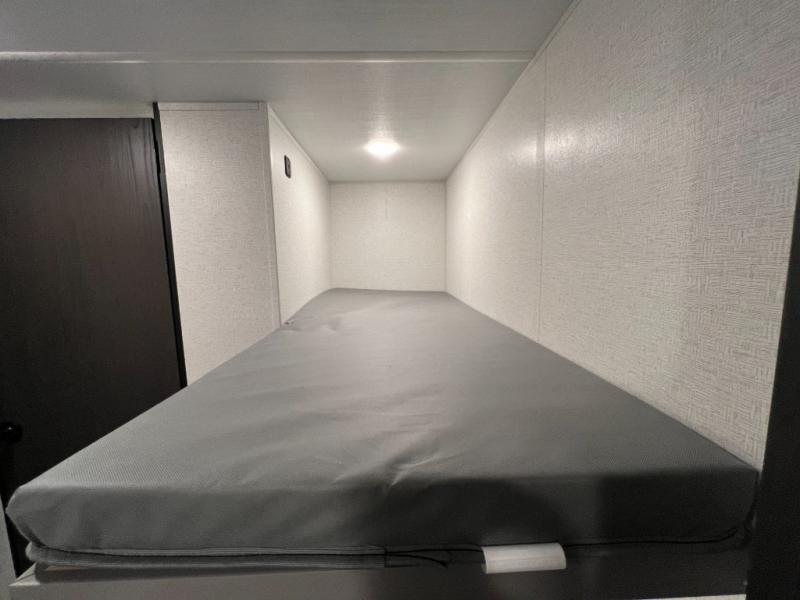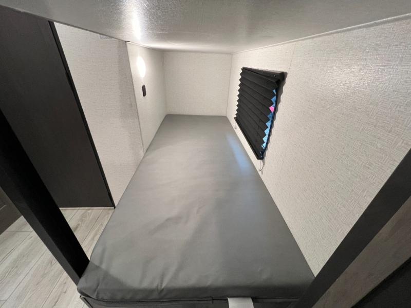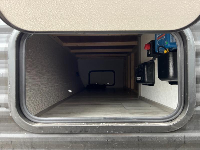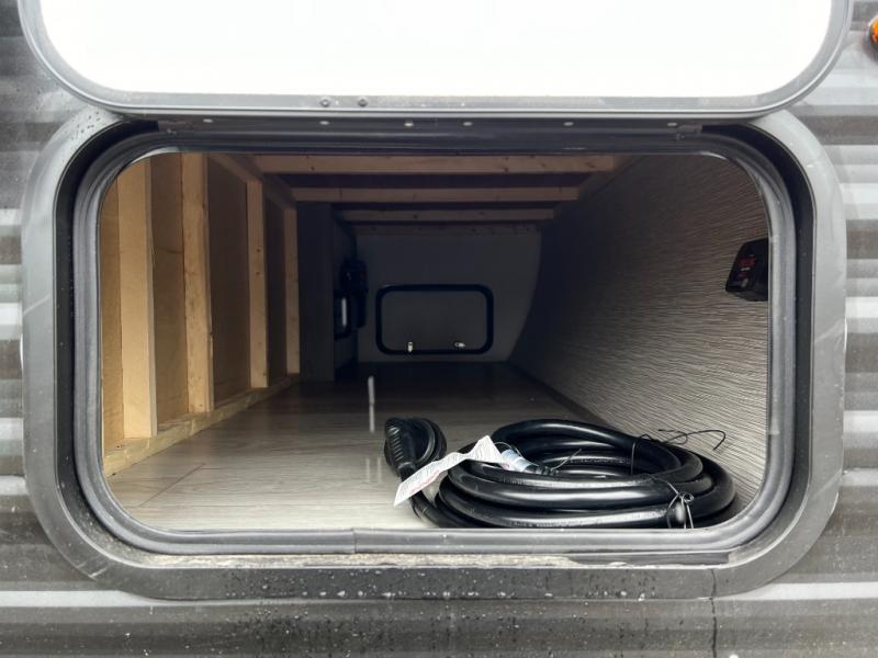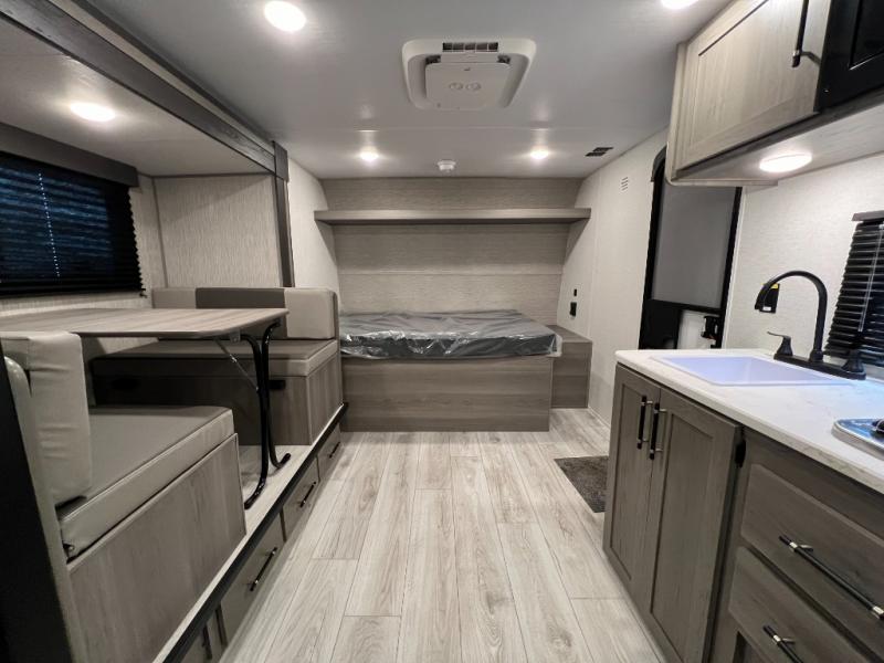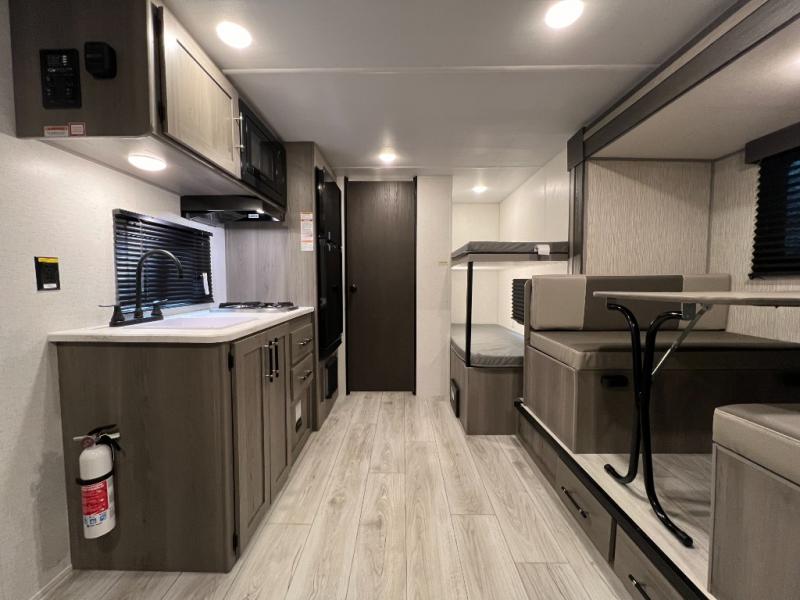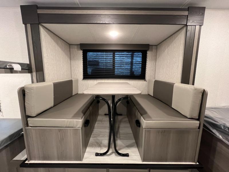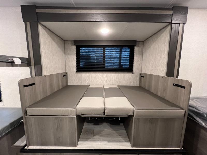Step Inside this trailer where you can dine and relax on the slide out booth dinette which offers storage drawers below for your things. Everyone can take turns getting cleaned up in the full bathroom before falling asleep on the bunks, the queen-size bed or the booth dinette. The chef of your group will have a two burner cooktop to prepare meals and a 7.7 cu. ft. refrigerator for food storage. And the 10' power awning offers an outdoor living area protected from the elements once you add your camping chairs taken from the pass-through compartment.