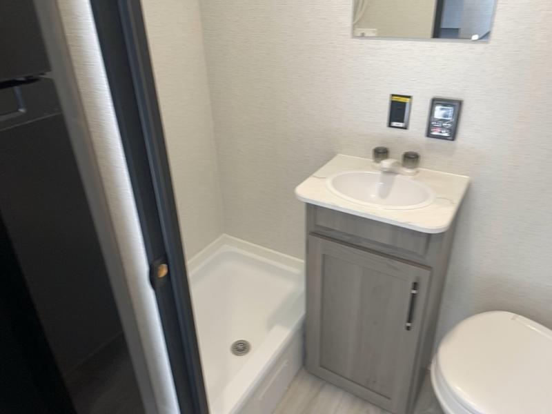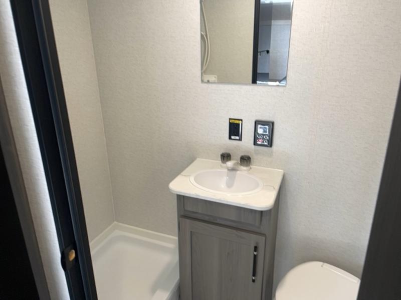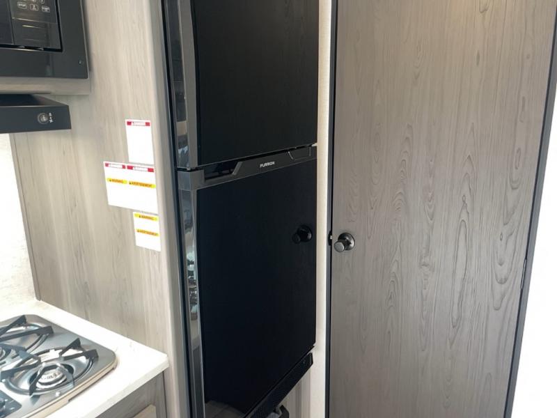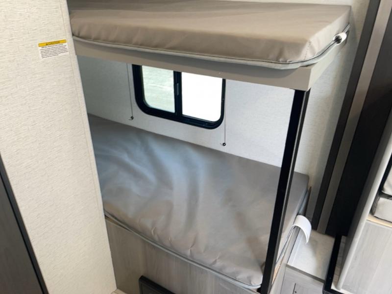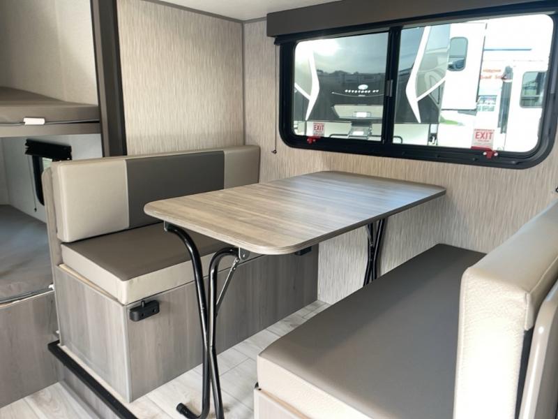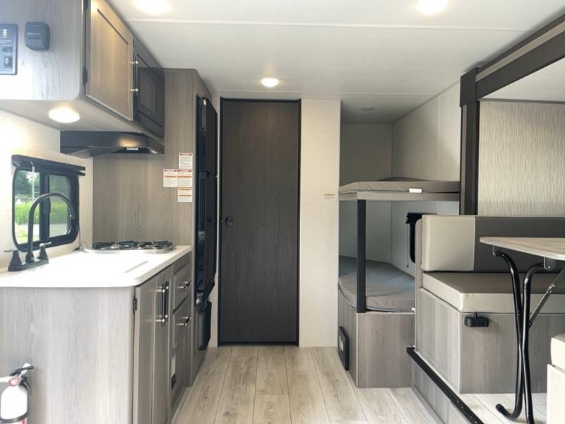 Step Inside this trailer where you can dine and relax on the slide out booth dinette which offers storage drawers below for your things. Everyone can take turns getting cleaned up in the full bathroom before falling asleep on the bunks, the queen-size bed or the booth dinette. The chef of your group will have a two burner cooktop to prepare meals and a 7.7 cu. ft. refrigerator for food storage. And the 10' power awning offers an outdoor living area protected from the elements once you add your camping chairs taken from the pass-through compartment.