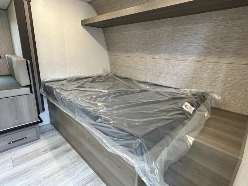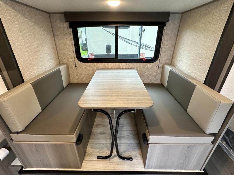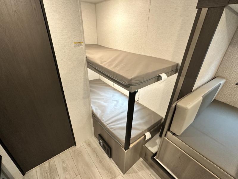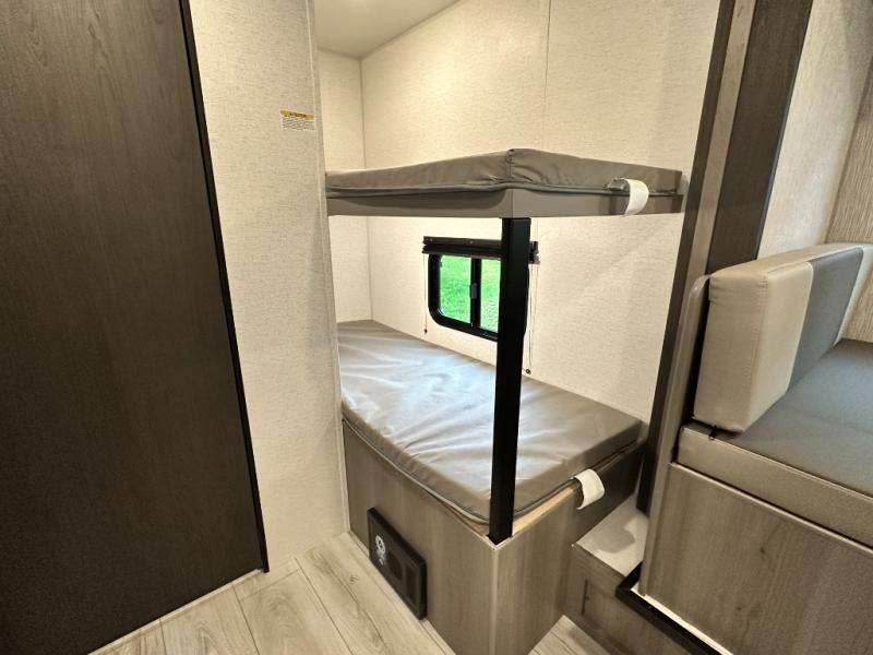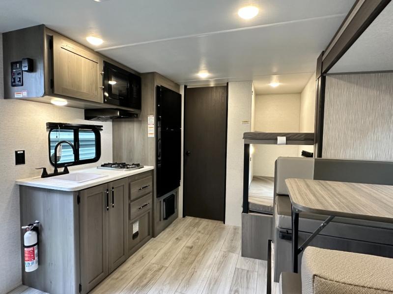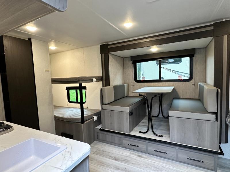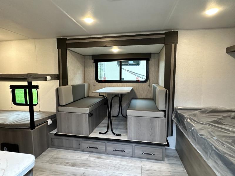 Step Inside this trailer where you can dine and relax on the slide out booth dinette which offers storage drawers below for your things. Everyone can take turns getting cleaned up in the full bathroom before falling asleep on the bunks, the queen-size bed or the booth dinette. The chef of your group will have a two burner cooktop to prepare meals and a 7.7 cu. ft. refrigerator for food storage. And the 10' power awning offers an outdoor living area protected from the elements once you add your camping chairs taken from the pass-through compartment.
