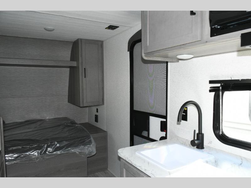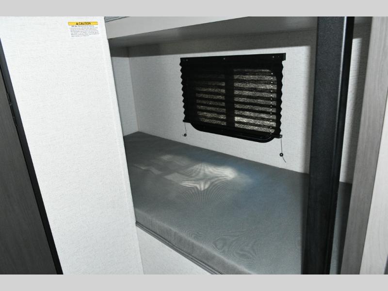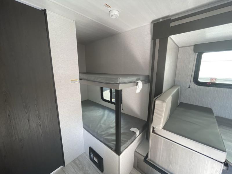 The moment you step inside, the booth dinette slide opens up the floorplan, giving you extra room to move, eat, and relax. Storage drawers beneath the dinette keep games, gear, and snacks organized, and at night this space converts into another sleeping area. The kids will love the stacked bunk beds, and parents get the comfort of a queen-size bed up front, making this trailer an ideal setup for families wanting more adventure without the bulk of a bigger rig.