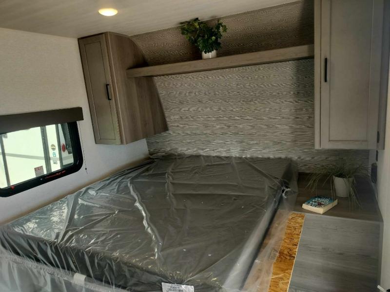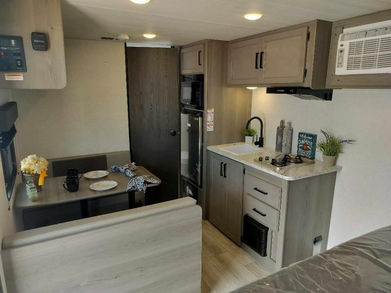 It's time to enjoy the great outdoors with family and friends at the campgrounds you like to meet everyone at! This trailer will allow three to four to camp comfortability with amenities such as a two burner cooktop, a 3.3 cu. ft. refrigerator, and a spacious rear full bathroom. The booth dinette offers a place to dine, read a book and even house an overnight guest. This model also includes a walk-around queen bed that will make your space feel a little more like home!