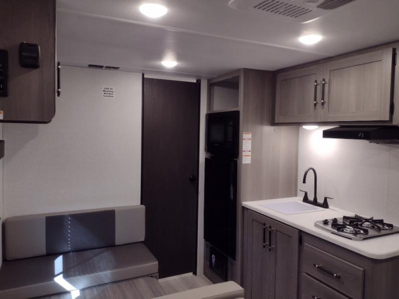It's time to enjoy the great outdoors with family and friends at the campgrounds you like to meet everyone at! This trailer will allow three to four to camp comfortability with amenities such as a two burner cooktop, a 3.3 cu. ft. refrigerator, and a spacious rear full bathroom. The booth dinette offers a place to dine, read a book and even house an overnight guest. This model also includes a walk-around queen bed that will make your space feel a little more like home!
