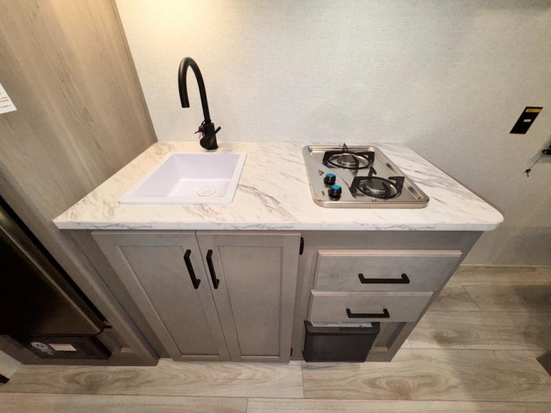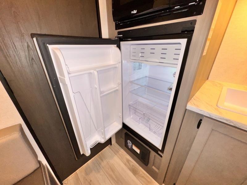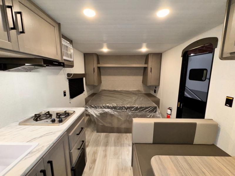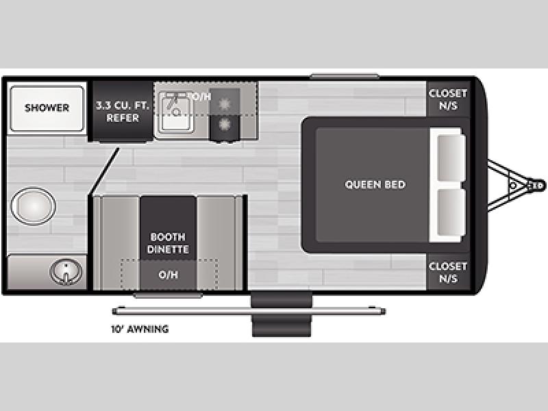 It's time to enjoy the great outdoors with family and friends at the campgrounds you like to meet everyone at! This trailer will allow three to four to camp comfortability with amenities such as a two burner cooktop, a 3.3 cu. ft. refrigerator, and a spacious rear full bathroom. The booth dinette offers a place to dine, read a book and even house an overnight guest. This model also includes a walk-around queen bed that will make your space feel a little more like home!
