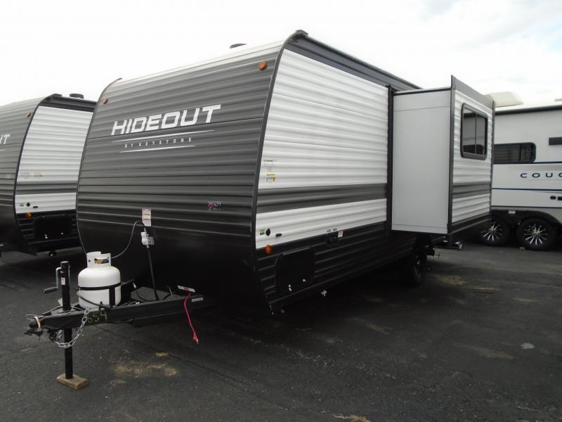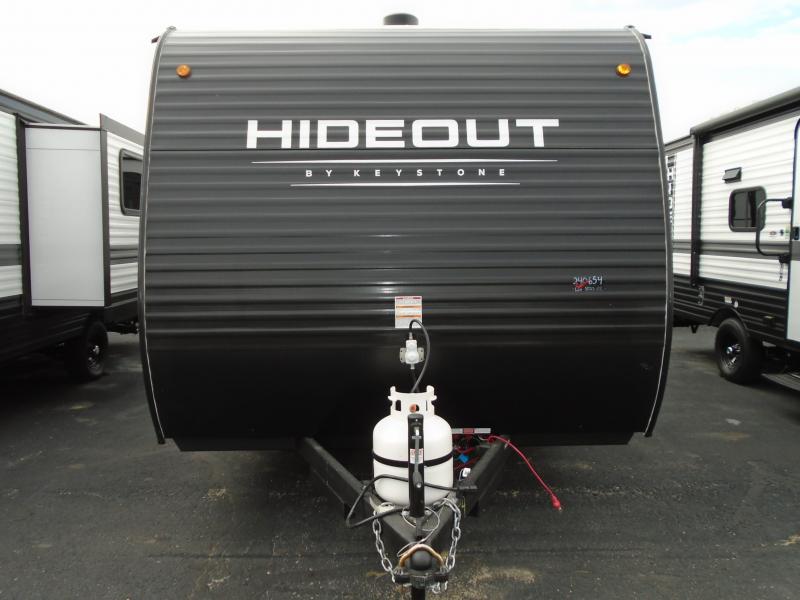 Open your horizons with the Hideout Sport Single Axle travel trailers by Keystone. They are compact, convenient, and lightweight; everything you're looking for in an RV! Each model features an aluminum exterior, tinted safety glass windows, and a Super Flex TPO roof membrane for added durability. The interior includes blackout night shades for added privacy and solid wood doors and drawers that will give a more at-home touch. The Girard tankless water heater is a feature you won't want to camp without, and the LED lighting will keep your space bright and open!
