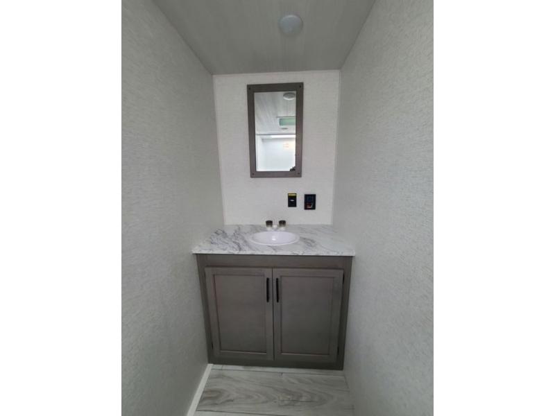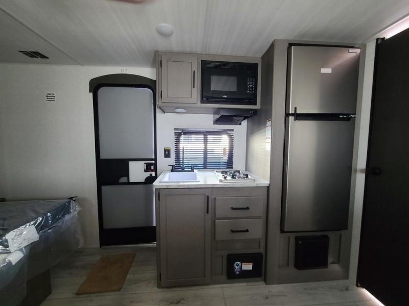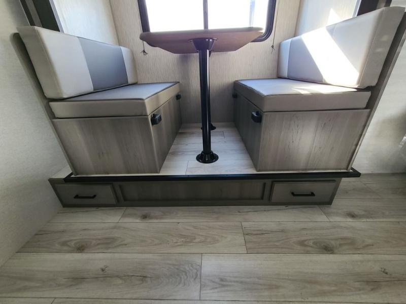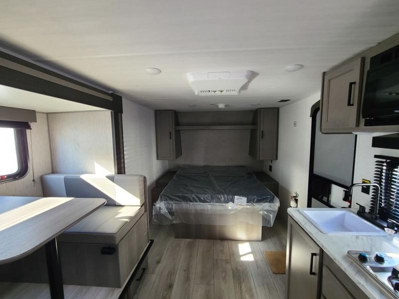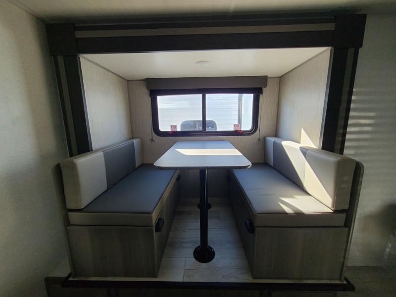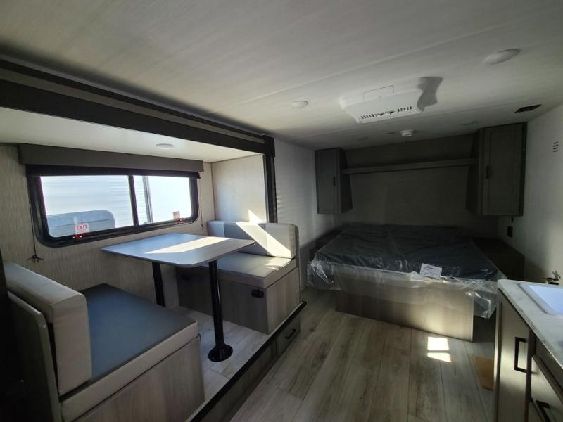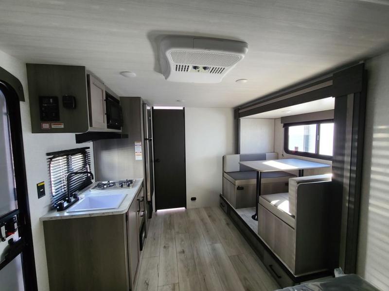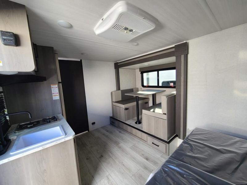 It's time to enjoy the great outdoors with family and friends at the campgrounds you like to meet everyone at! This trailer will allow three to four to camp comfortability with amenities such as a two burner cooktop, a 7.7 cu. ft. refrigerator, and a spacious rear full bathroom. The booth dinette slide offers a place to dine, read a book and even provides sleeping space and storage drawers for board games or throw blankets. The slide gives the interior more floor space as well. This model also includes a walk-around queen bed that will make your space feel a little more like home!